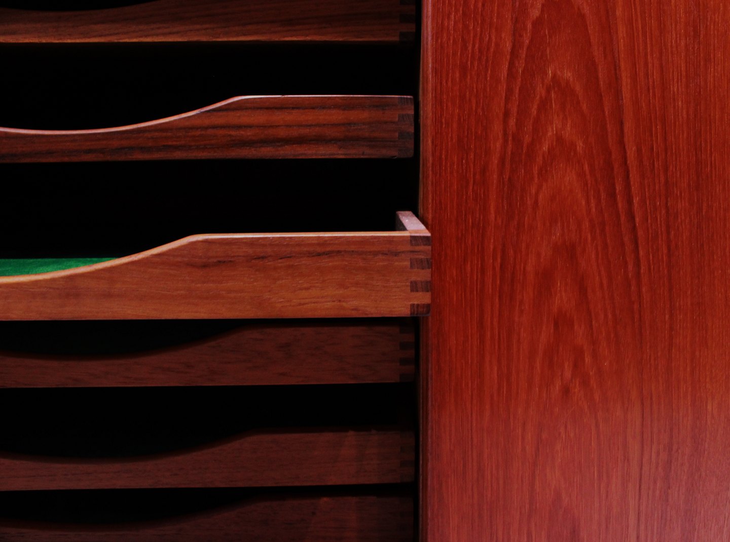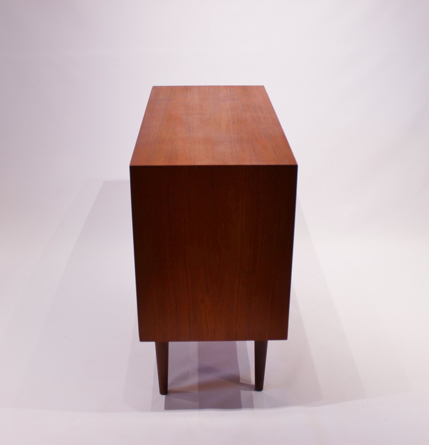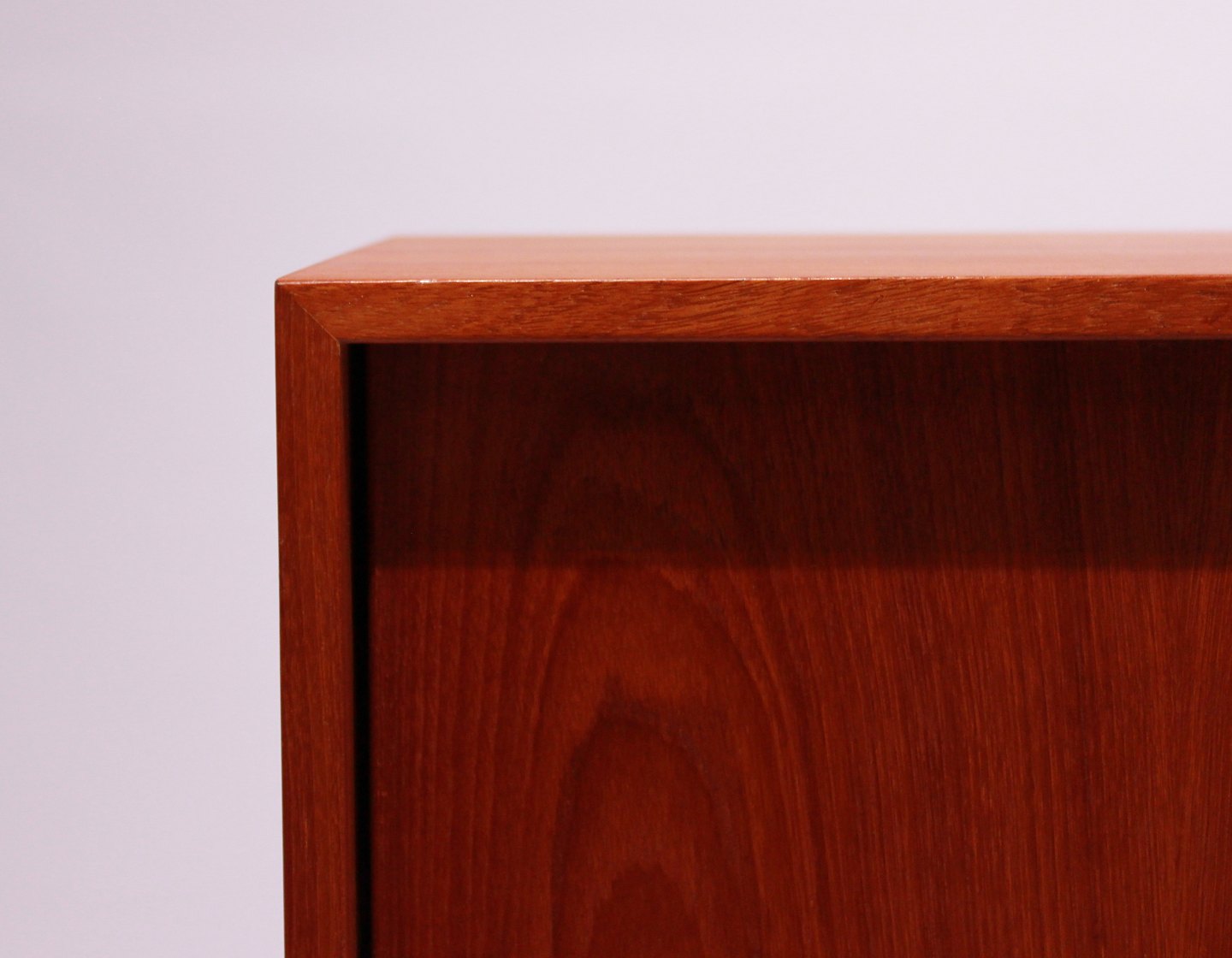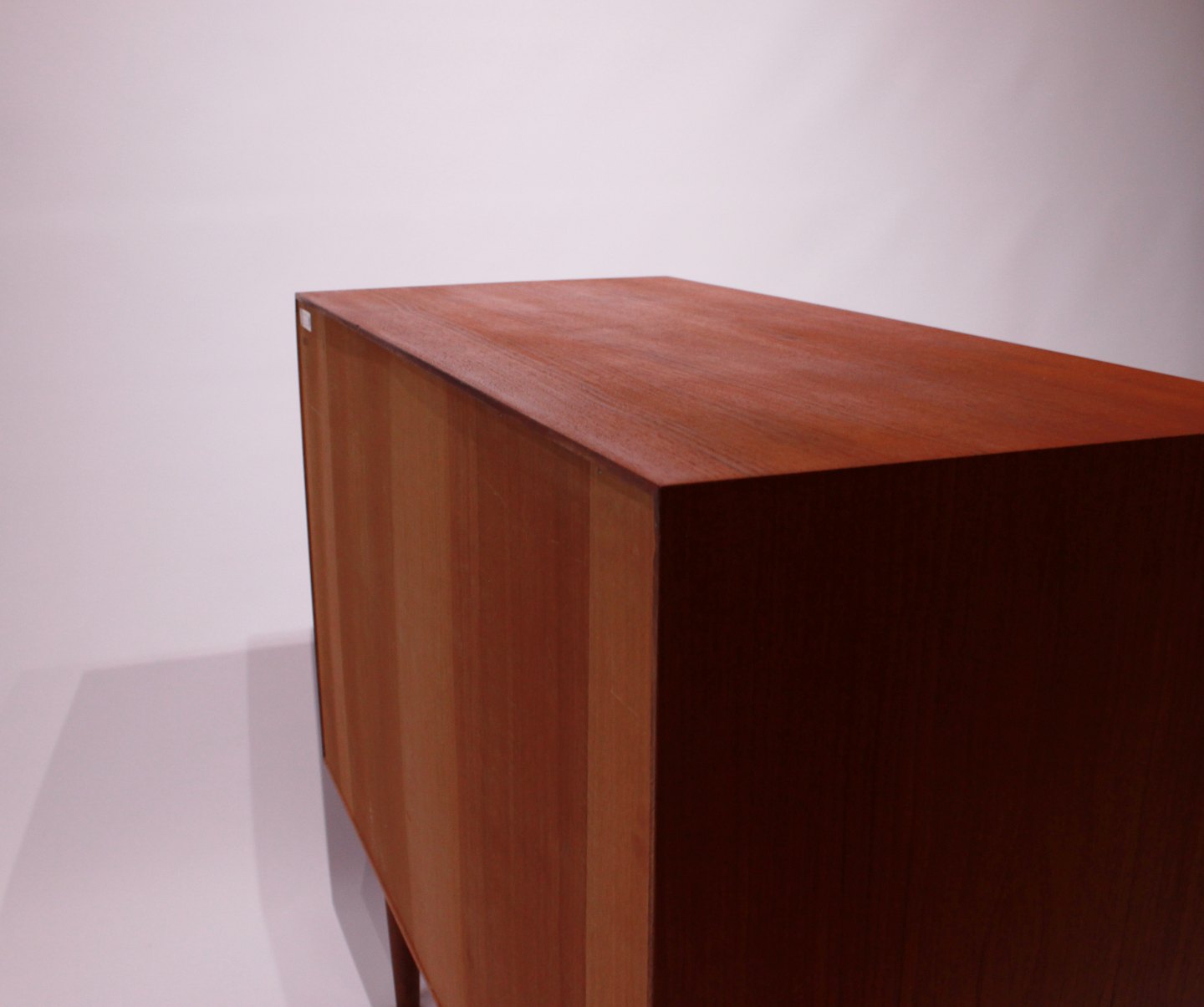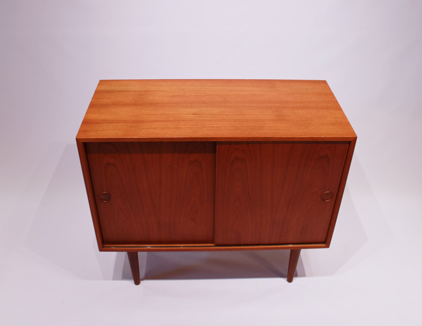 SolgtEnkel skænk i teak med skydelåger og hylder fremstillet af FM Møbler i 1960erne og af dansk design.