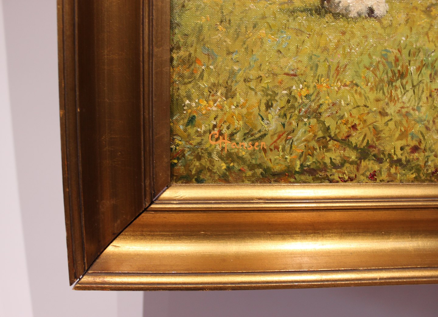 SoldOil painting with countryside motif signed C. Hansen. The painting is in great vintage condition with gilded frame.