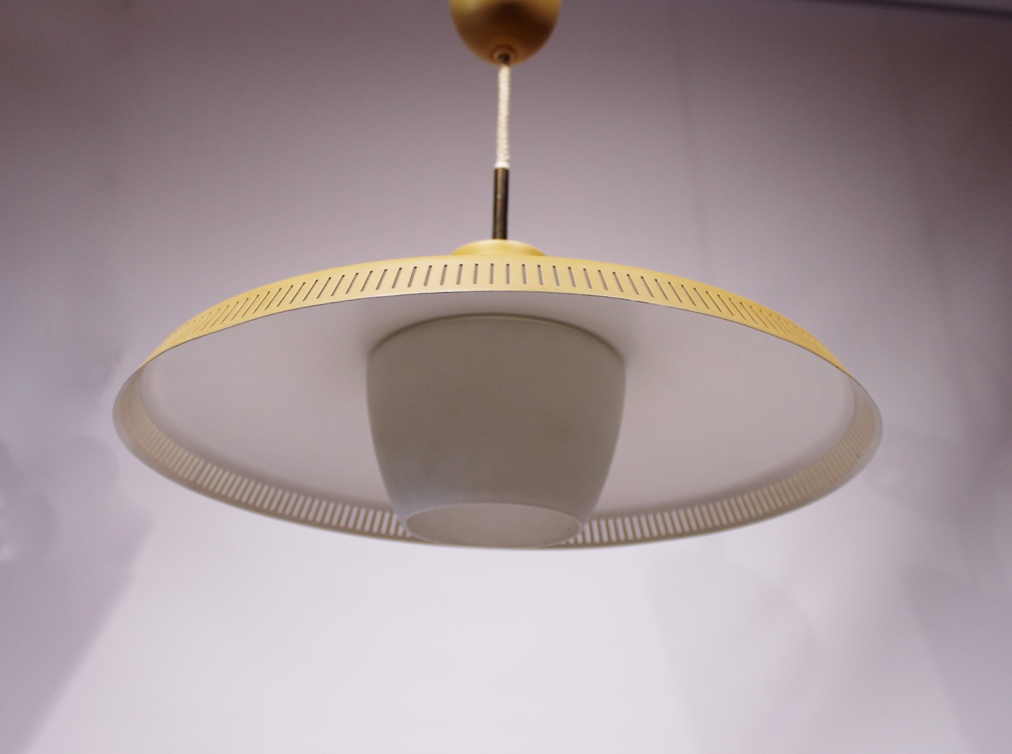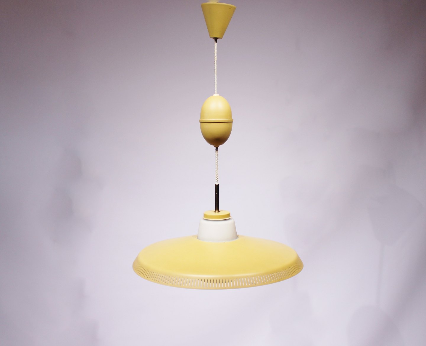 Yellow pendant, model P415, designed by Bent Karlby and manufactured by Lyfa in the 1960s. The lamp is in great vintage condition from the 1960s.