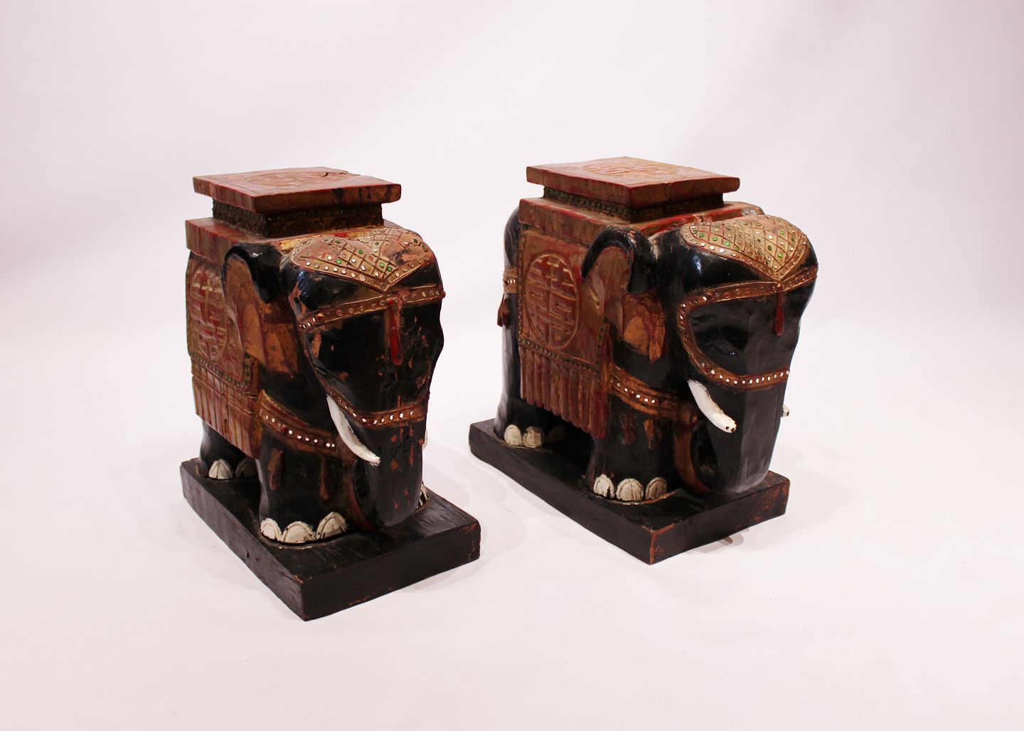 SoldA pair of chinese elephants in original painted wood and with patina from around the 1880s. The elephants are suitable as lamp/coffee table or other decoration.