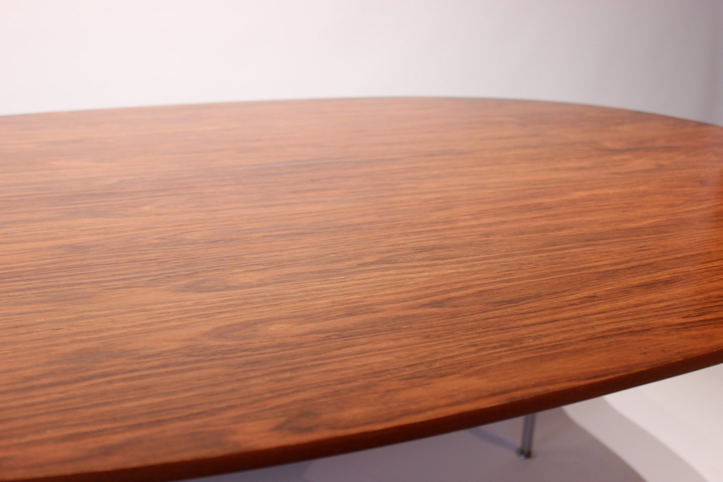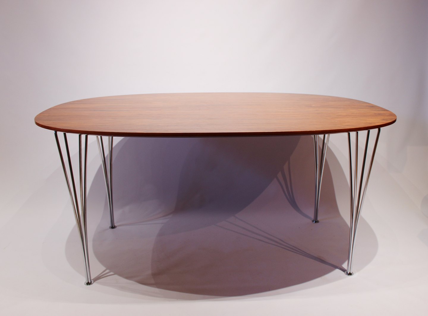 SoldSuper Ellipse table in rosewood designed by Piet Hein, Arne Jacobsen and Bruno Mathsson in 1968 and manufactured by Fritz Hansen in 1983. The table is in great vintage condition and with legs of chrome.