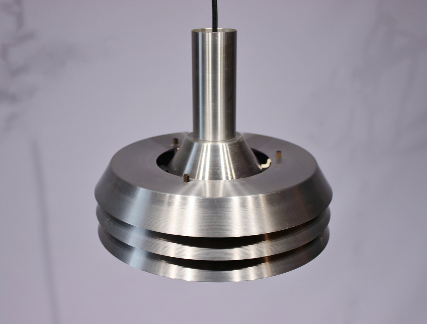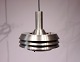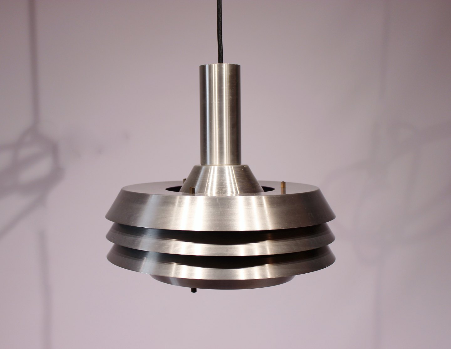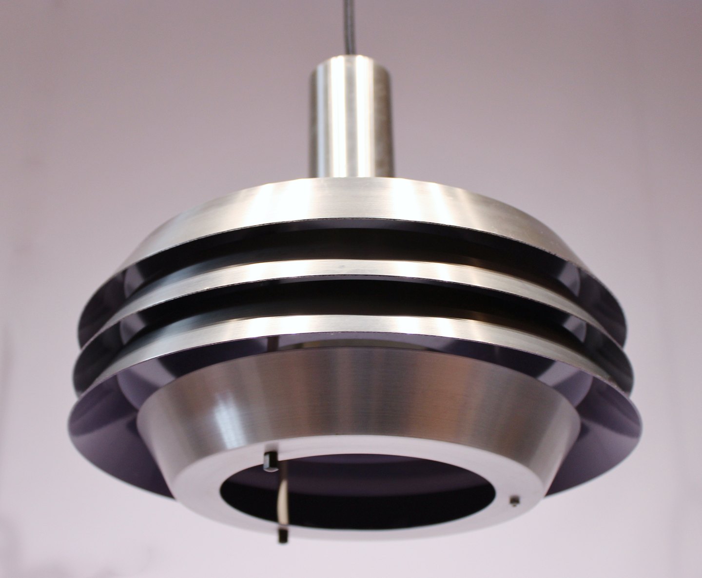 Set of 3 pendants with metal shades and lacquered purple on the inside manufactured by Lyskær of danish design from the 1960s.