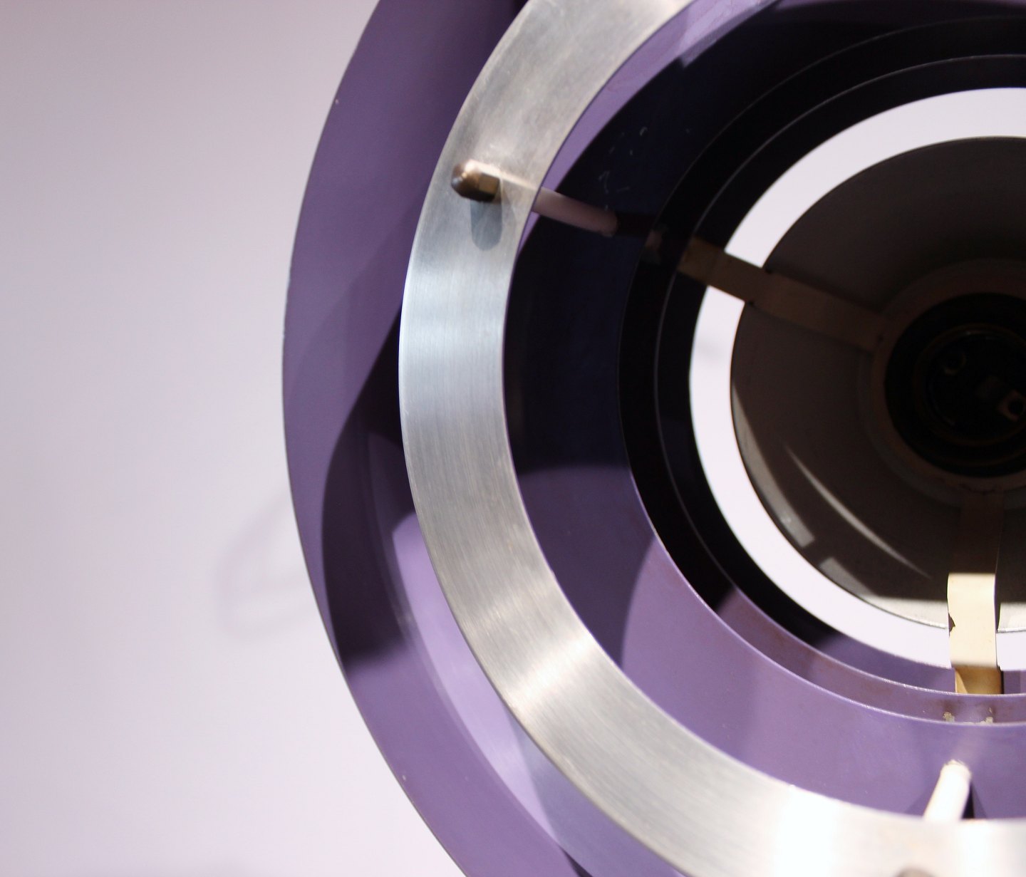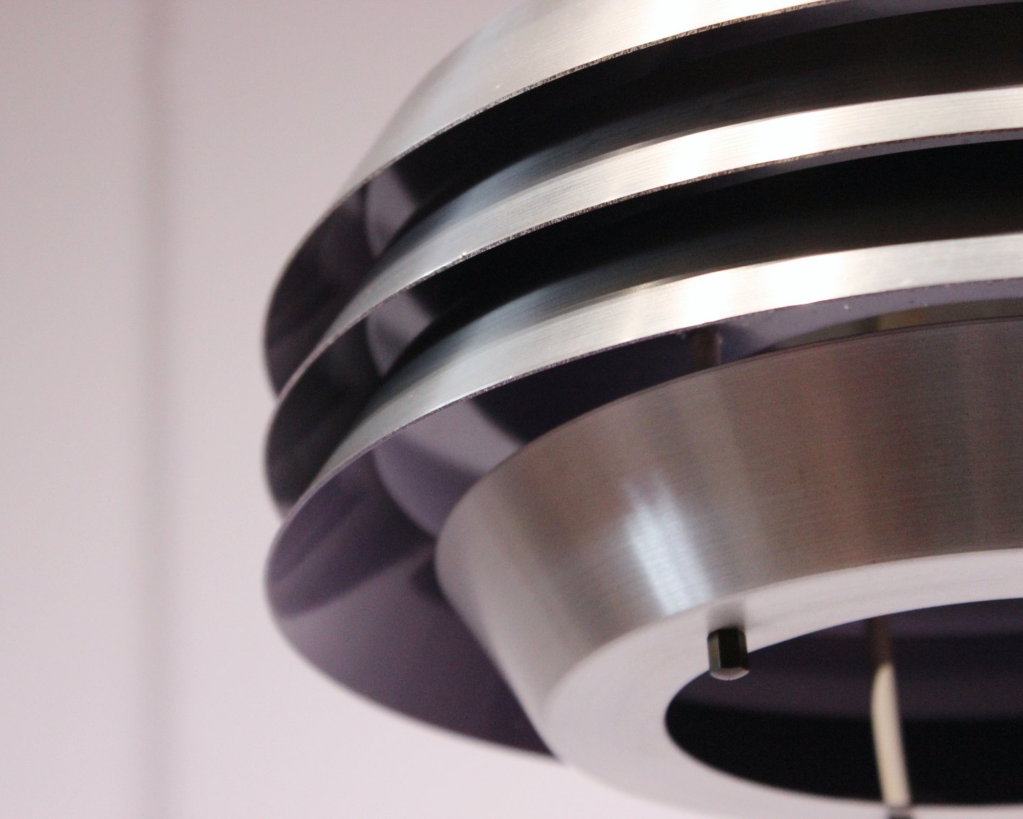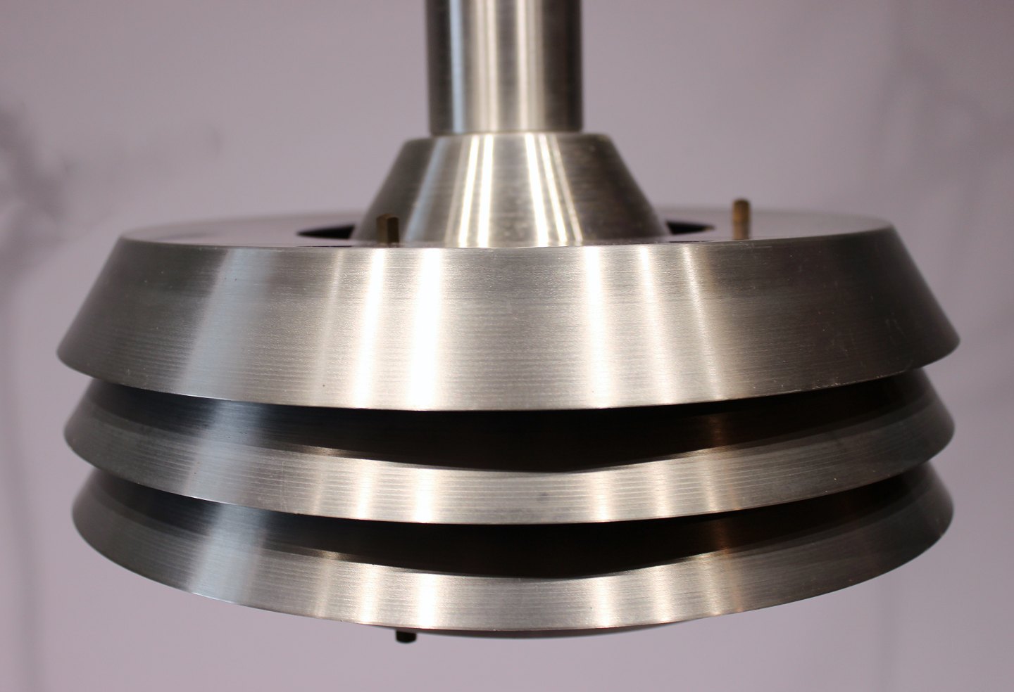 Set of 3 pendants with metal shades and lacquered purple on the inside manufactured by Lyskær of danish design from the 1960s.