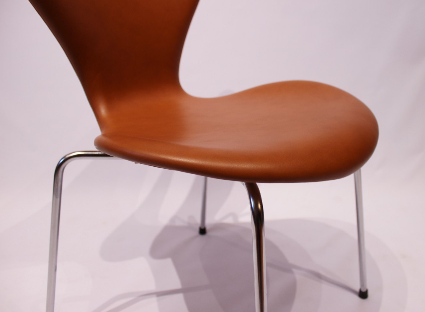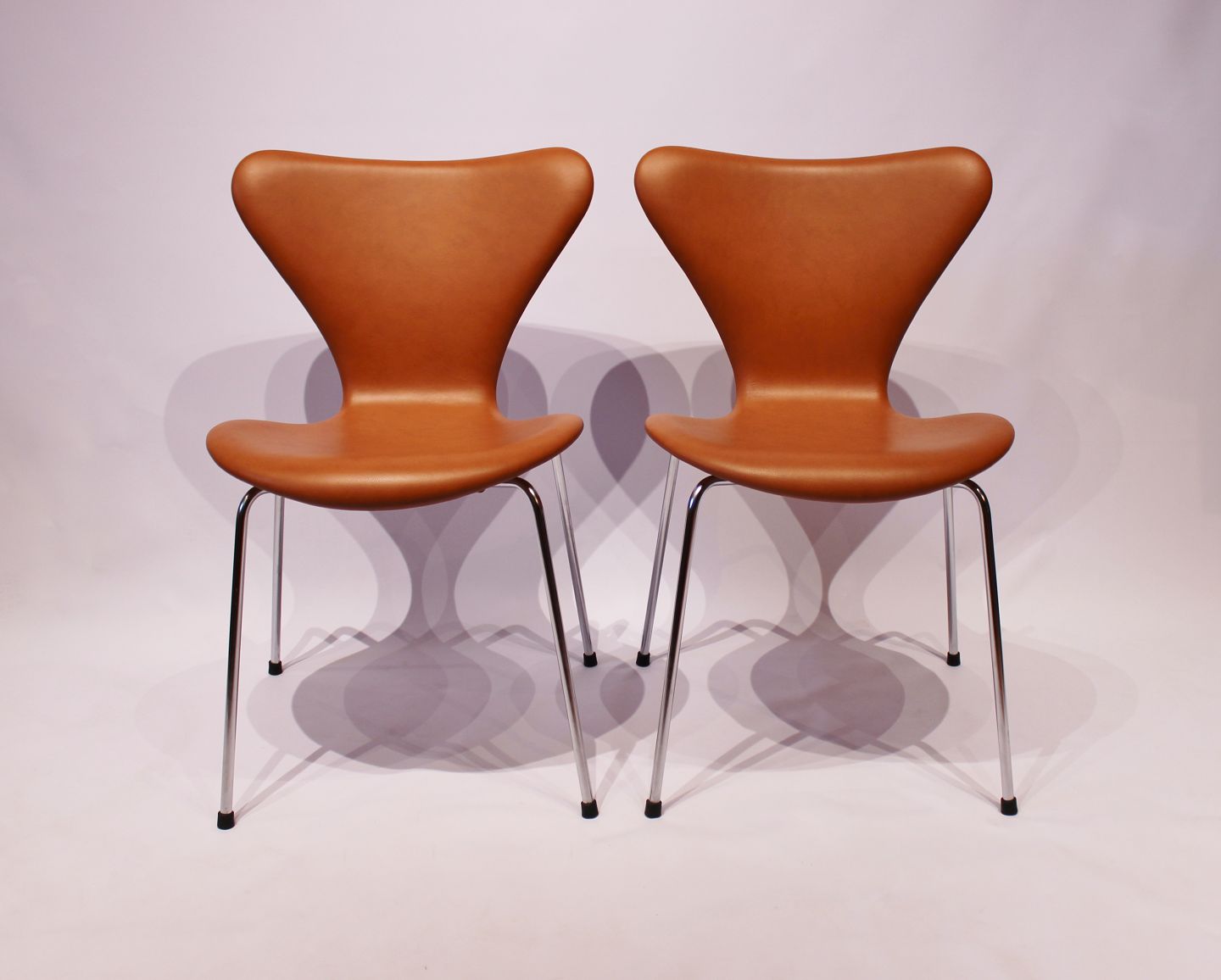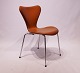 SoldA pair of Seven chairs, model 3107, designed by Arne Jacobsen and manufactured by Fritz Hansen. The chairs have recently been upholstered in elegance cognac leather.