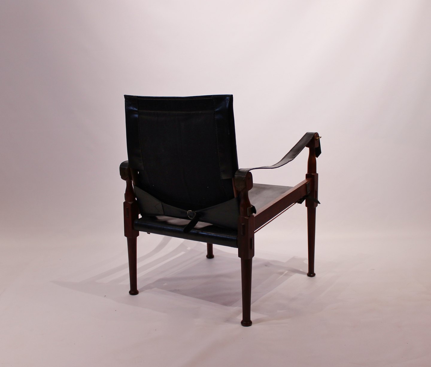 SoldA pair of Safari chairs by M. Hayat & Brothers in walnut and black patinated leather from Pakistan around the 1970s. The chairs are in great vintage condition.