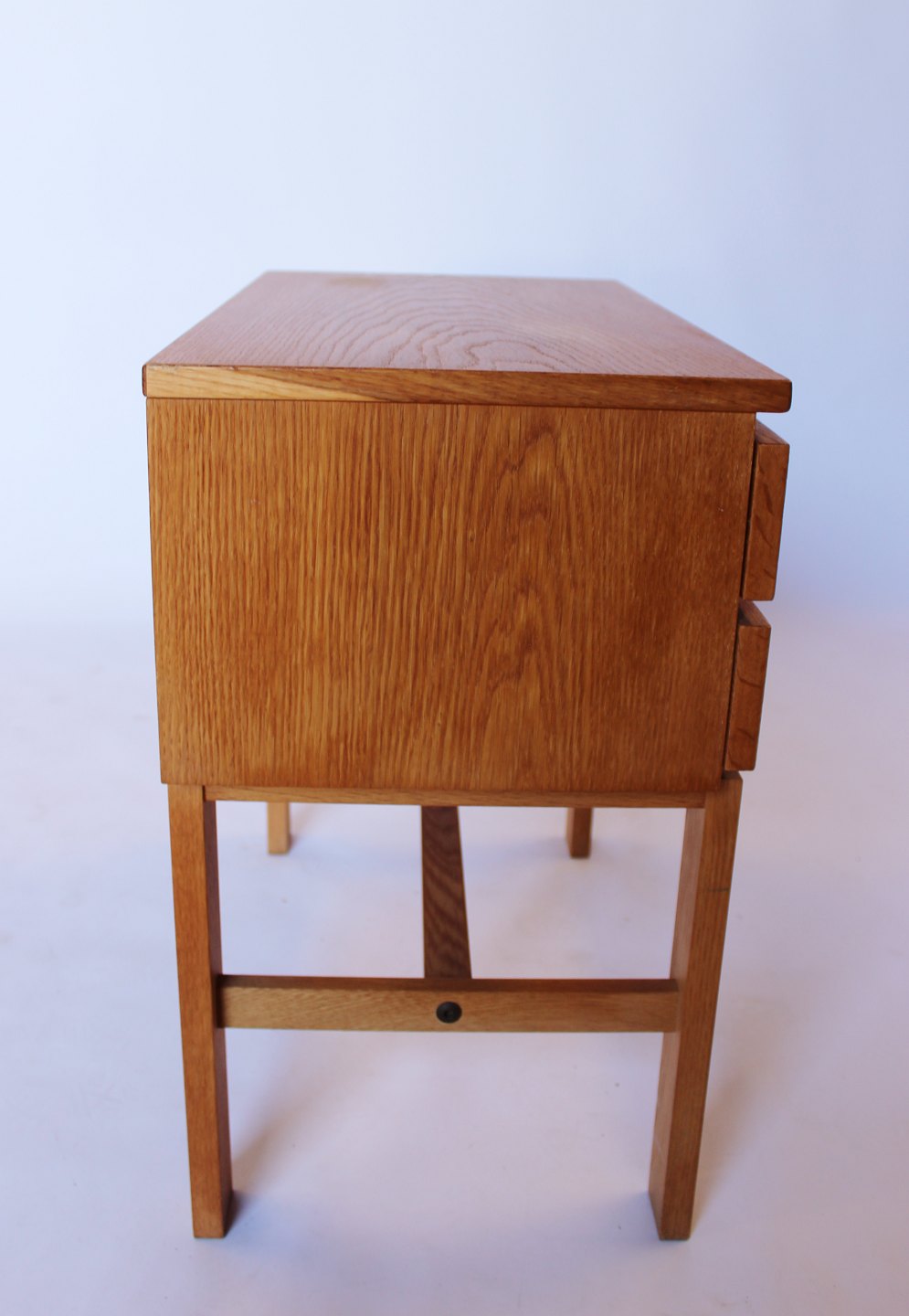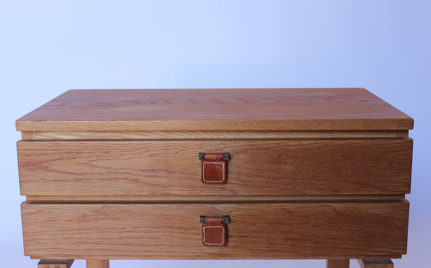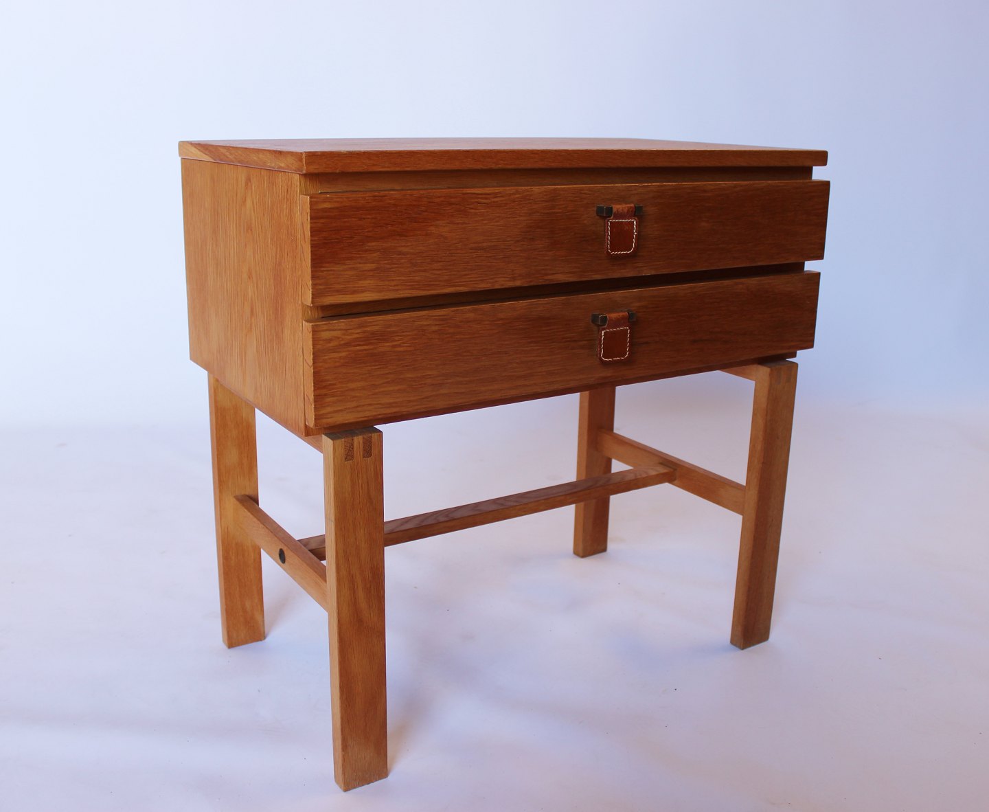 SoldSmall oak chest of drawers with leather handles by Fröseke Nybrofabrik from the 1960s.