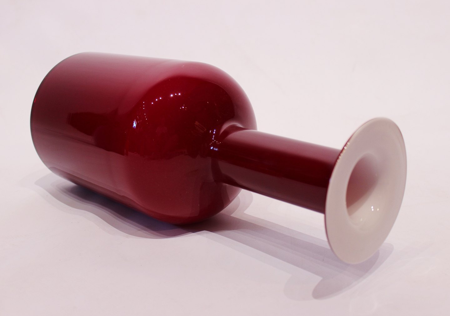 SoldLarge bordeaux glass vase with white opal glass on the inside by Otto Brauer for Holmegaard.