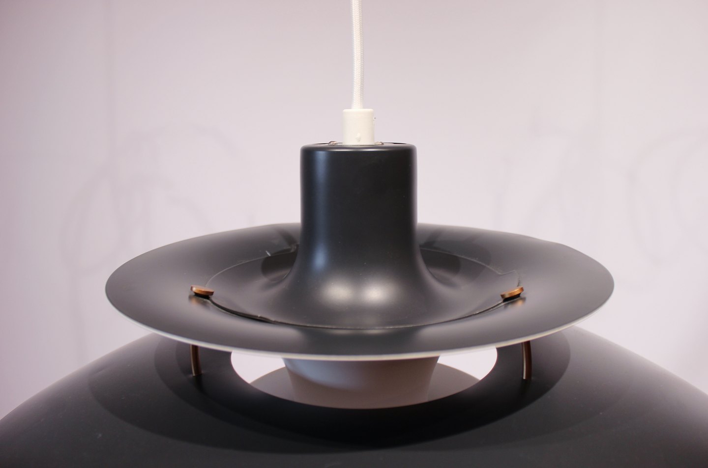 PH5 pendant designed by Poul Henningsen in 1958 and manufactured by Louis Poulsen. The pendant has dark grey lacquered metal Shades.