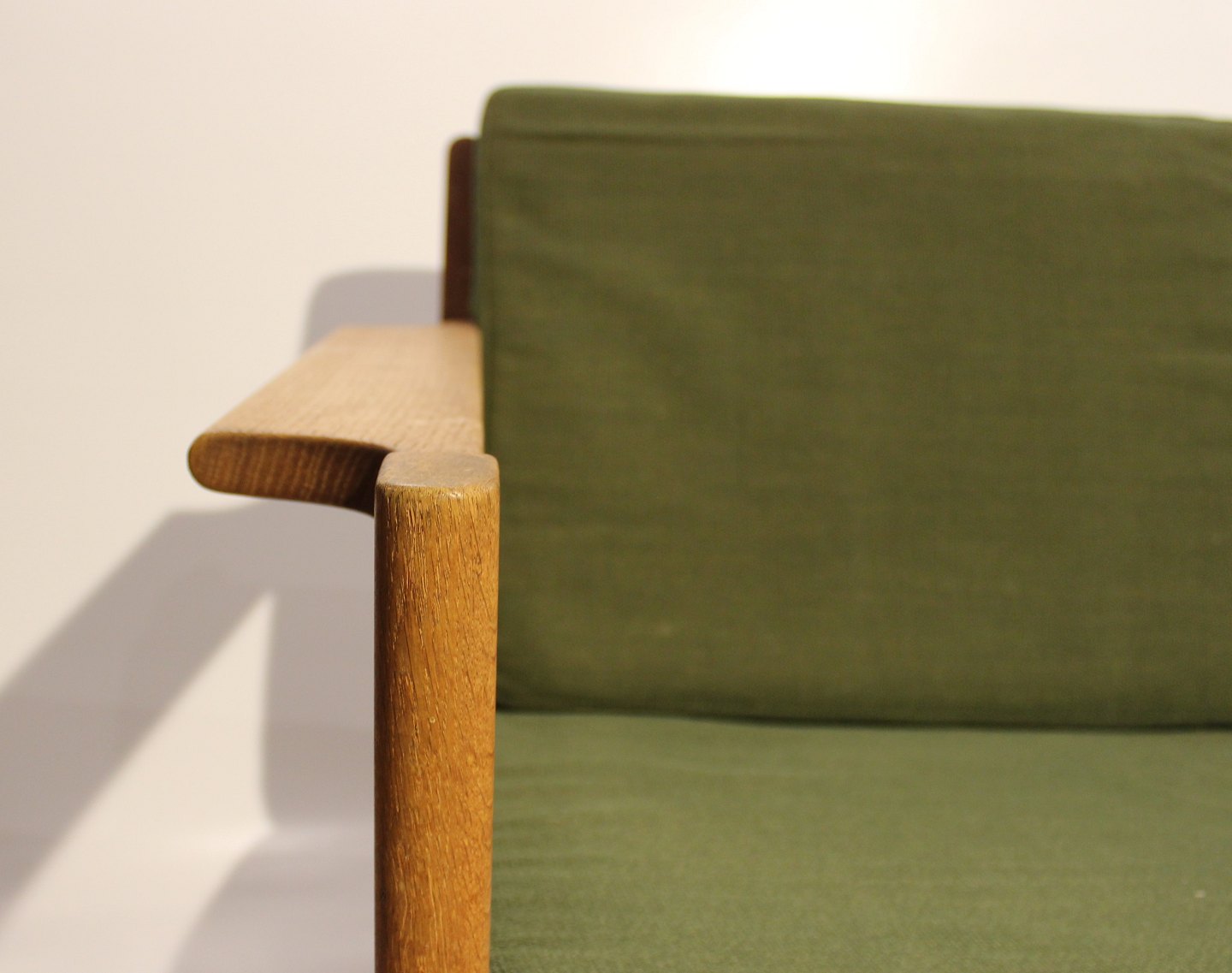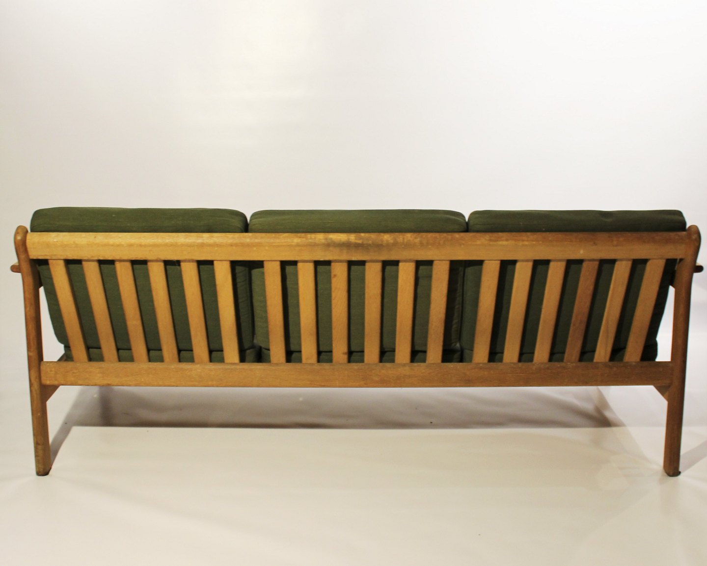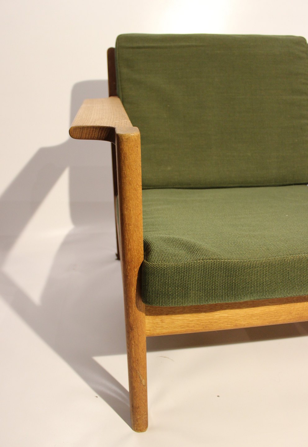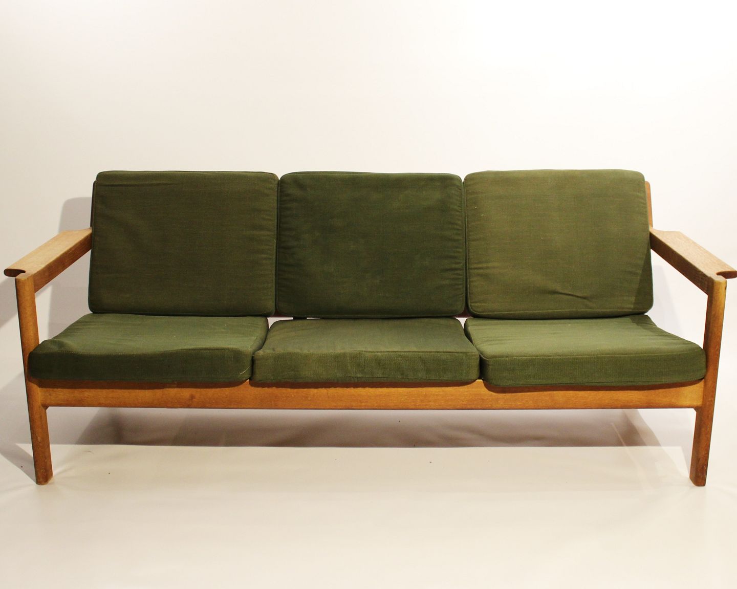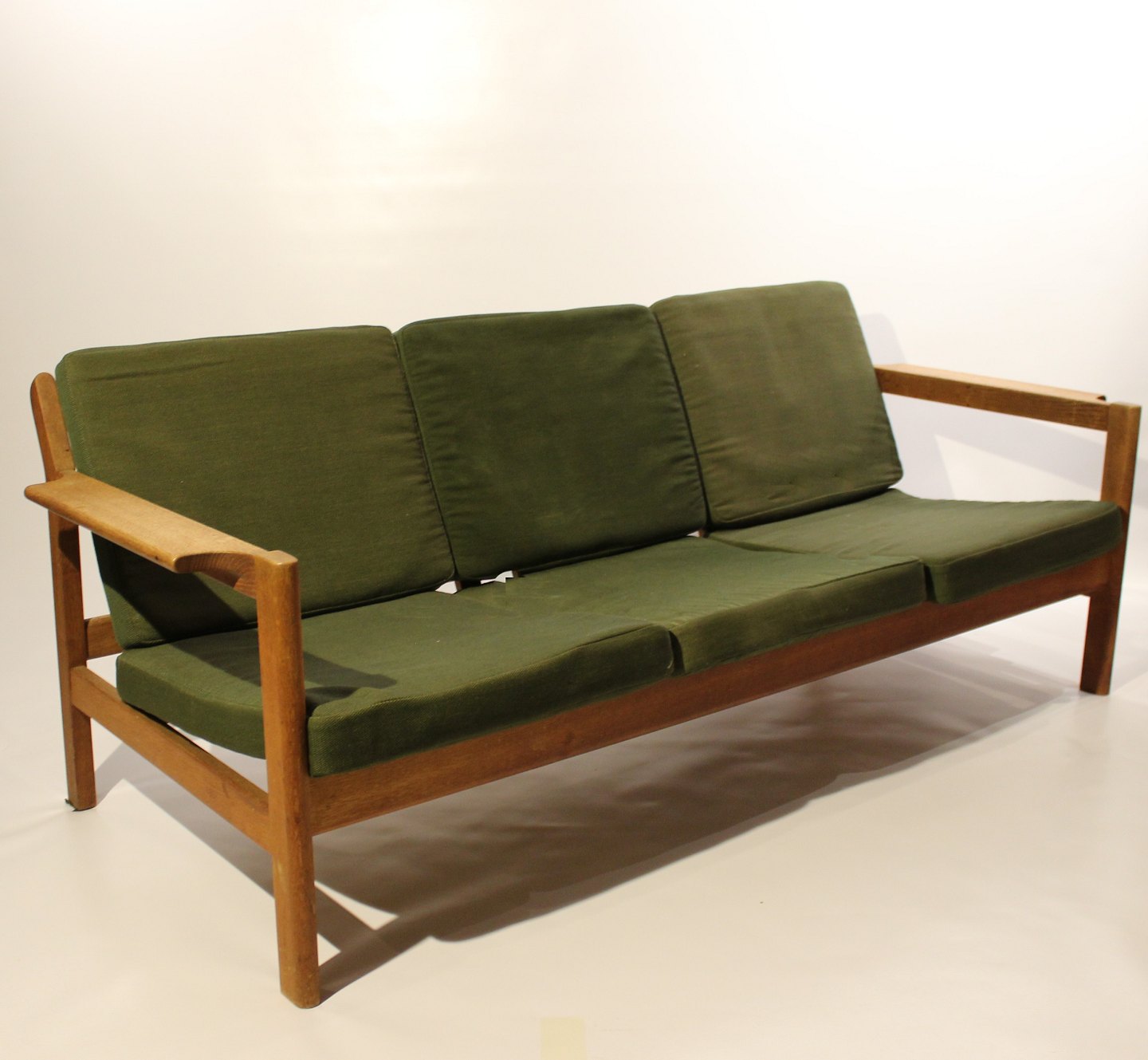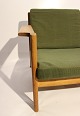 SolgtSofa i eg og polstret i grønt stof, model J103 designet af Børge Mogensen for FDB fra 1960erne. Sofaen er i brugt stand og ompolstring er mulig, både i stof eller læder.