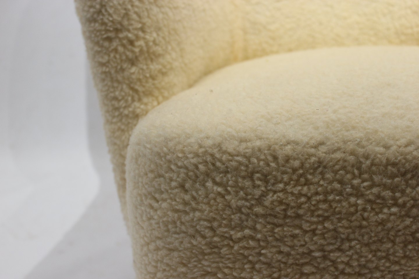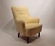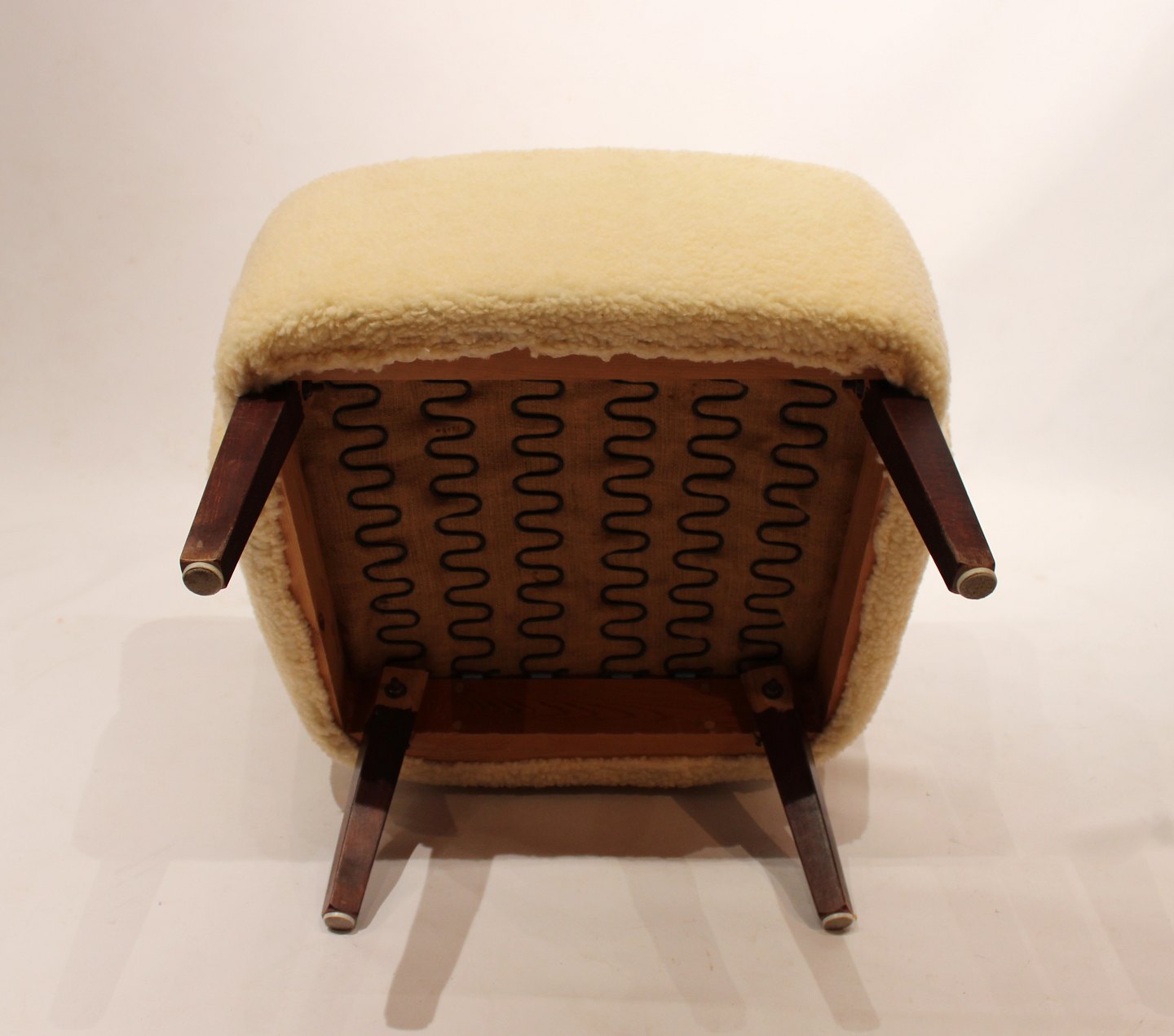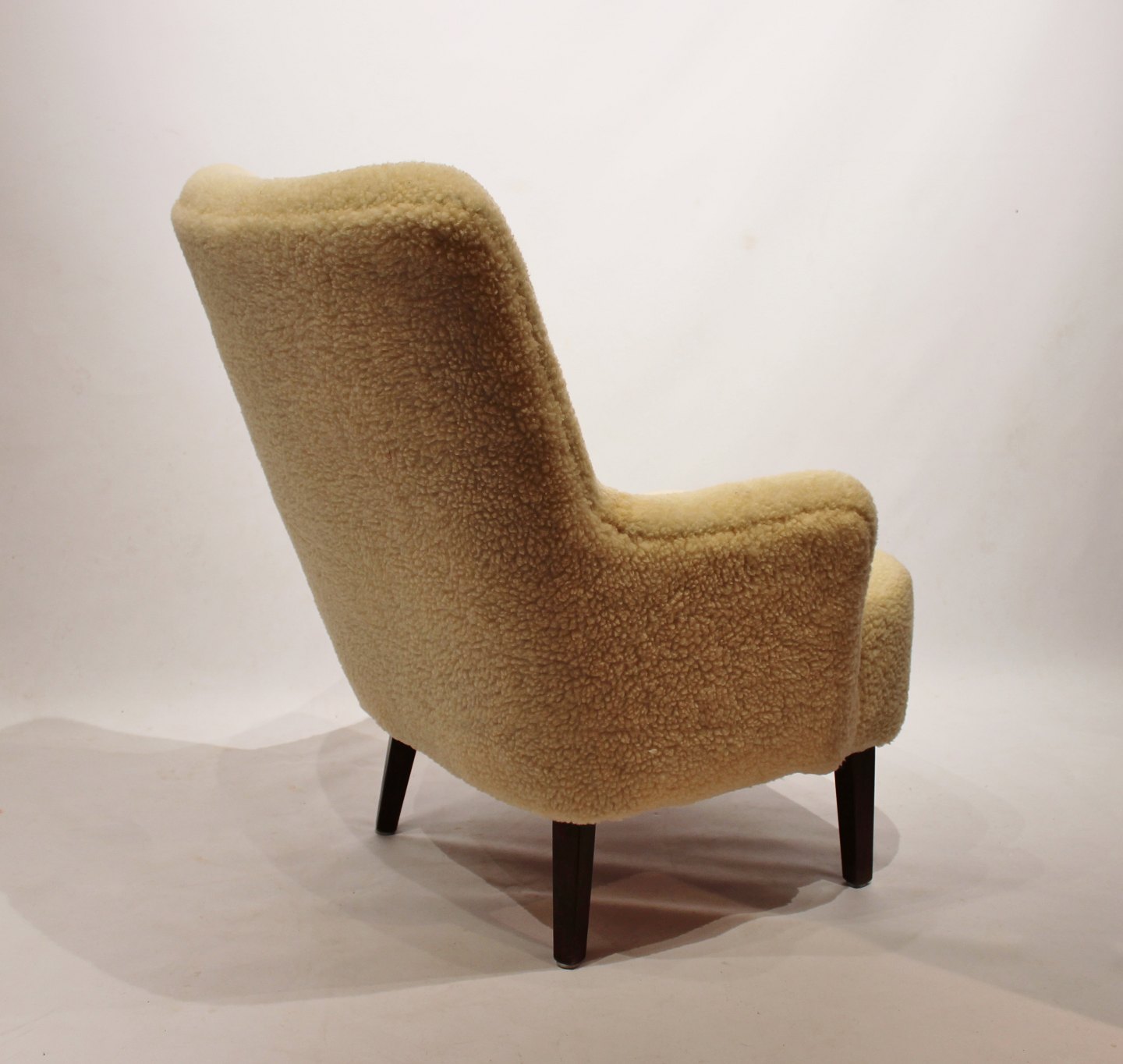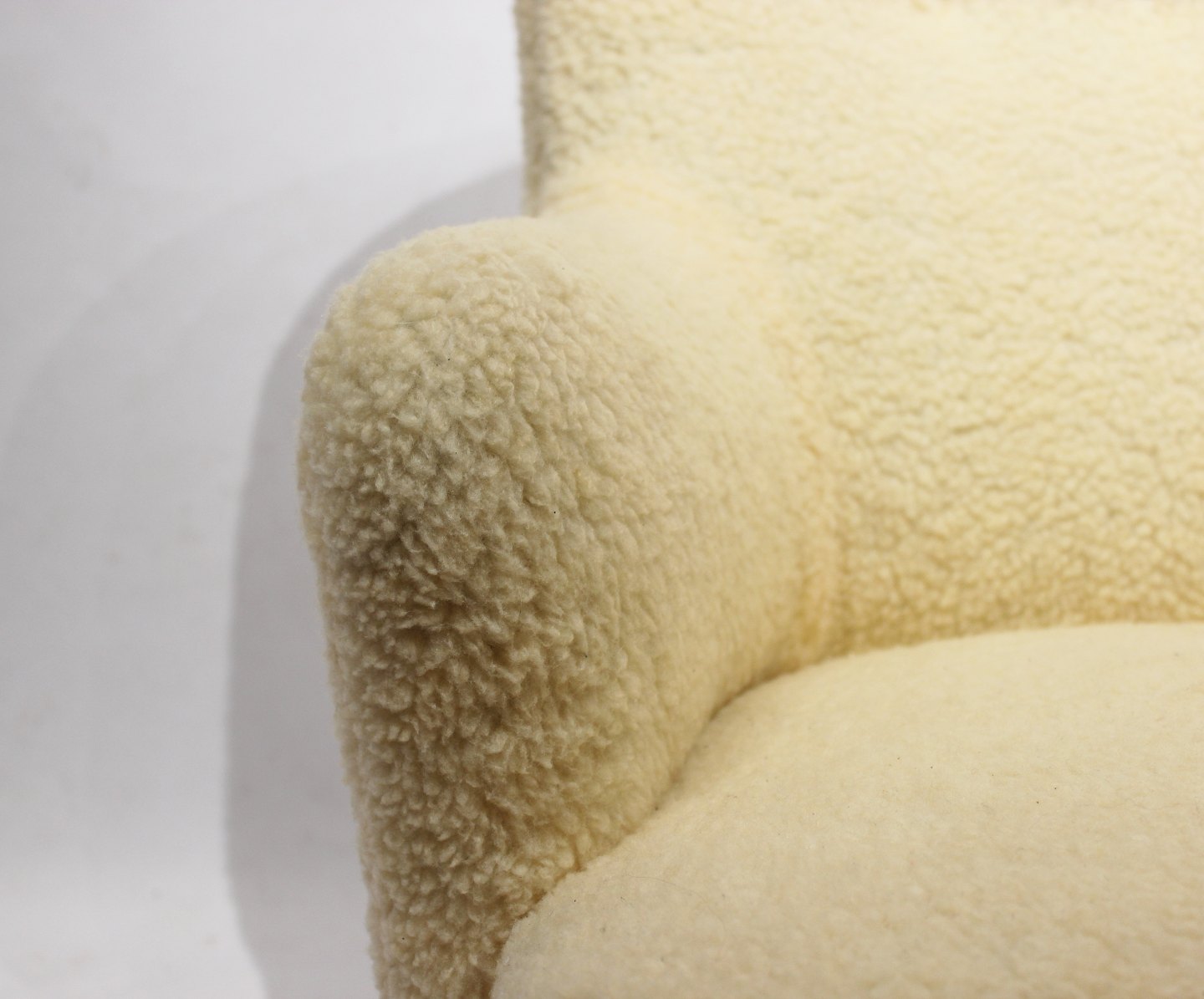 SoldEasy chair upholstered with sheep wool and legs of mahogany from the 1940s. The chair is in great vintage condition.