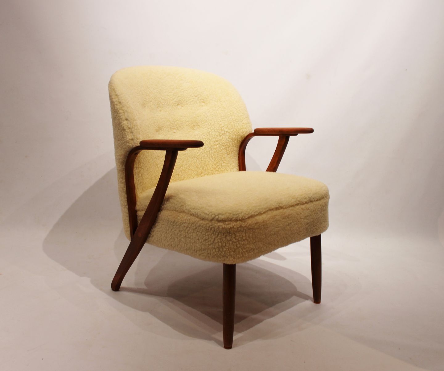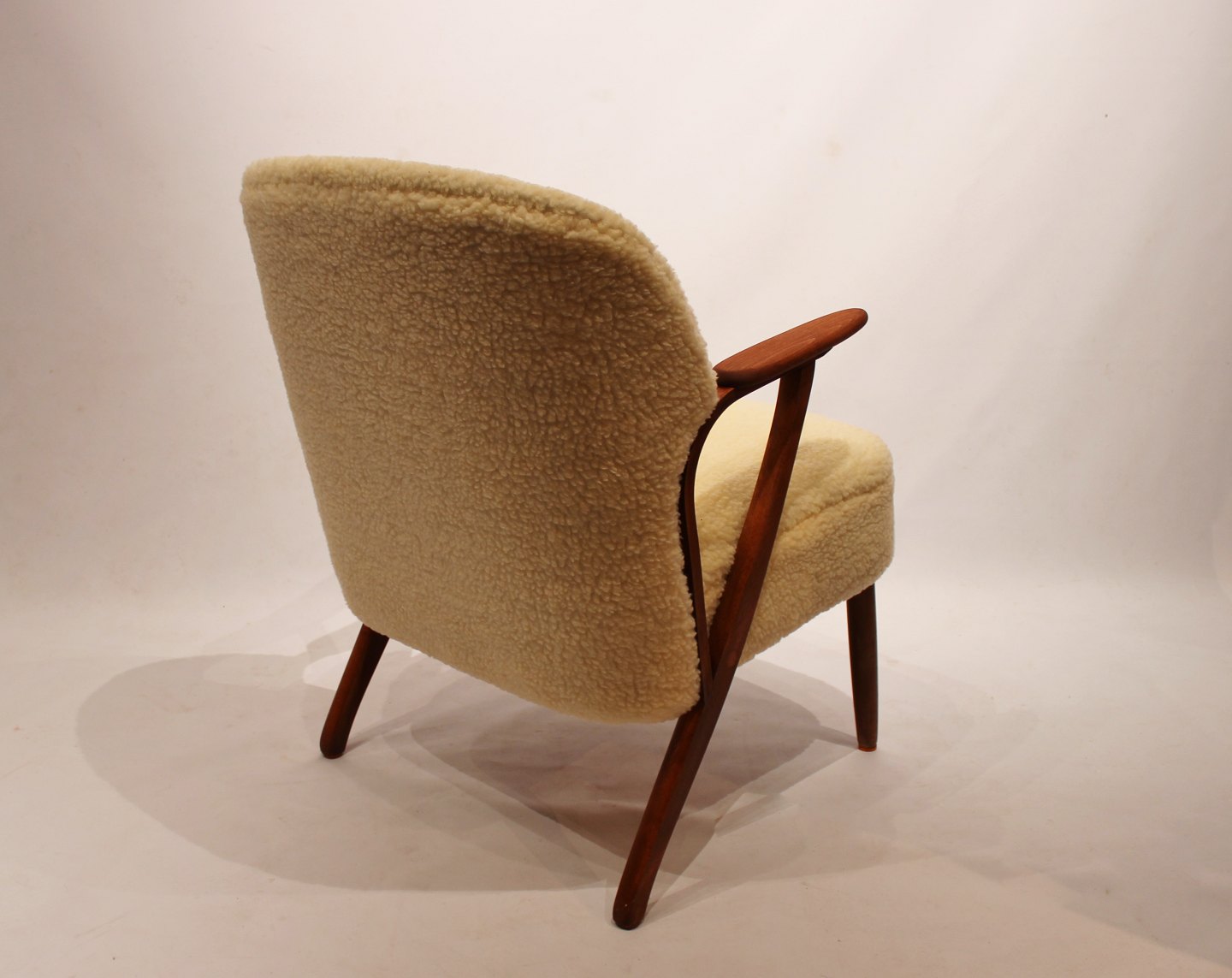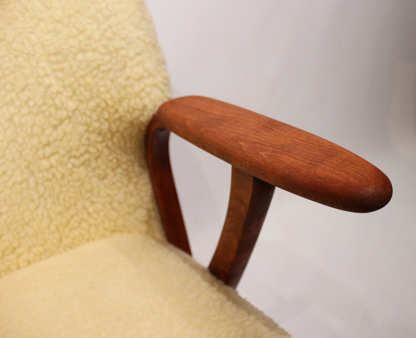 SolgtHvilestol polstret med fåreuld og med arme af mørkt træ af dansk design fra 1960erne. Stolen er i flot brugt stand.