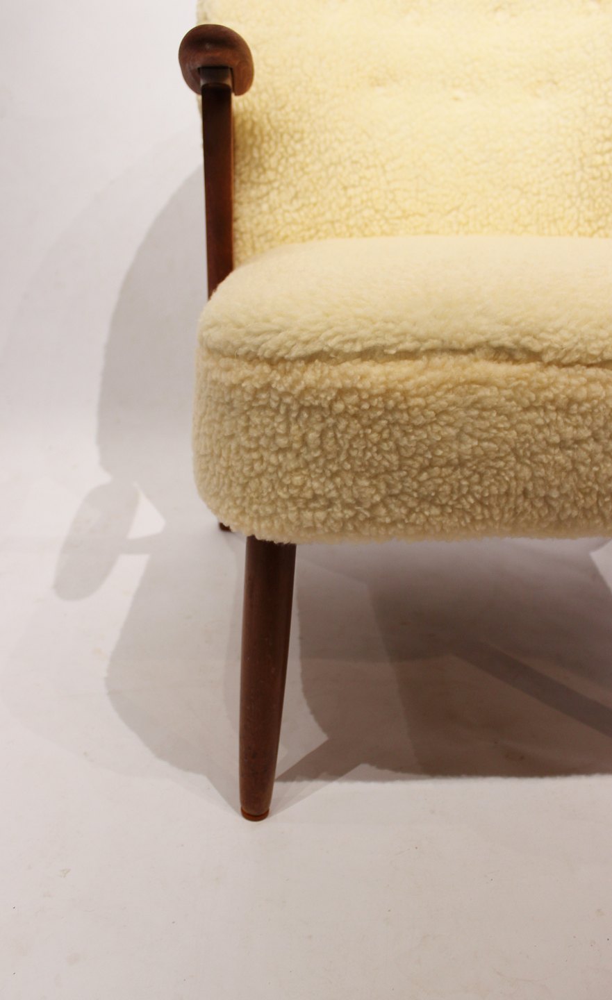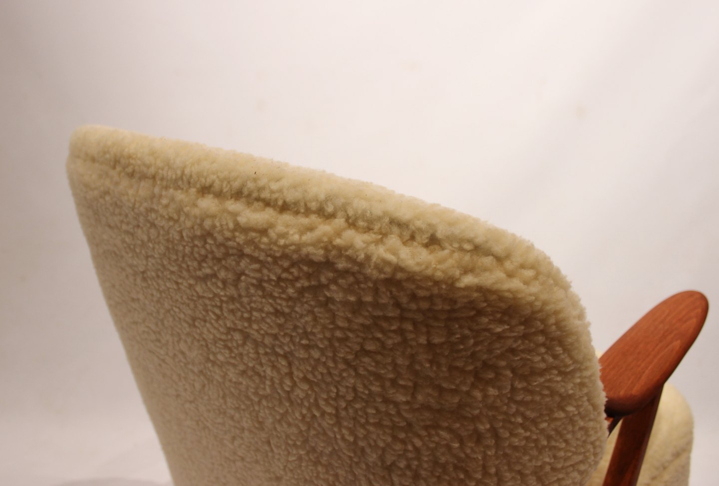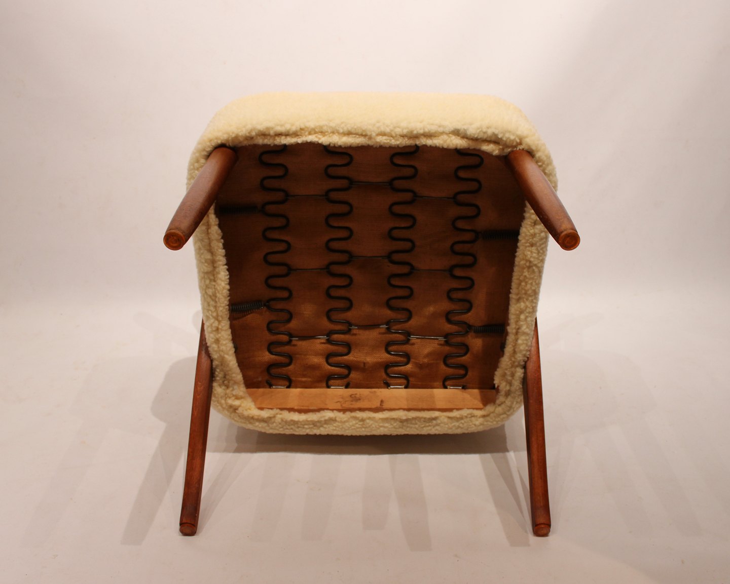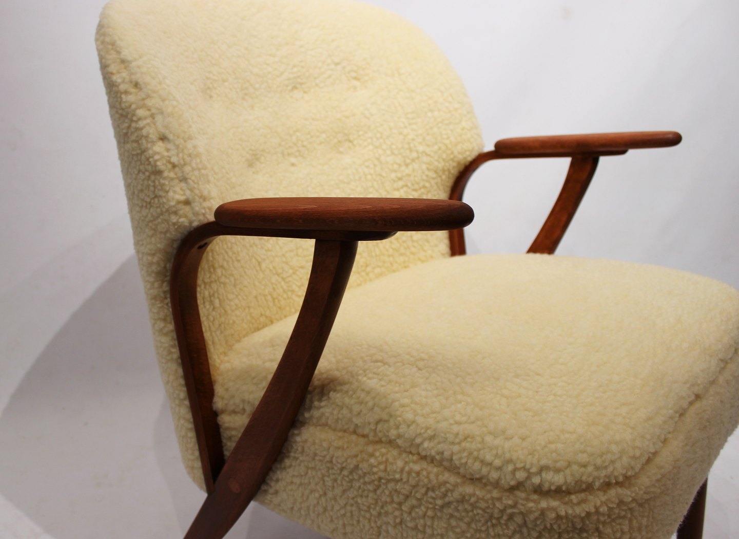 SolgtHvilestol polstret med fåreuld og med arme af mørkt træ af dansk design fra 1960erne. Stolen er i flot brugt stand.