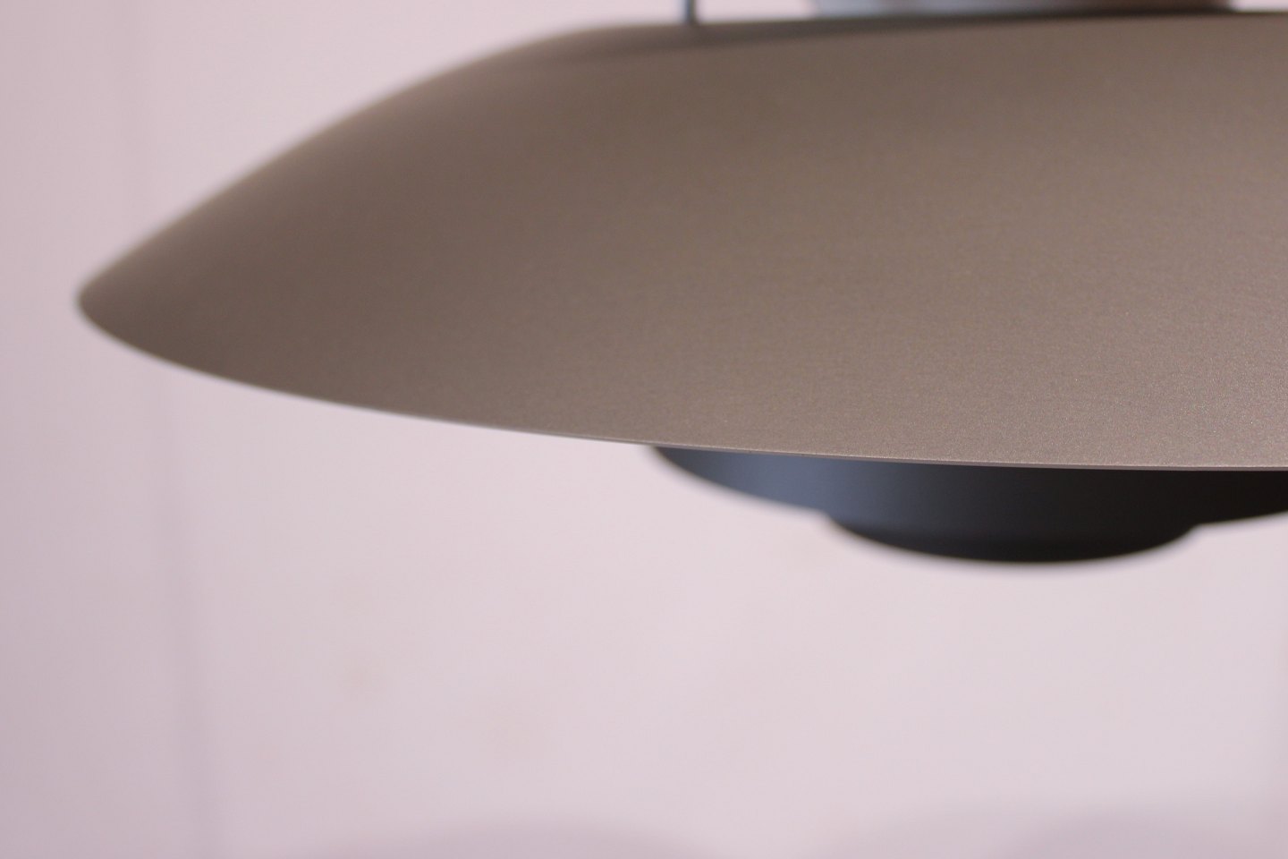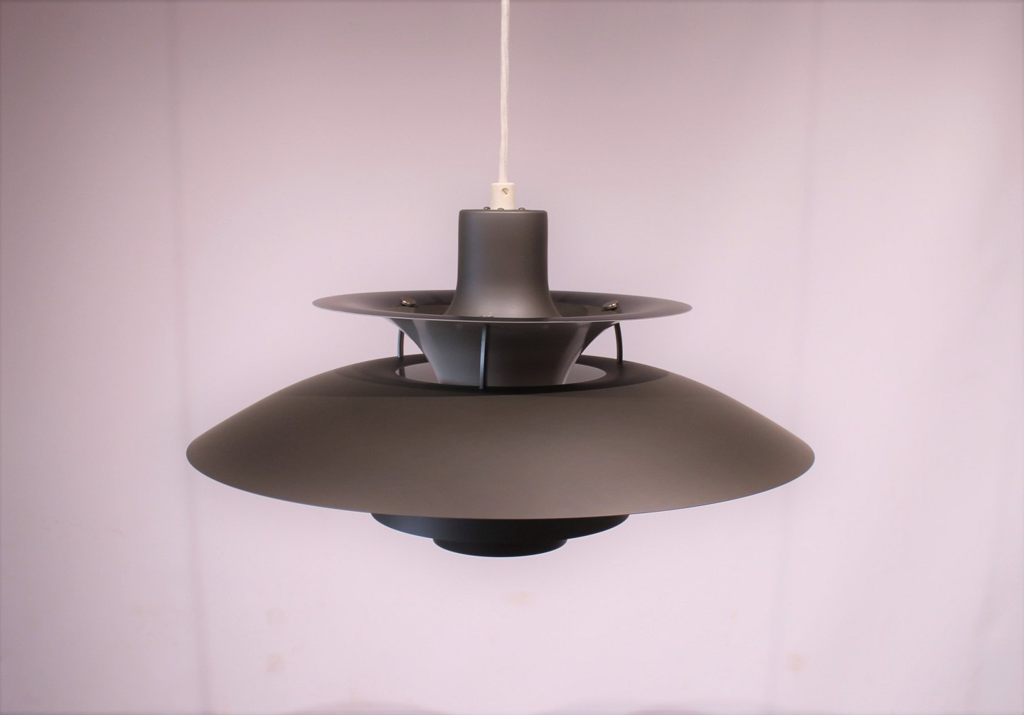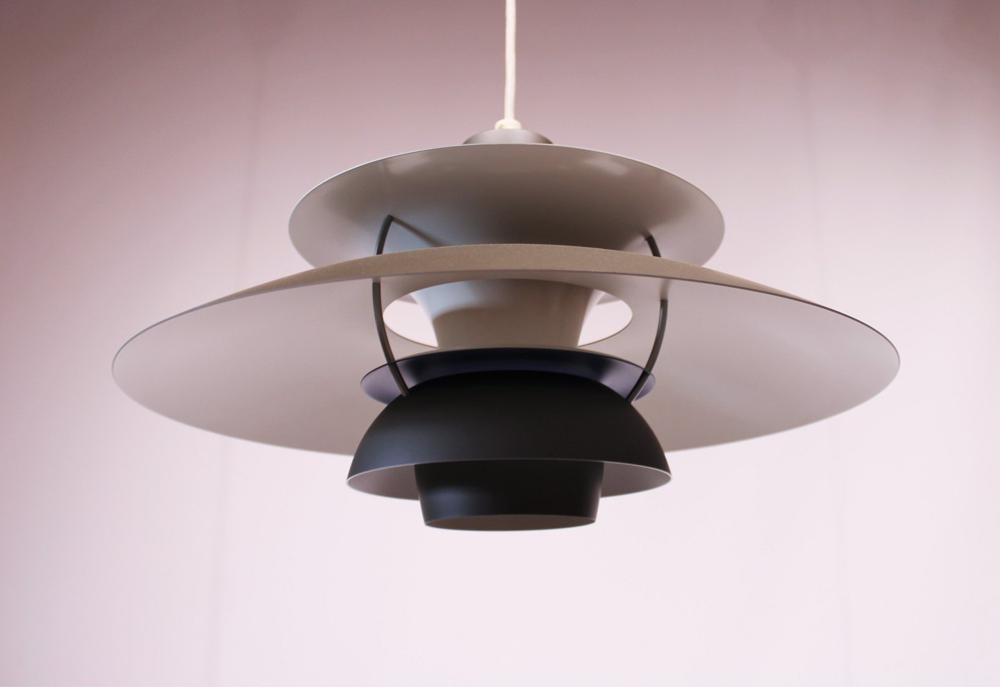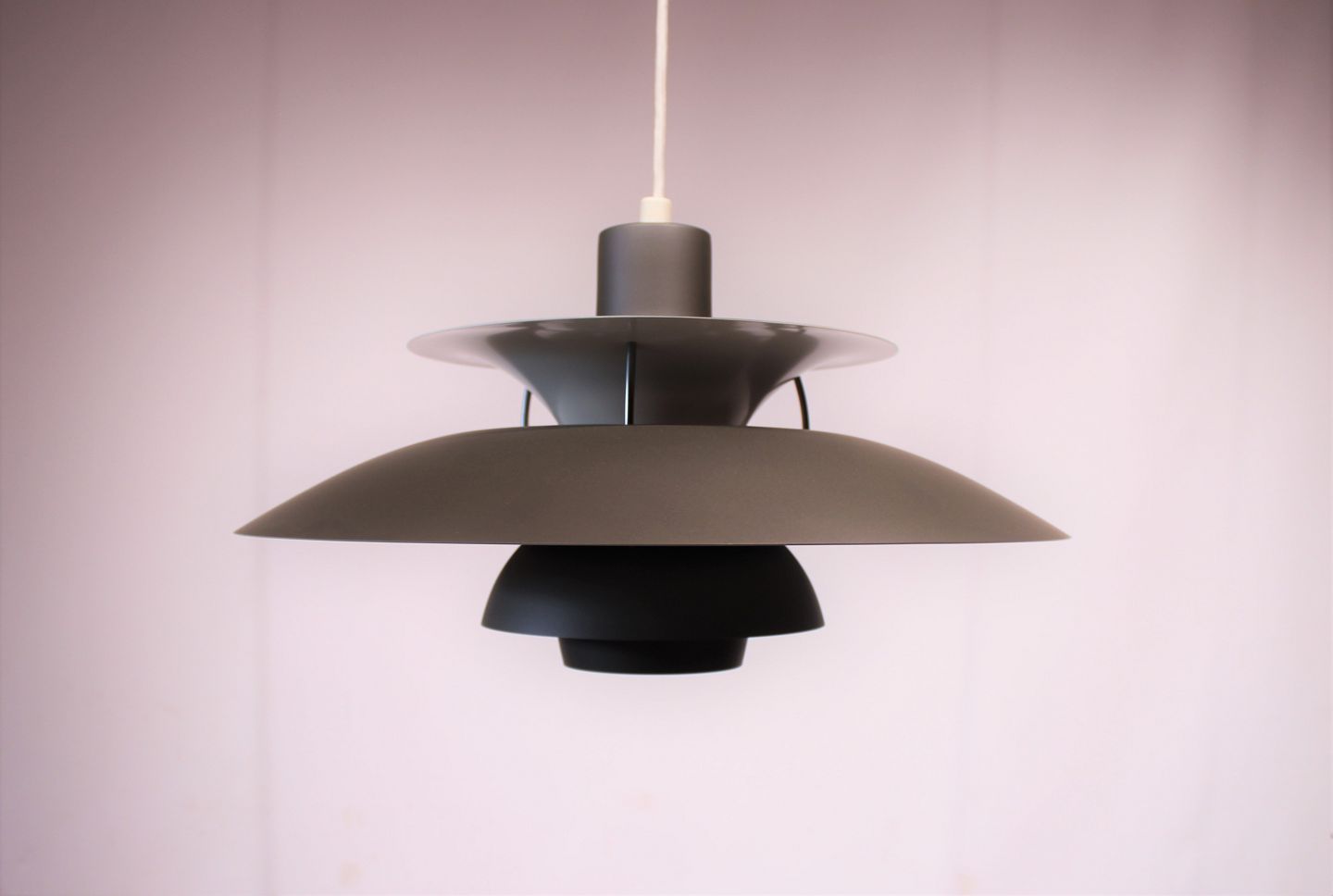 SolgtPH5 lampe designet af Poul Henningsen i 1958 og fremstillet af Louis Poulsen. Lampen har koksgrå lakerede metal skærme.