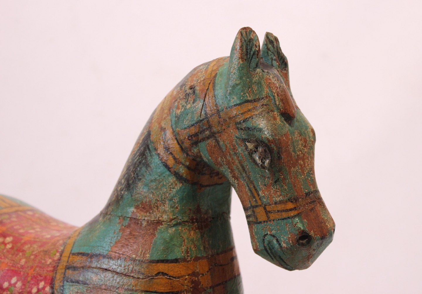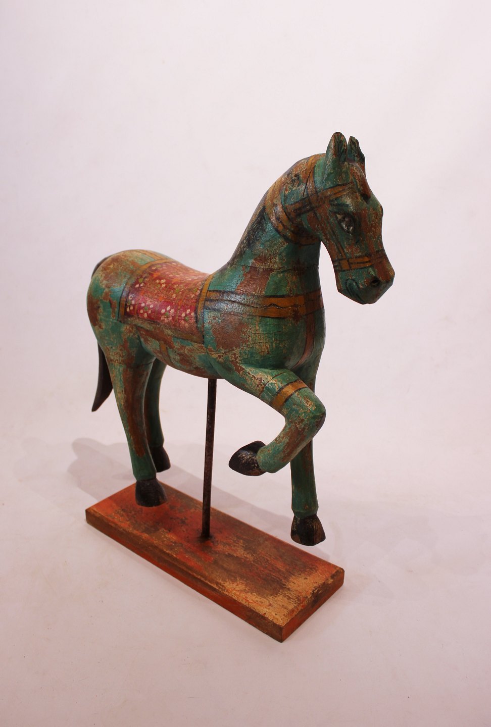 SoldLarge wooden figure in the shape of a horse decorated with different dark colours from the 1920s. The figure is in great vintage condition.