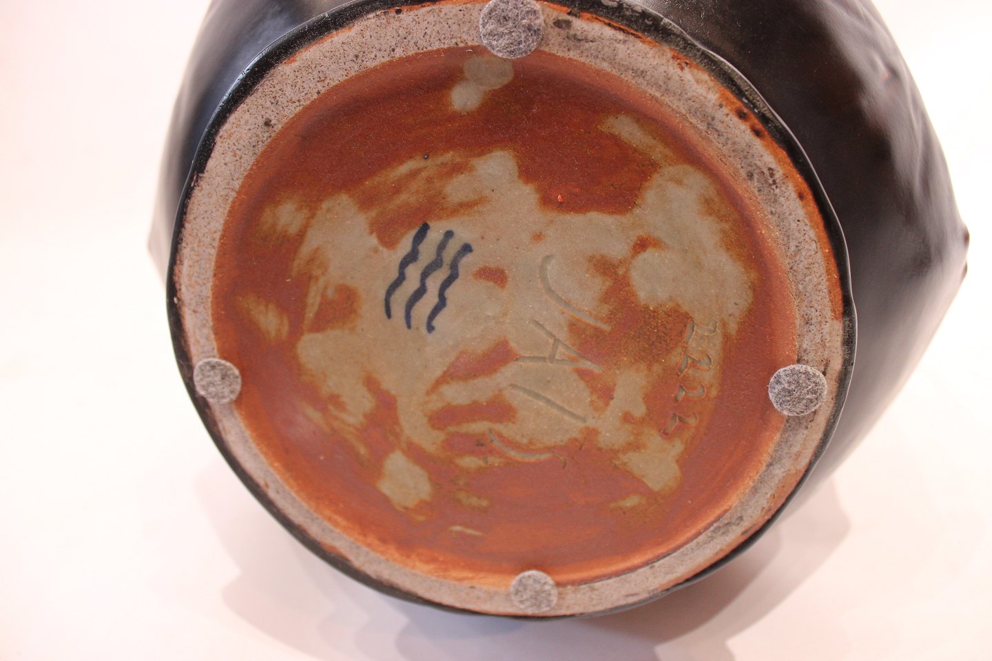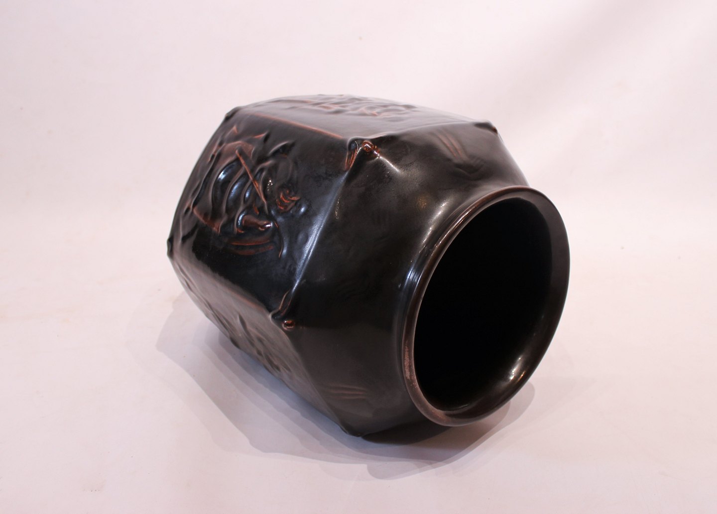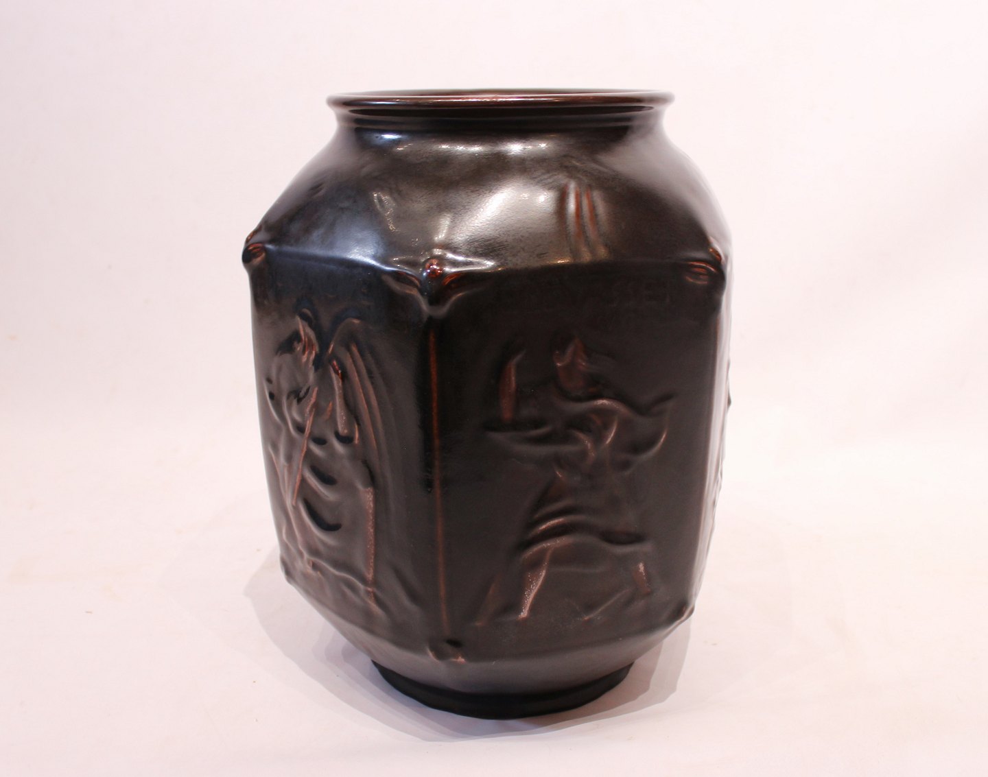 SolgtKongelig stentøj gulvvase i mørk glas med motiver signeret af Jais Nielsen og nummeret 2222. Vasen er i flot brugt stand.