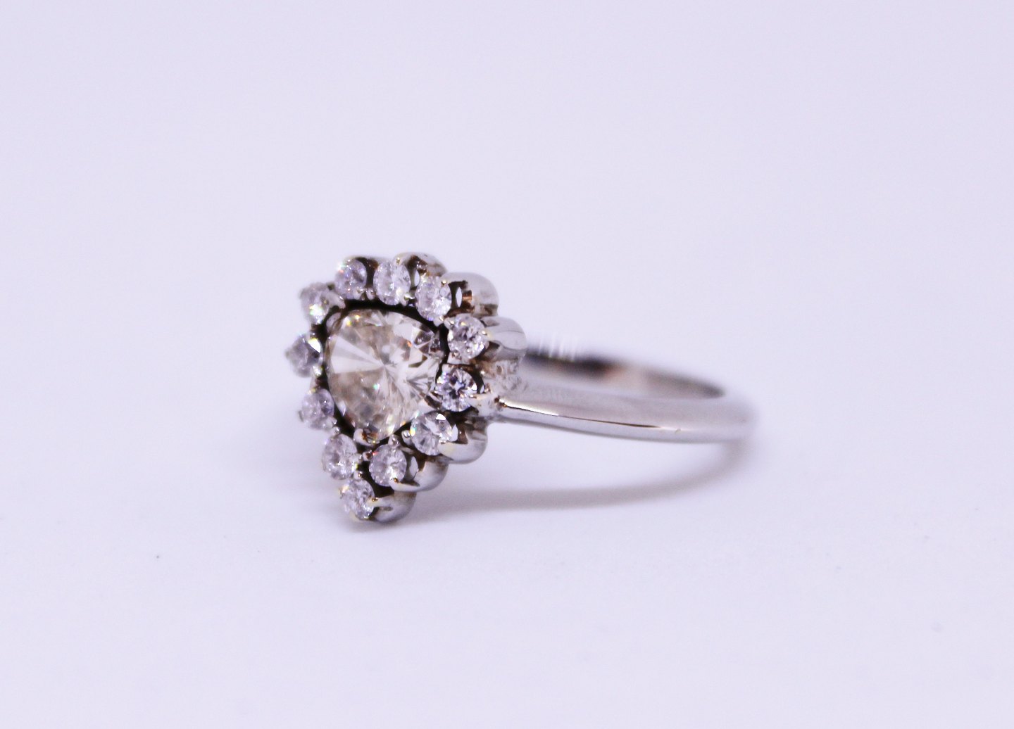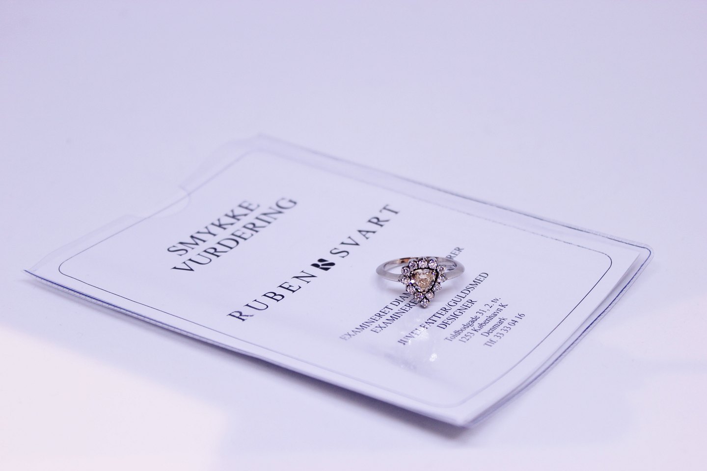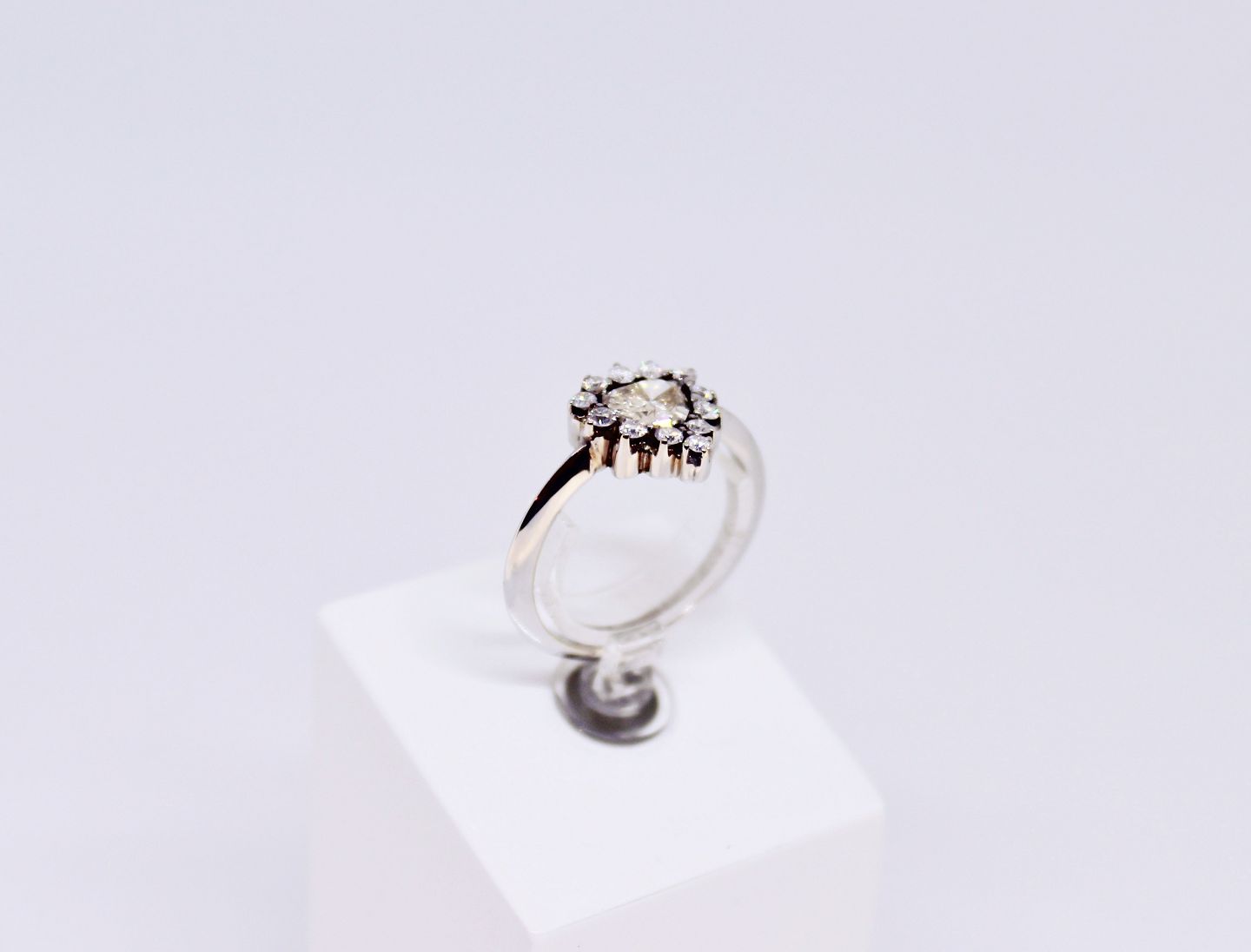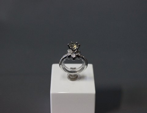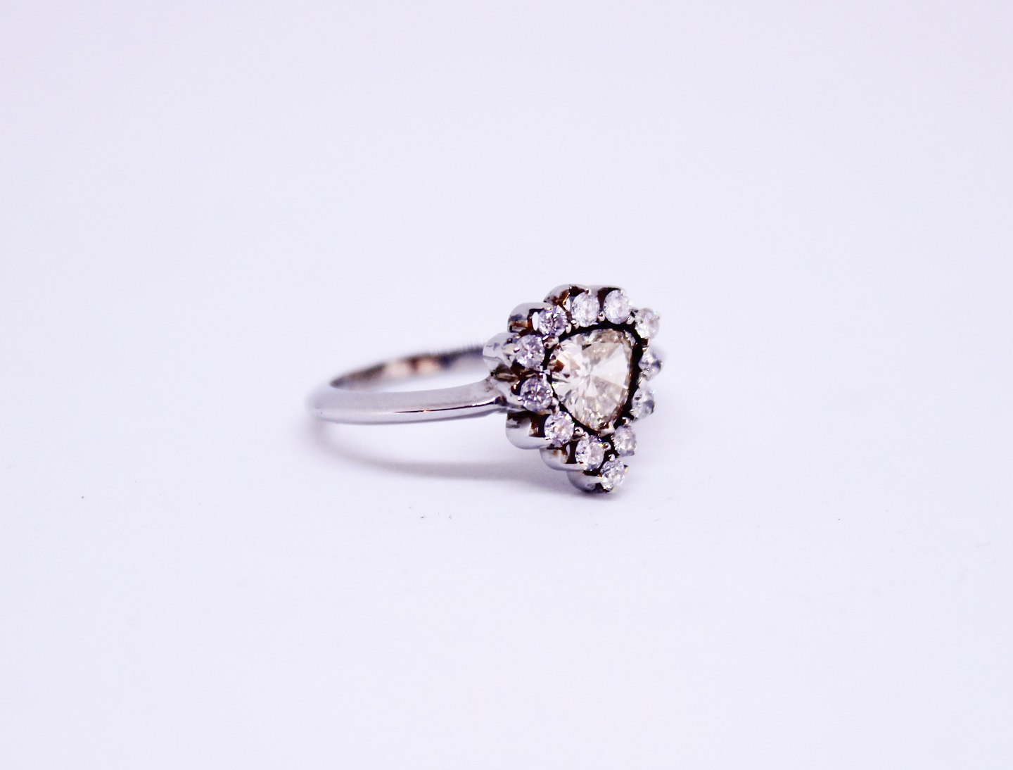 Kontakt os vedrørende prisRing af 14 kt. hvidguld dekoreret med 13 diamanter. En triangel formet diamant af 0,72 kt. i farven lys champagne og klarhed S12. Samt 12 mindre diamanter af 0,36 kt. og i farven Wesselton.