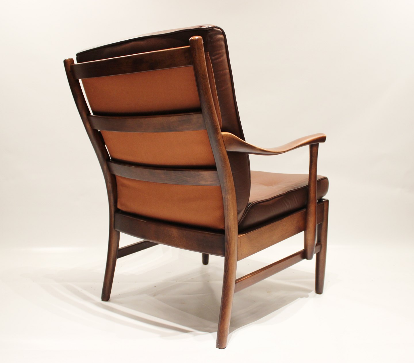 Et sæt lænestole af poleret træ og mørkebrunt læder, dansk design fra 1960erne.