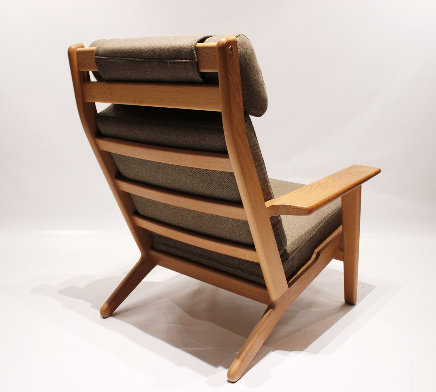 Easy chair, model GE290A, and stool designed by Hans J. Wegner and manufactured by Getama in the 1960s. The chair and stool are of soap treated oak and upholstered with dark green Hallingdal wool.