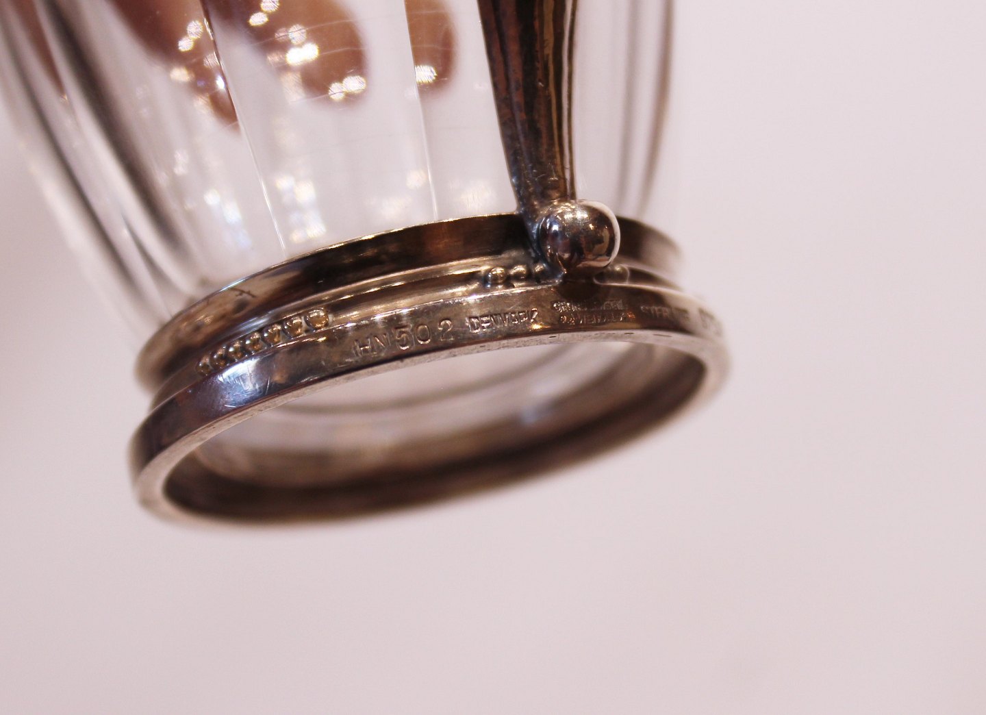 SoldOil jug of glass and 925 sterling silver by Georg Jensen. The jug is in great vintage condition and numbered 502.