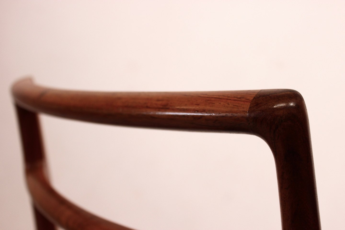 SolgtSæt af fire spisestuestole, model 82, designet af N.O. Møller fra 1960erne. Stolene er af palisander og sæde polstret i sort læder.