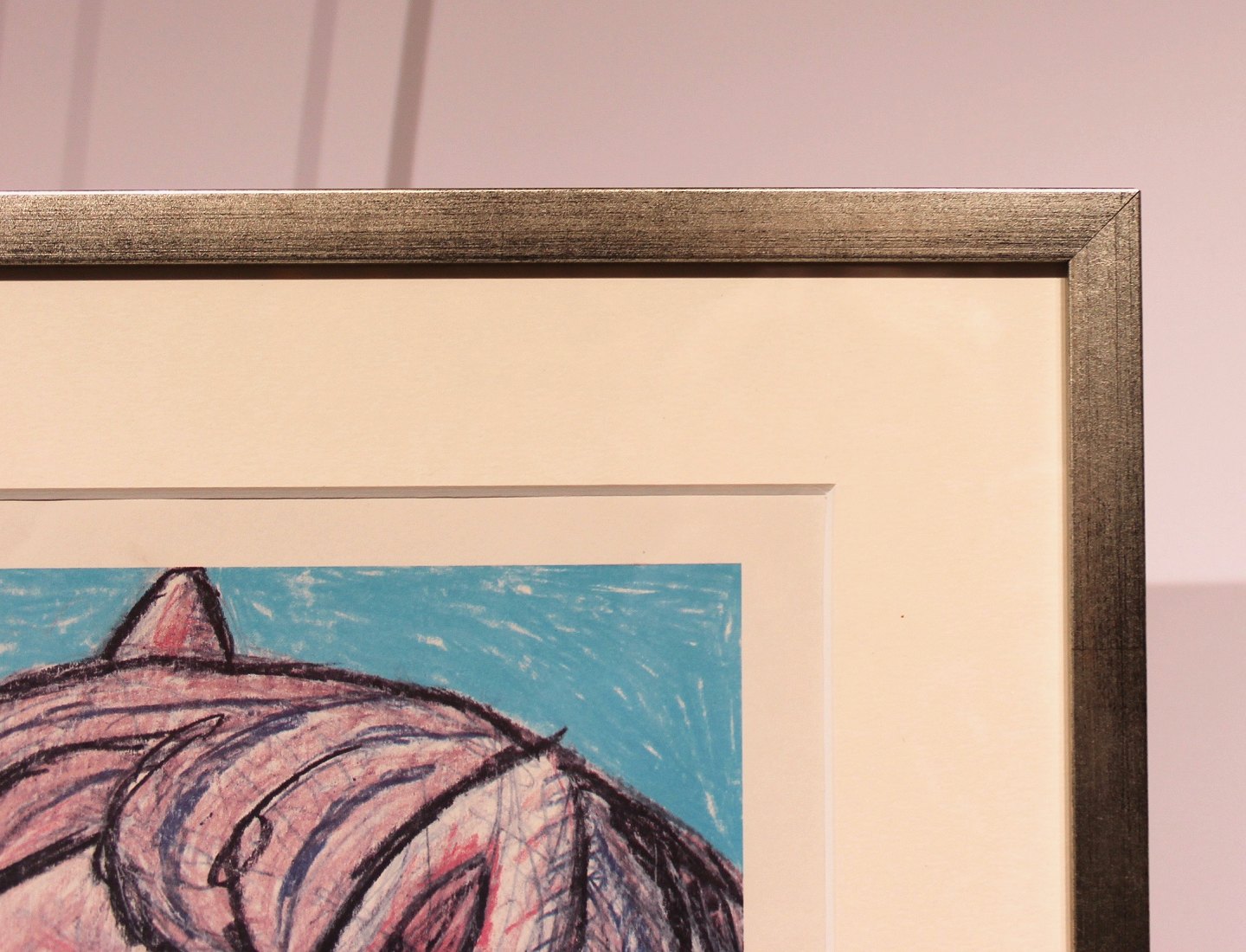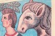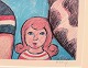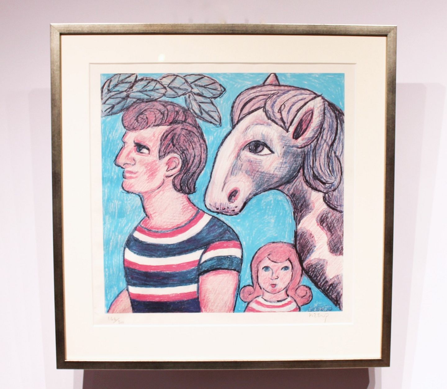 SoldDrawing in blue colors with motif of man and horse signed Heerup by Henry Heerup. The drawing is numbered 166/300.