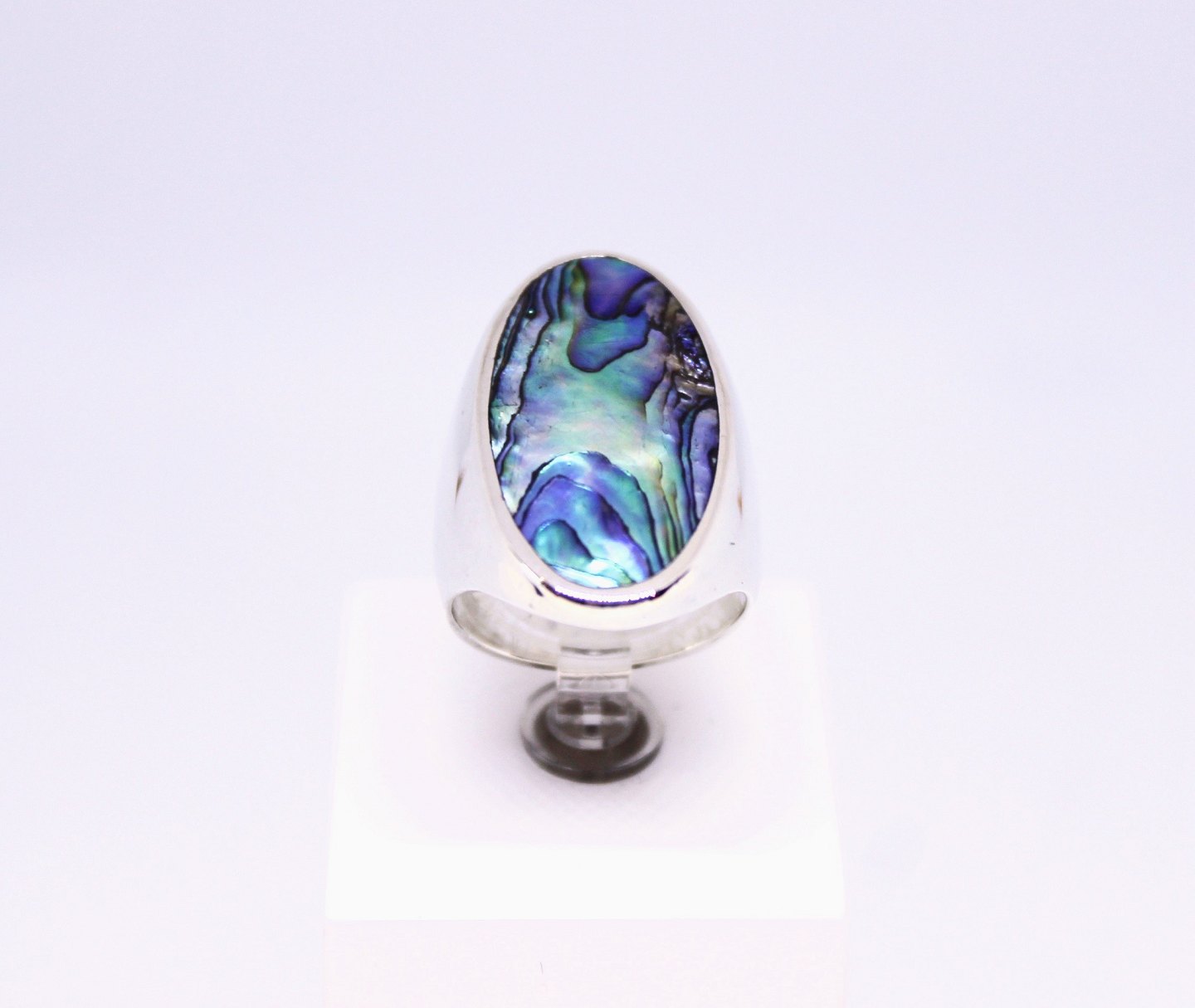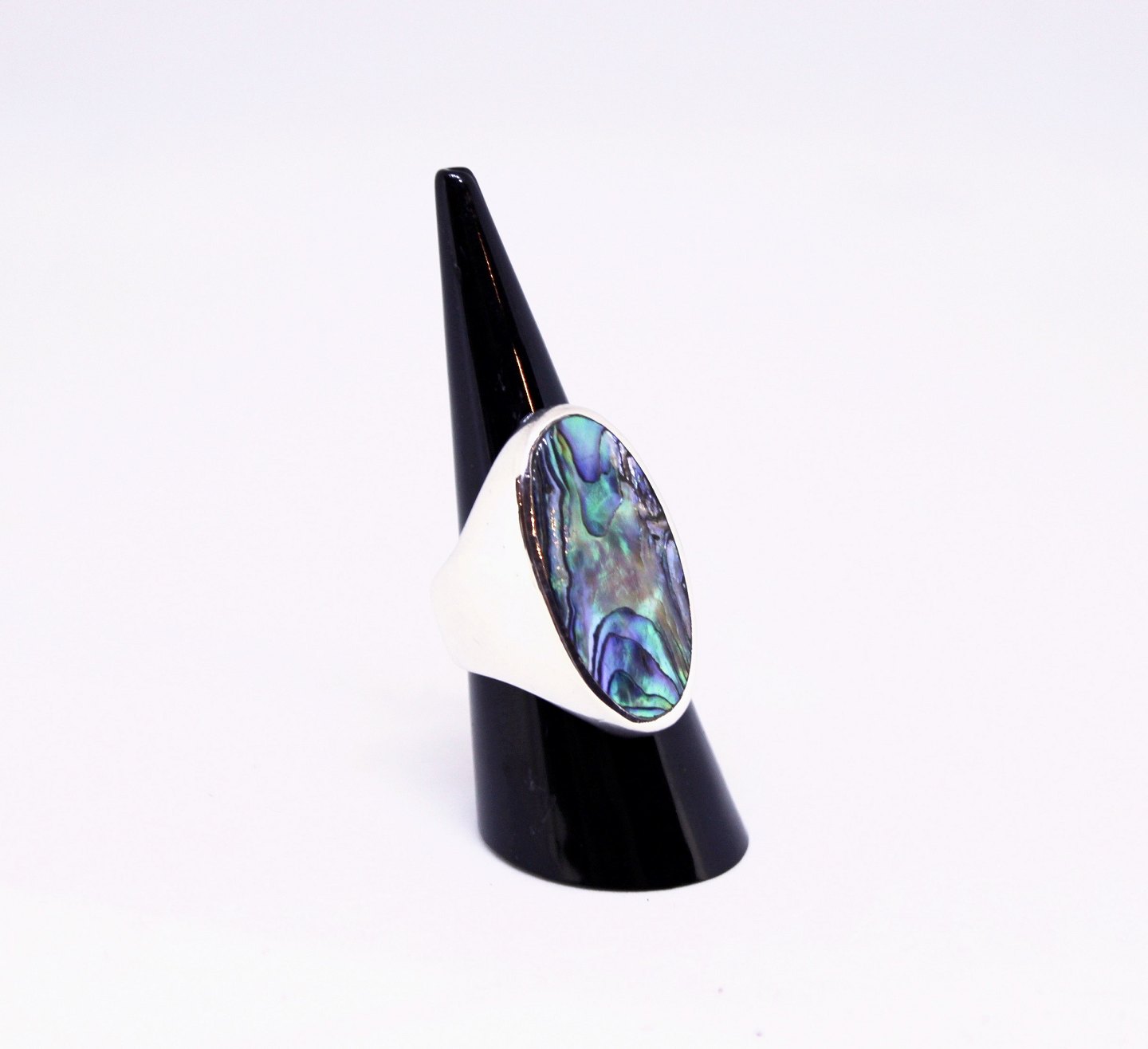 Ring decorated with colored mother of pearl, stamped ALE and of 925 sterling silver. The ring is in great vintage condition.