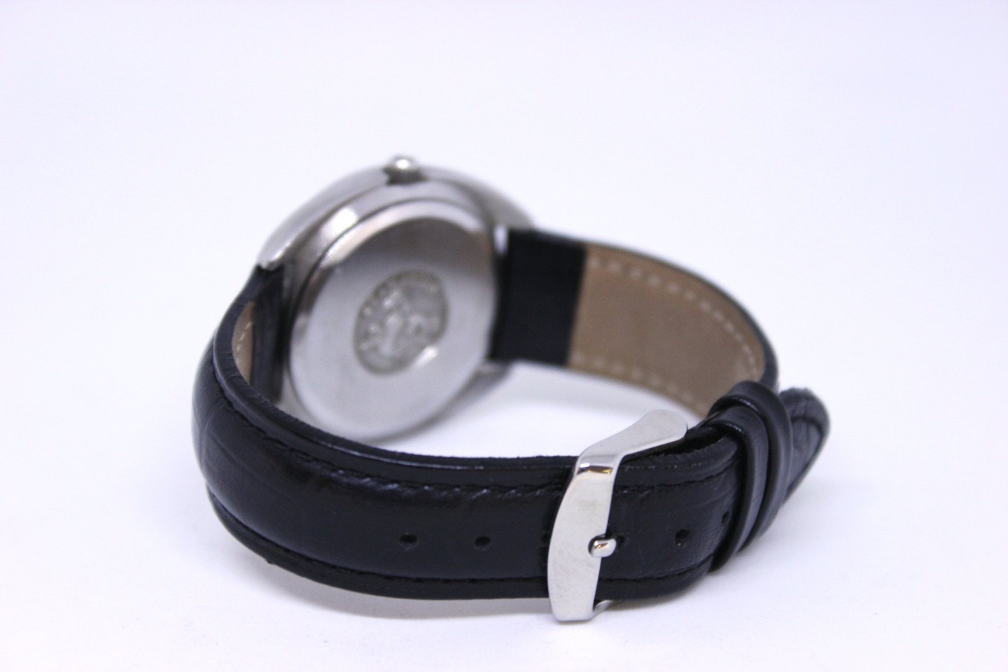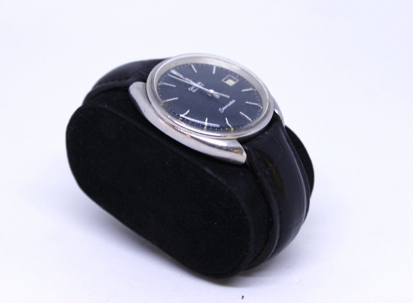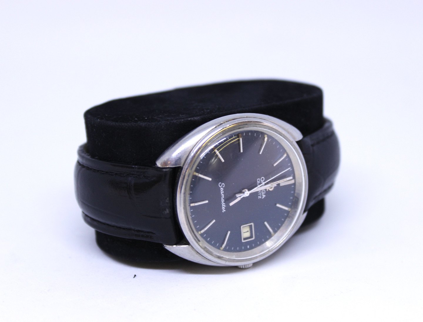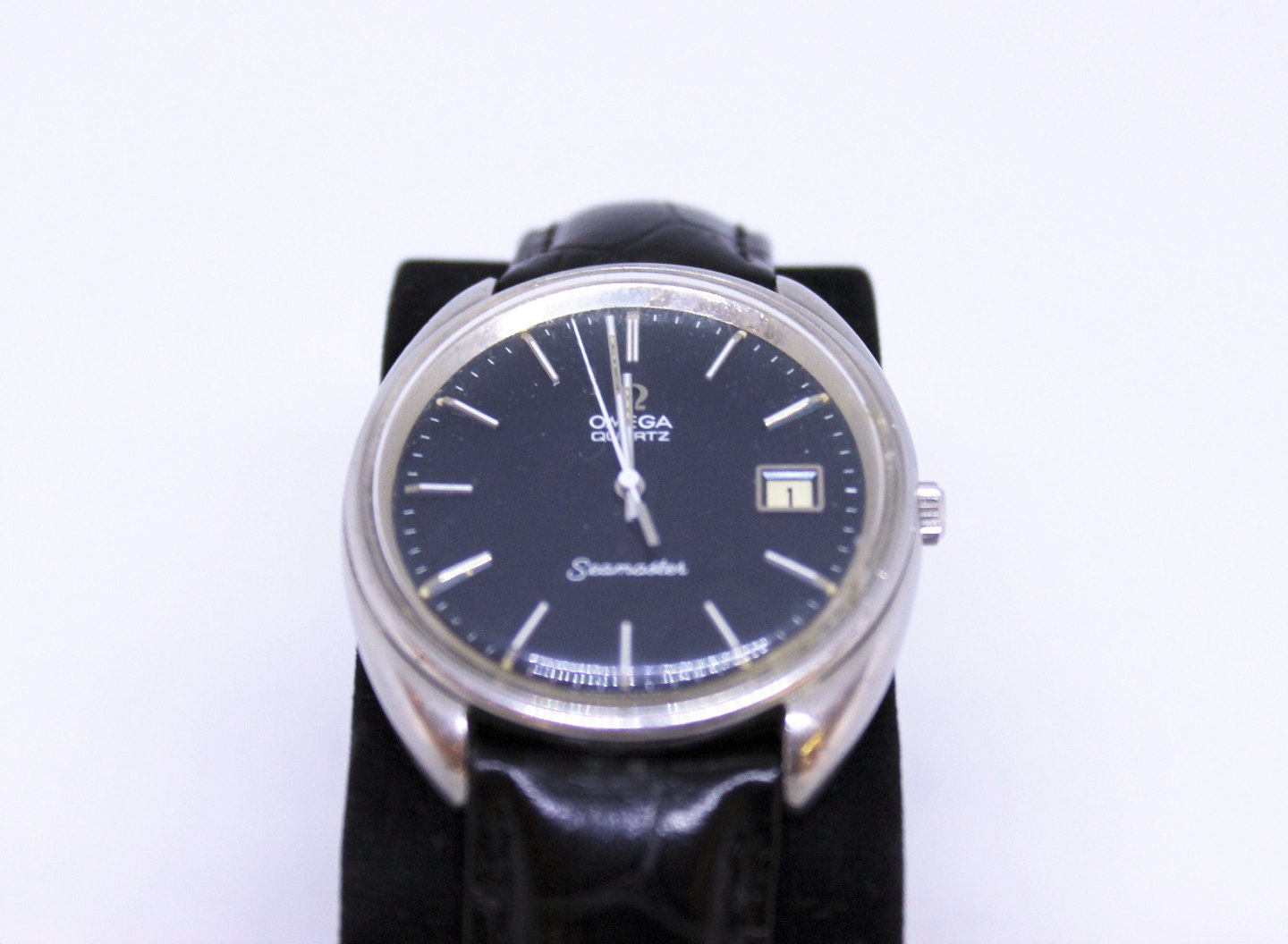 Omega Quartz Seamaster wrist watch, swiss made and with date. The watch is with a black leather strap and in great condition.