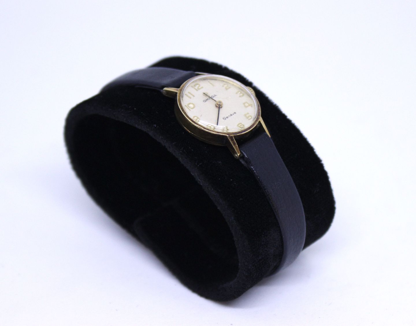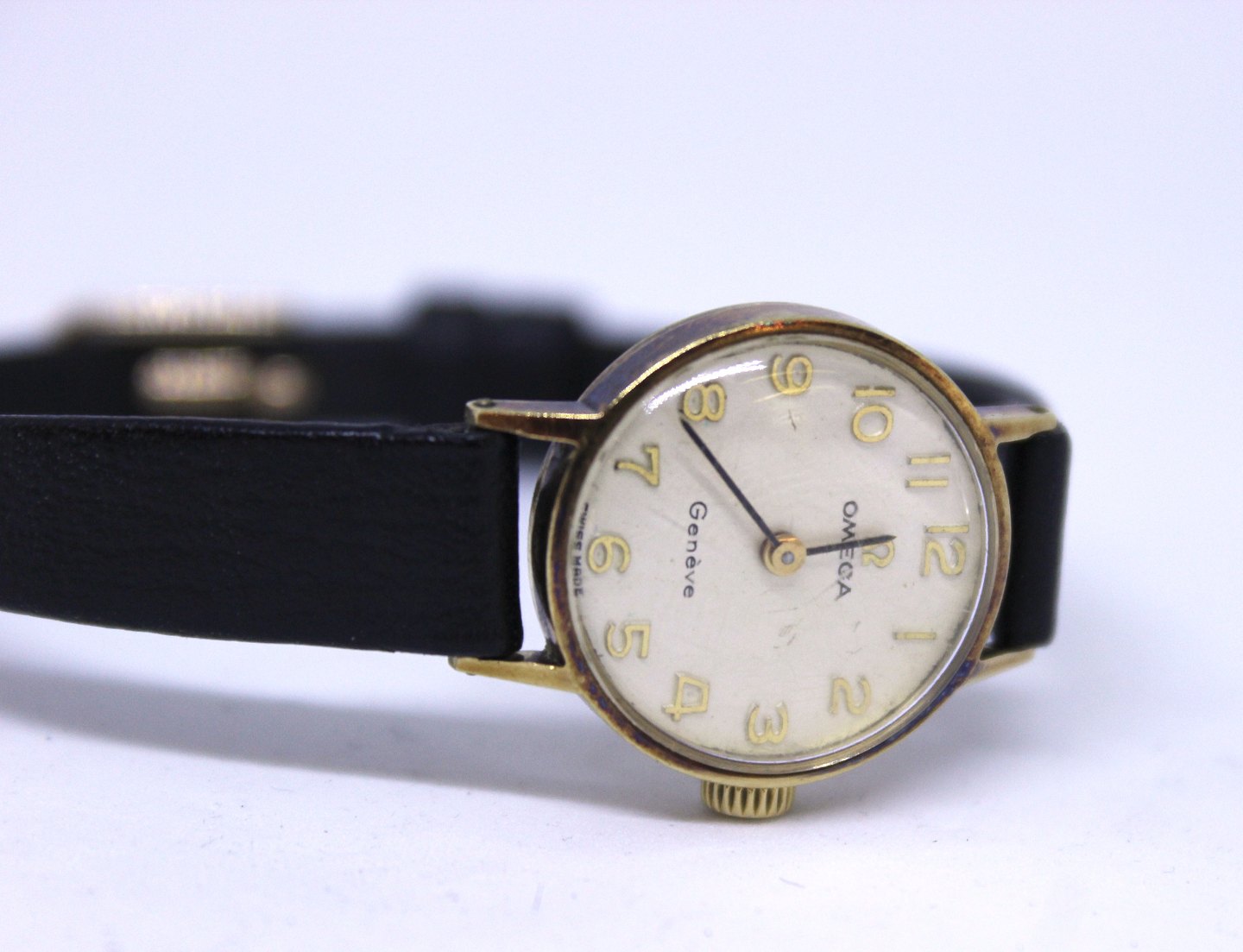 Omega Genéve women's wrist watch swiss made and with black Hirsch leather strap.
