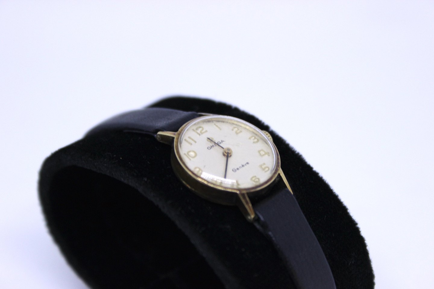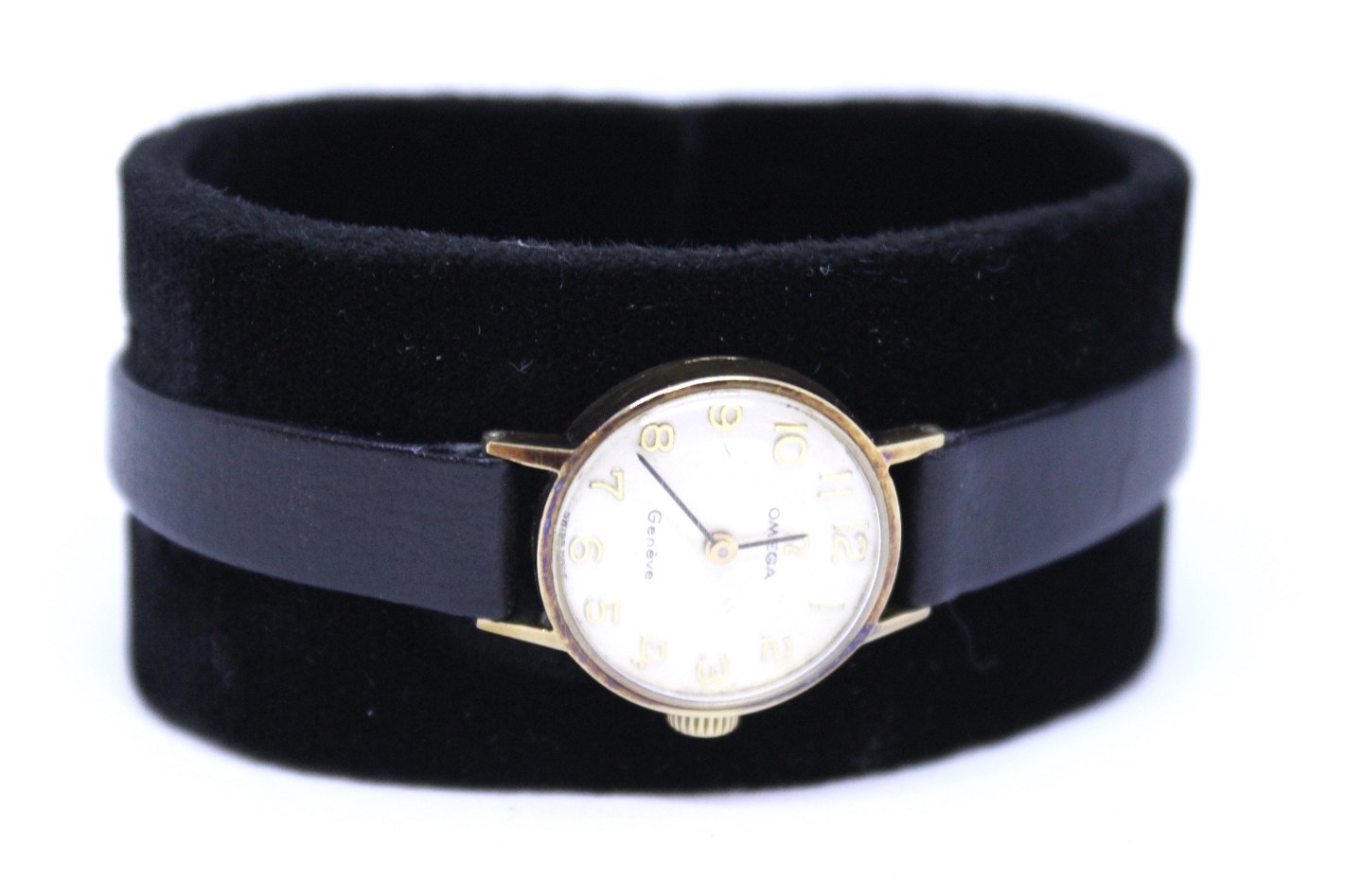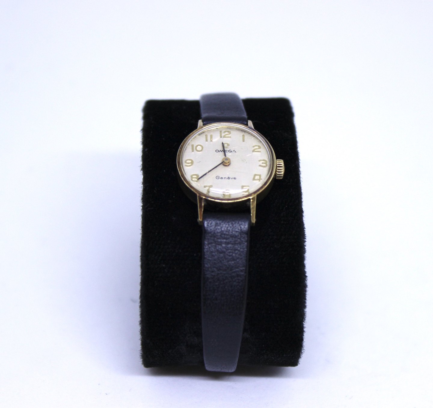 Omega Genéve women's wrist watch swiss made and with black Hirsch leather strap. The watch is in great vintage condition and the case is of 14 ct. gold.