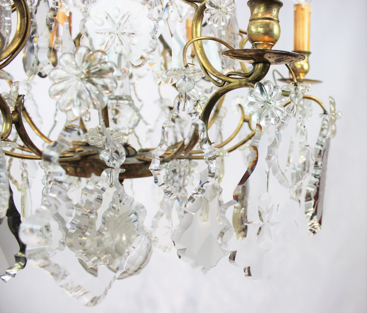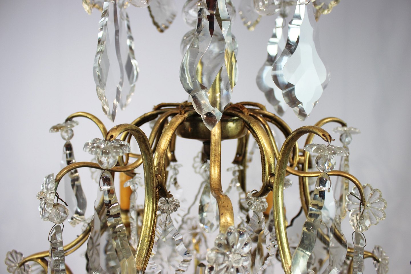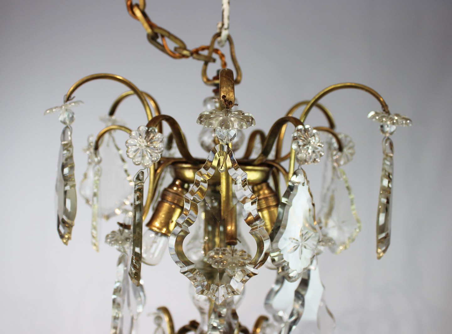 SoldChandelier of brass and polished prisms from France around the 1920s. The chandelier is in great antique condition.