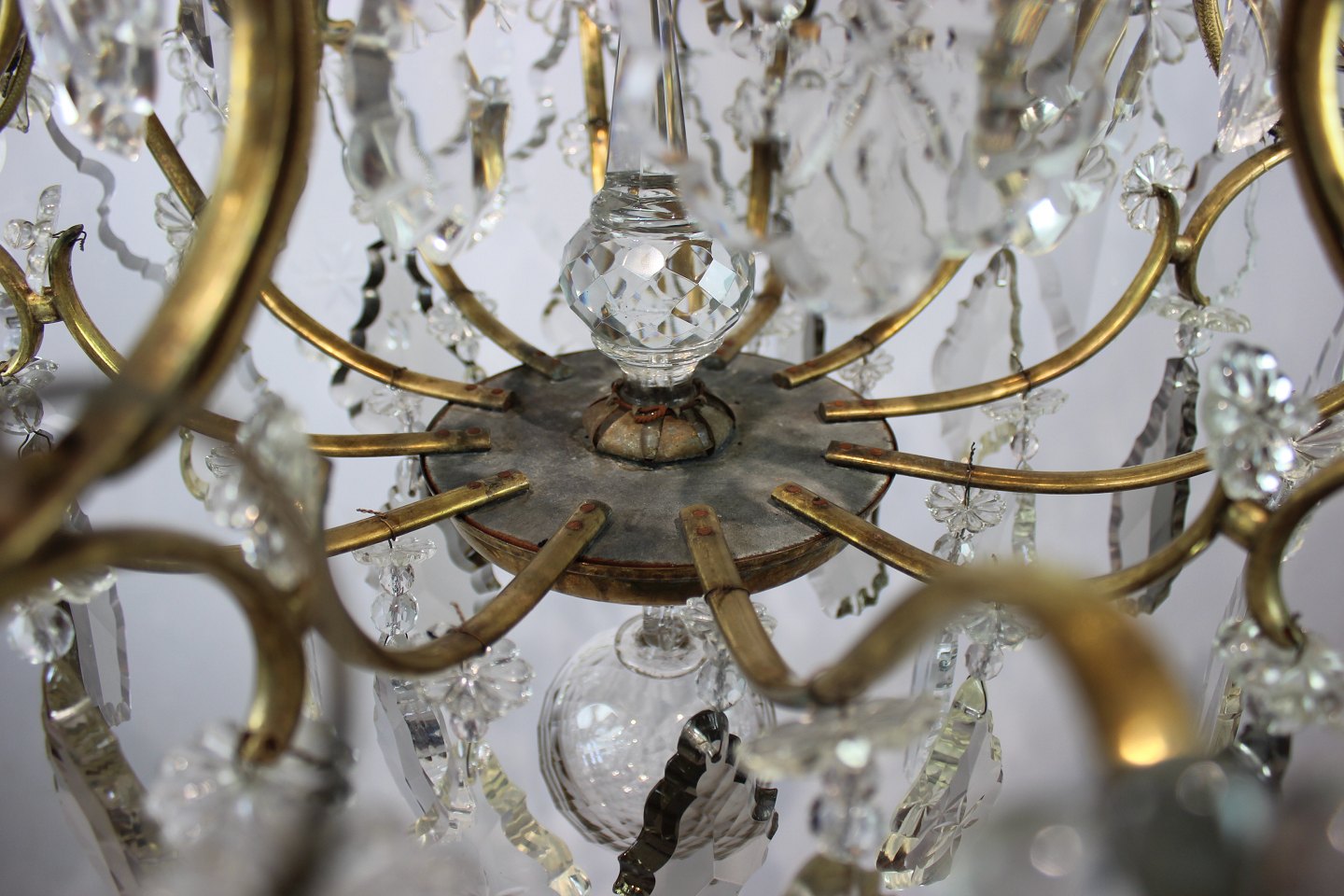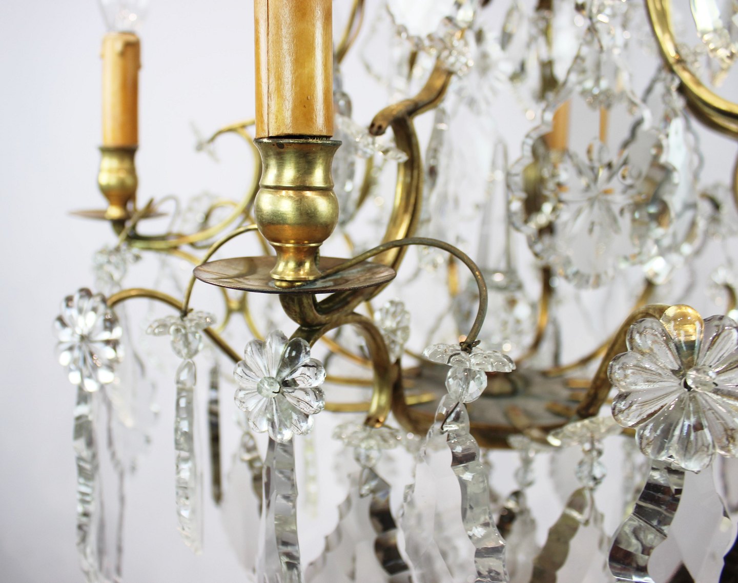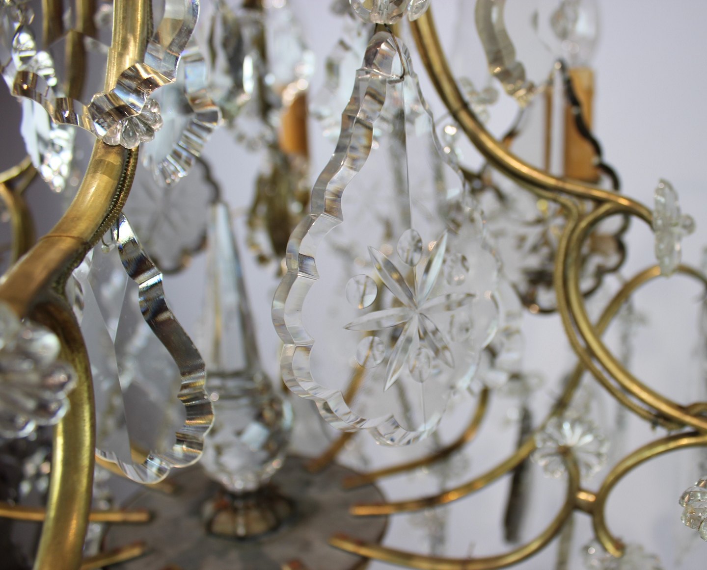 SoldChandelier of brass and polished prisms from France around the 1920s. The chandelier is in great antique condition.