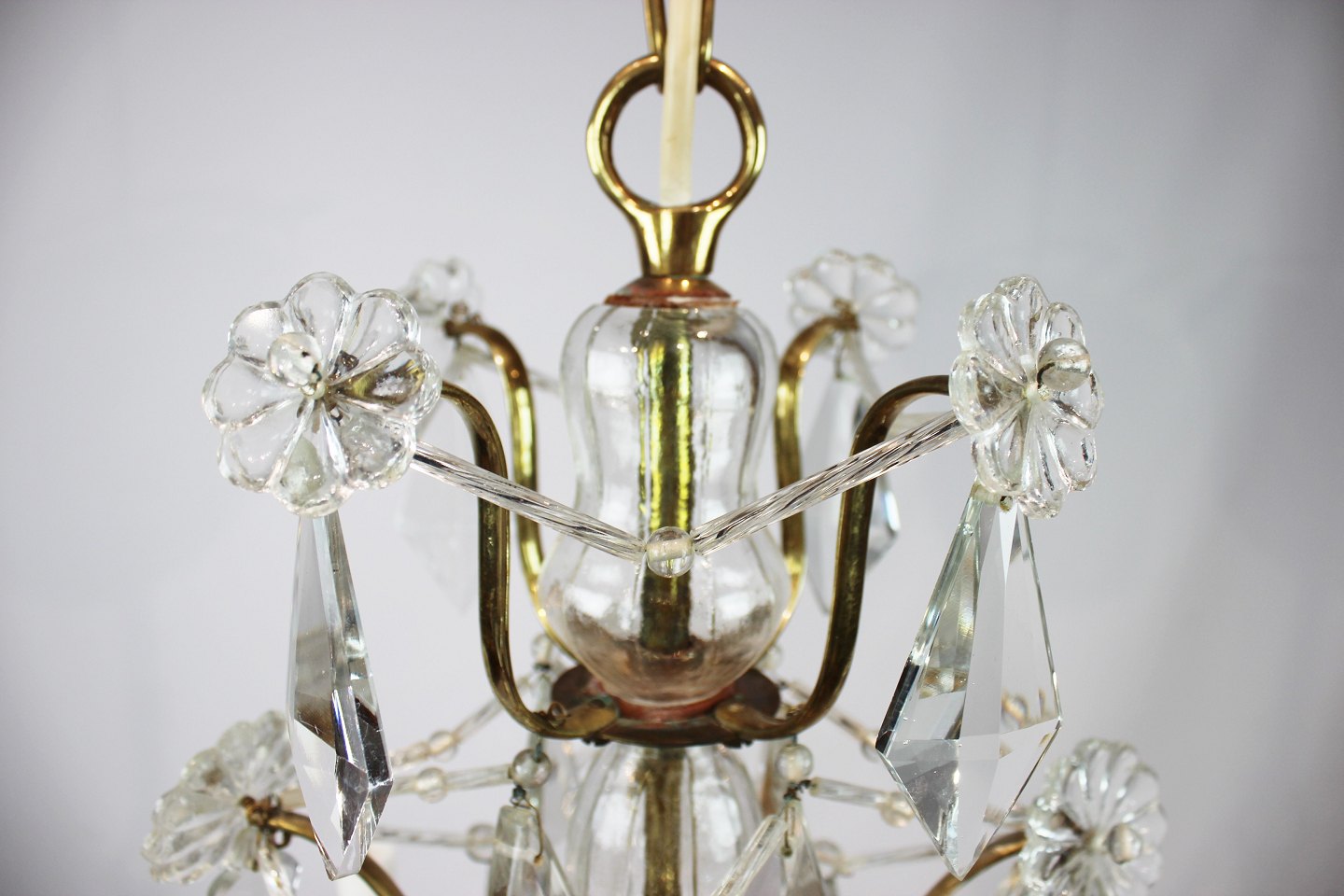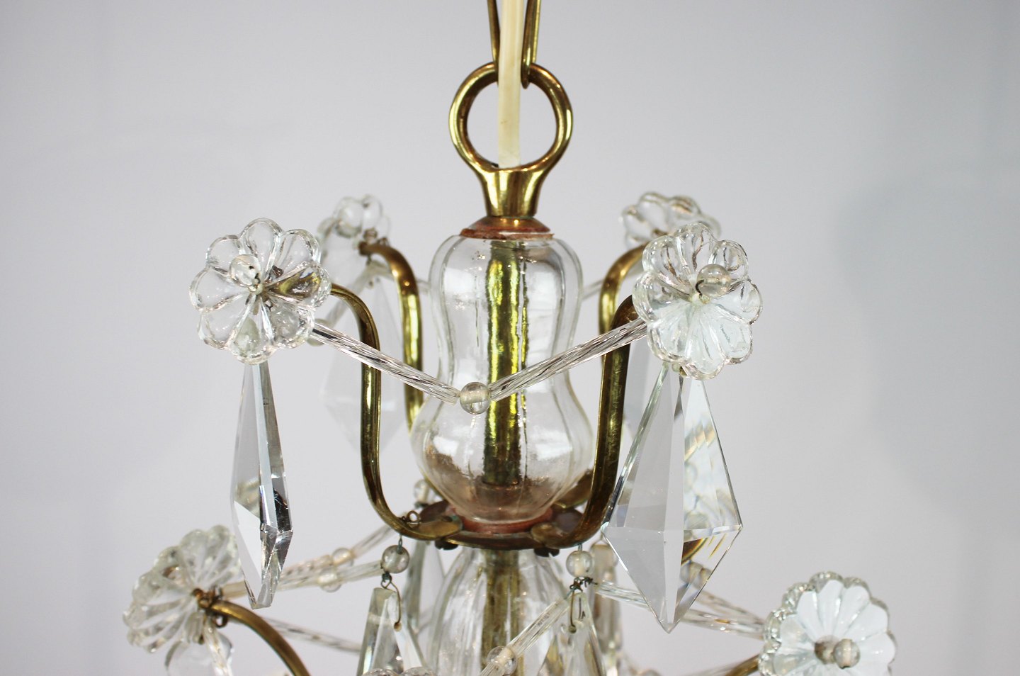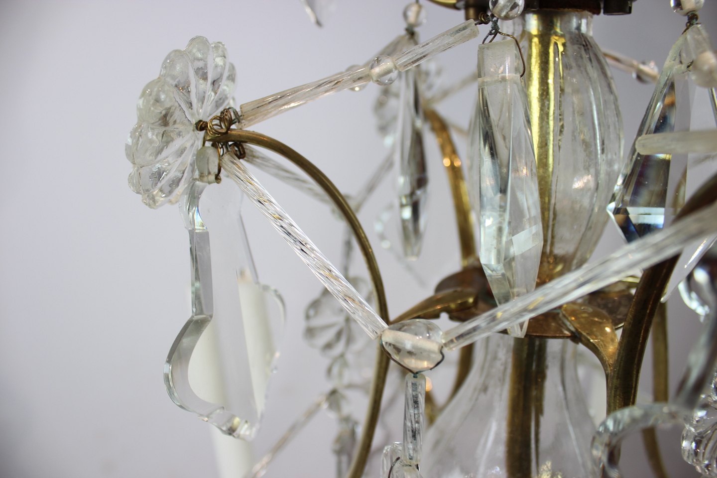 SoldChandelier of brass and polished prisms from France around the 1920s. The chandelier is in great antique condition.