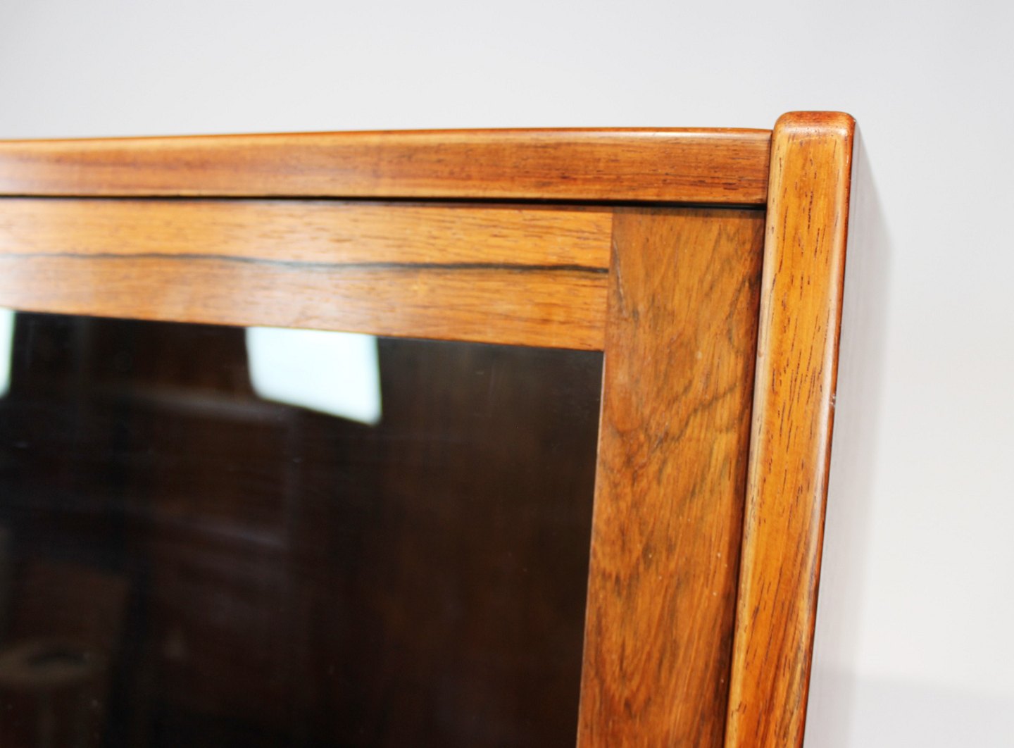 The display cabinet with glass doors and lower part with sliding doors in rosewood represents a period piece of Danish design from the 1960s.