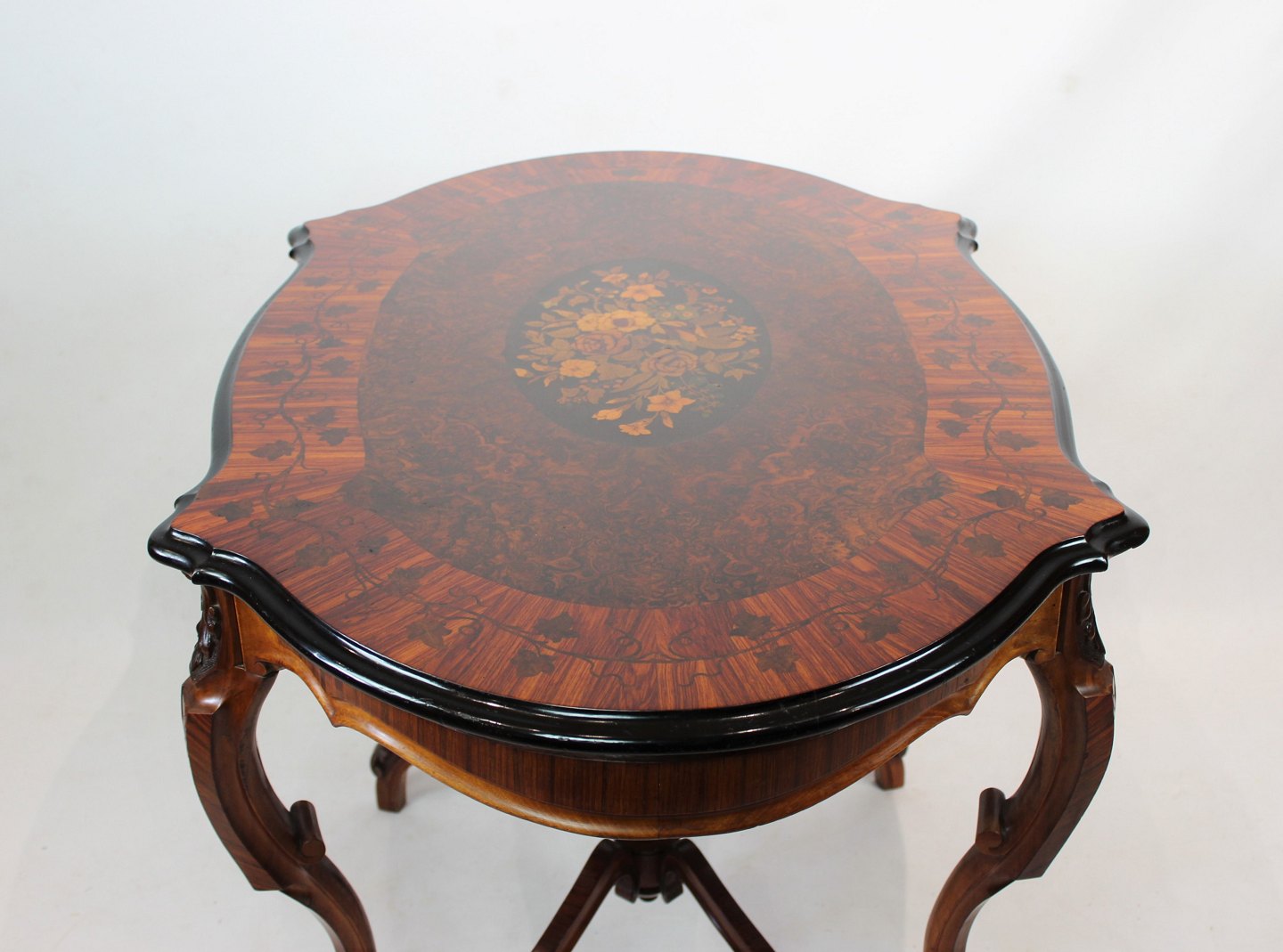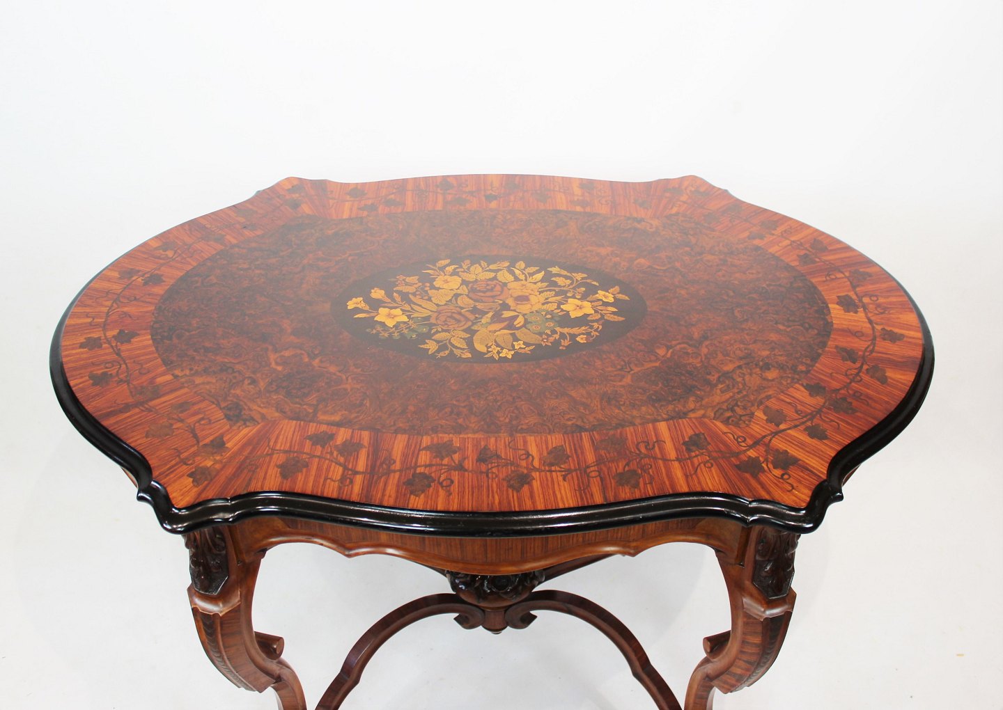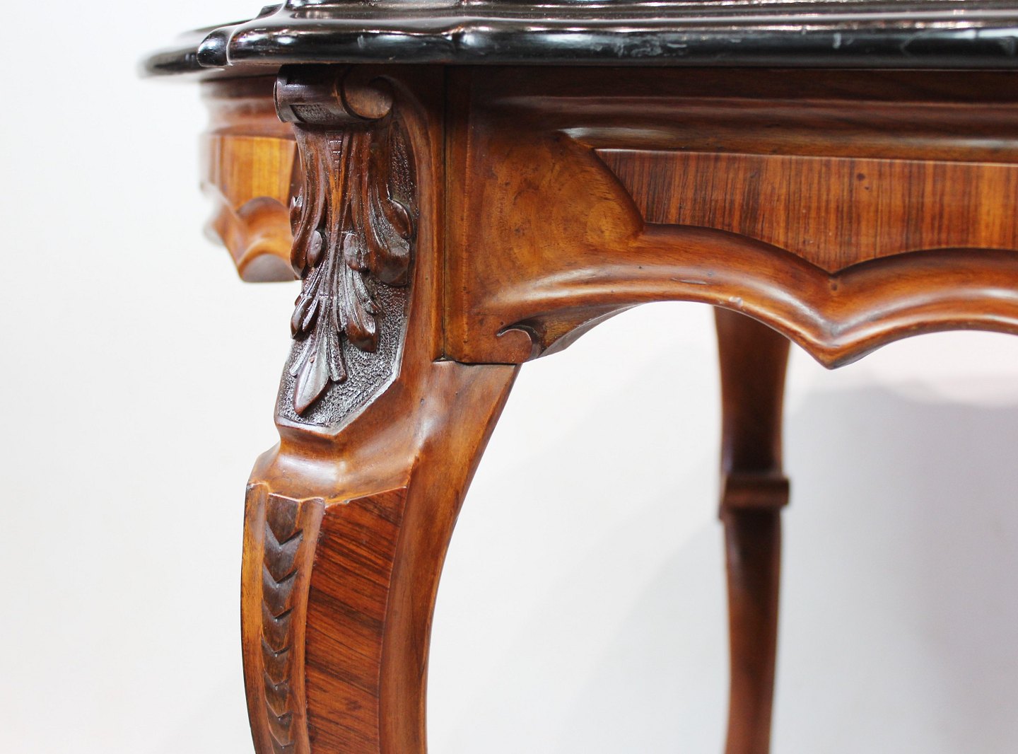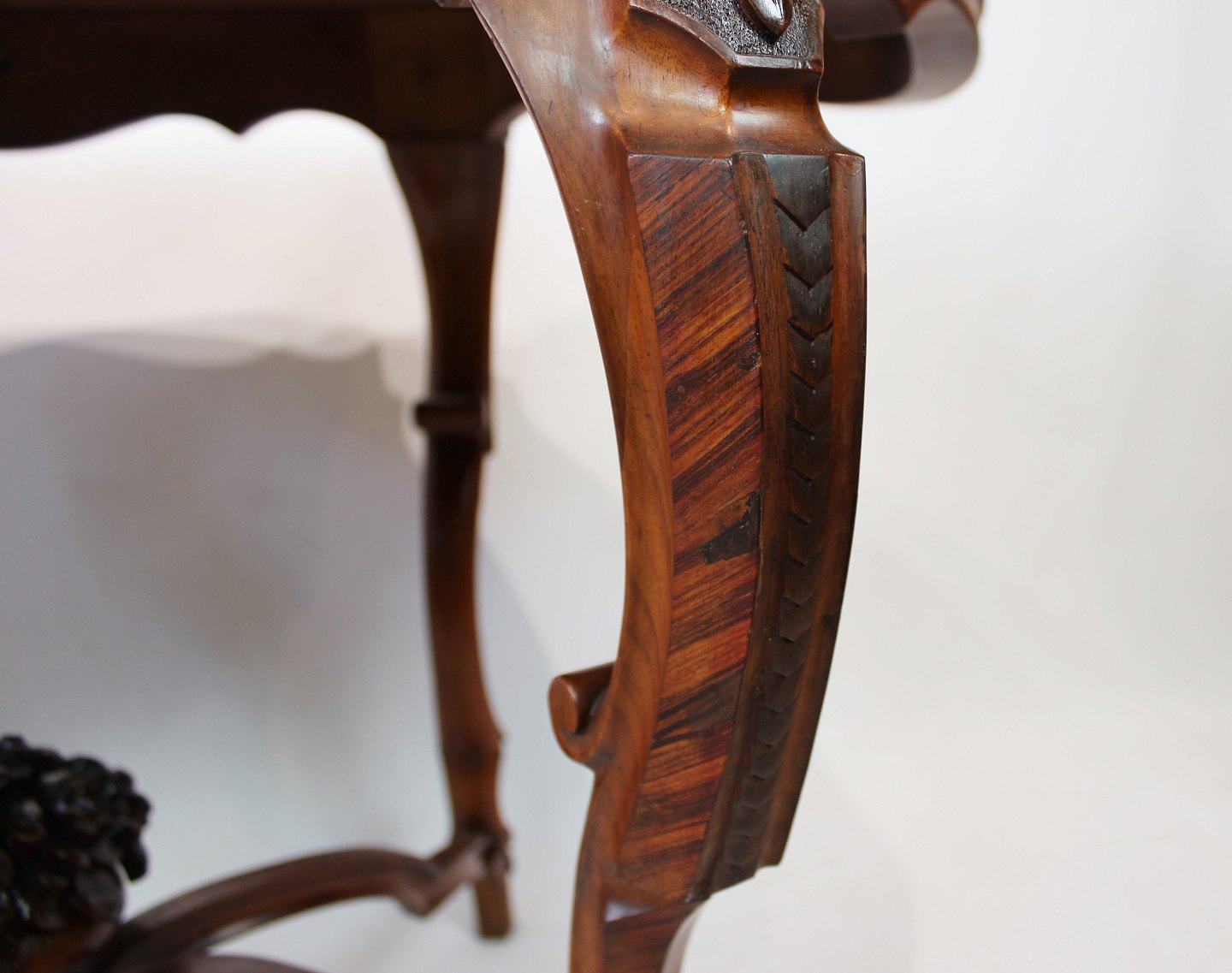 New Rococo pedestal table of walnut with carvings and inlaid intarsia of fruit wood from the 1880s.