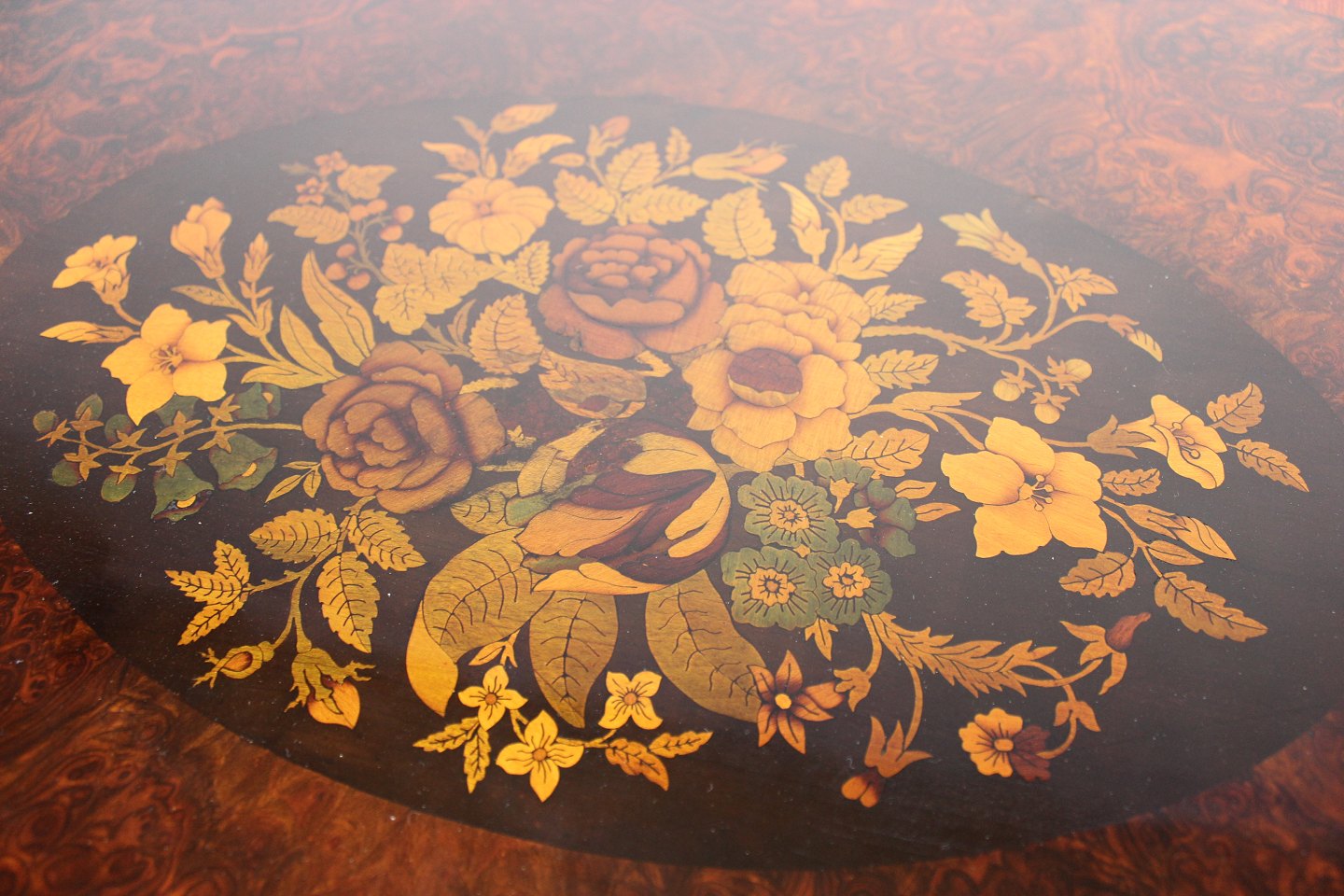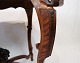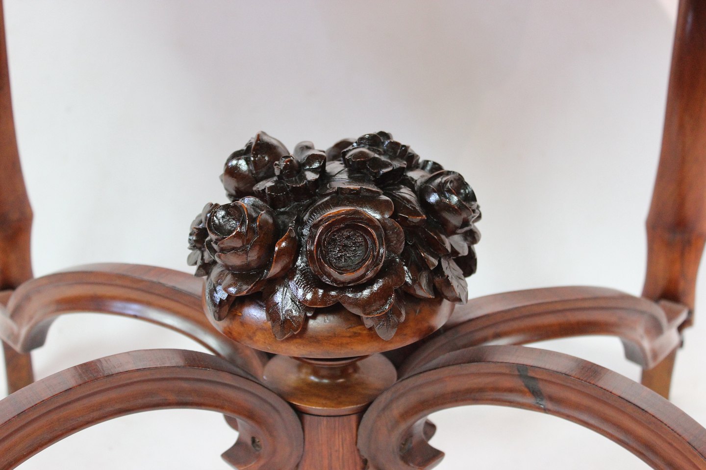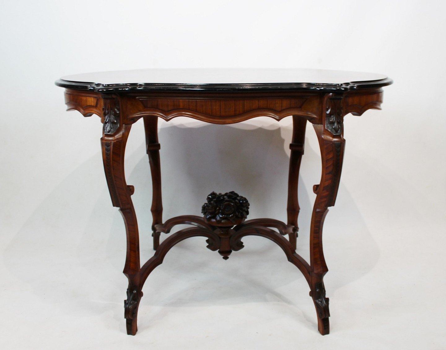 New Rococo pedestal table of walnut with carvings and inlaid intarsia of fruit wood from the 1880s.
