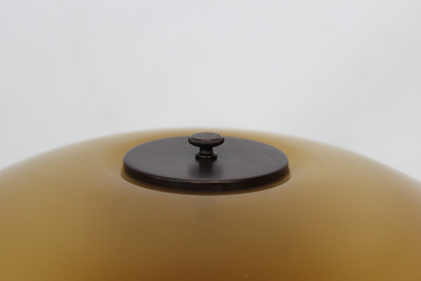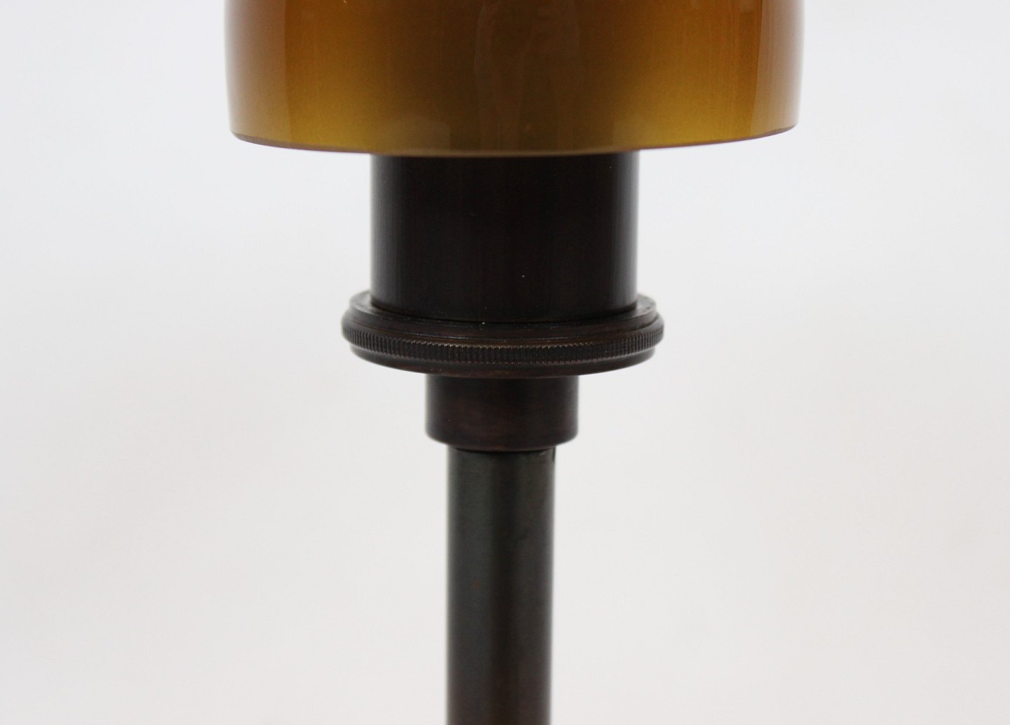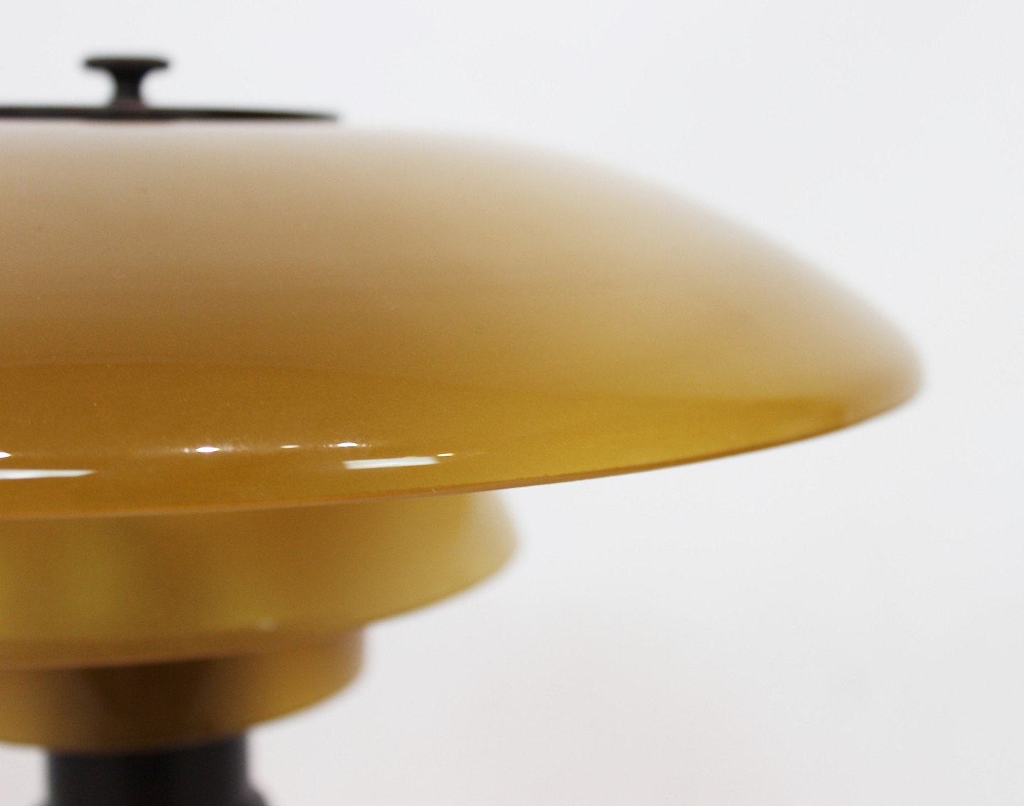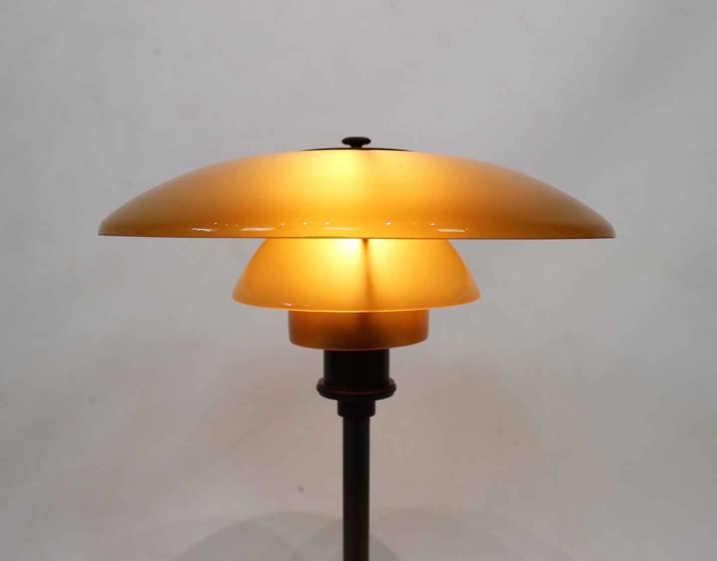 SoldPH 3/2 tablelamp with shades of amber colored glass and frame of burnished brass, designed by Poul Henningsen and manufactured by Louis Poulsen in the beginning of the 1930s. The lamp is in great vintage condition.