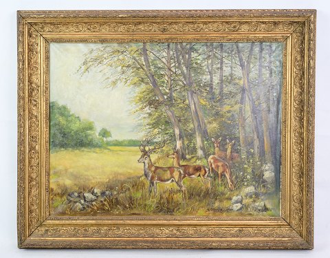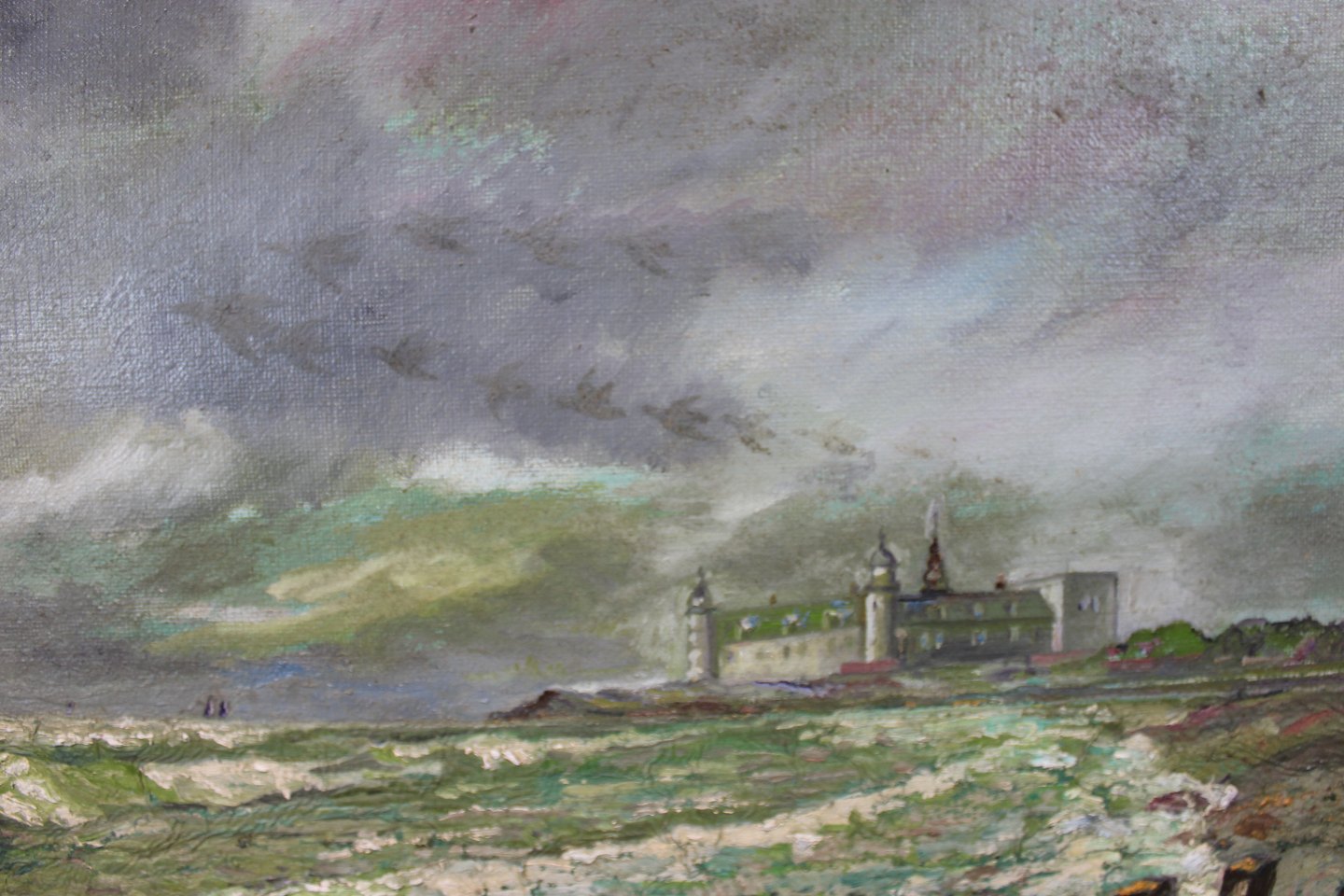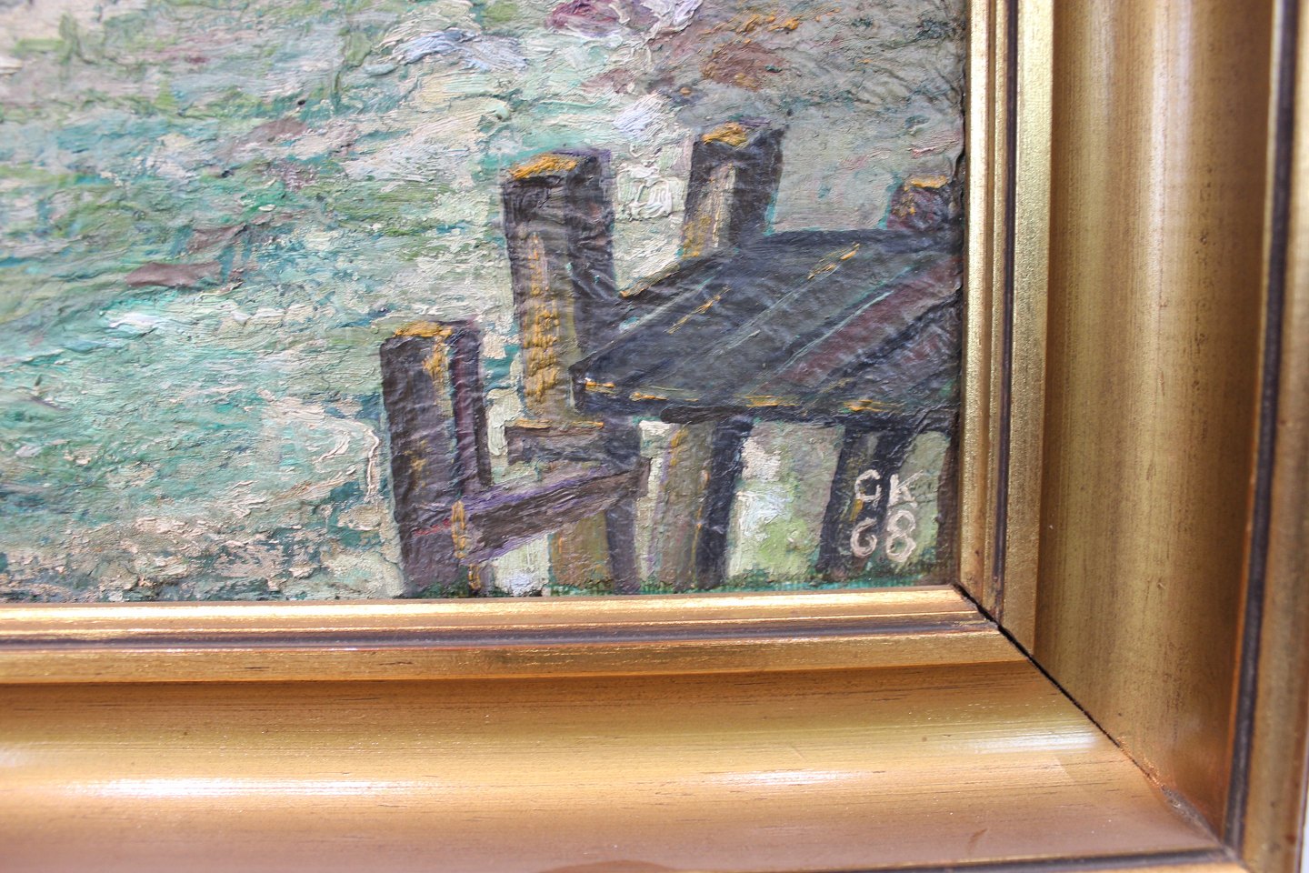 Painting with of the Danish castle Kronborg motif and gilded frame signed GK from 1968. The painting is in great vintage condition.
