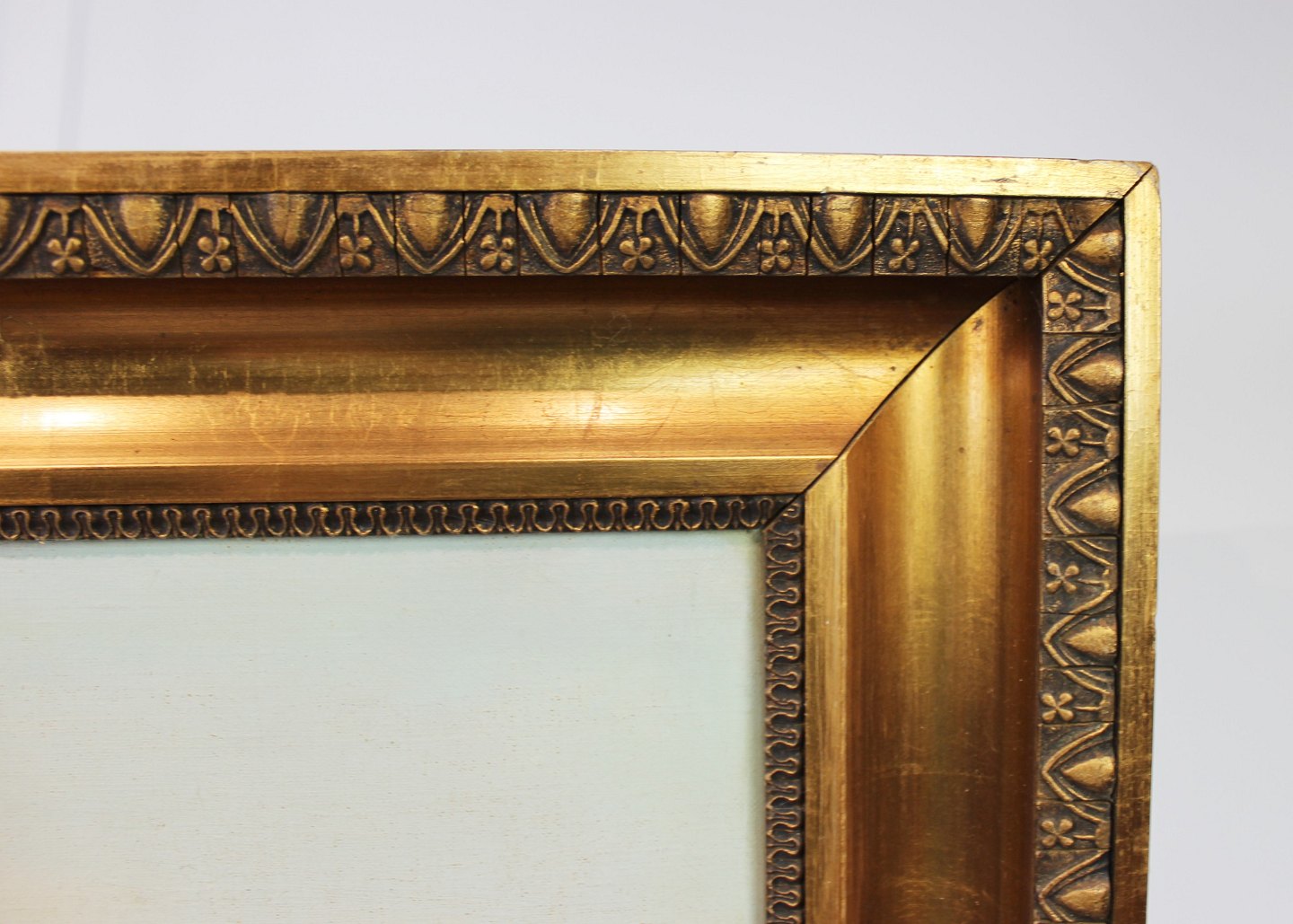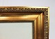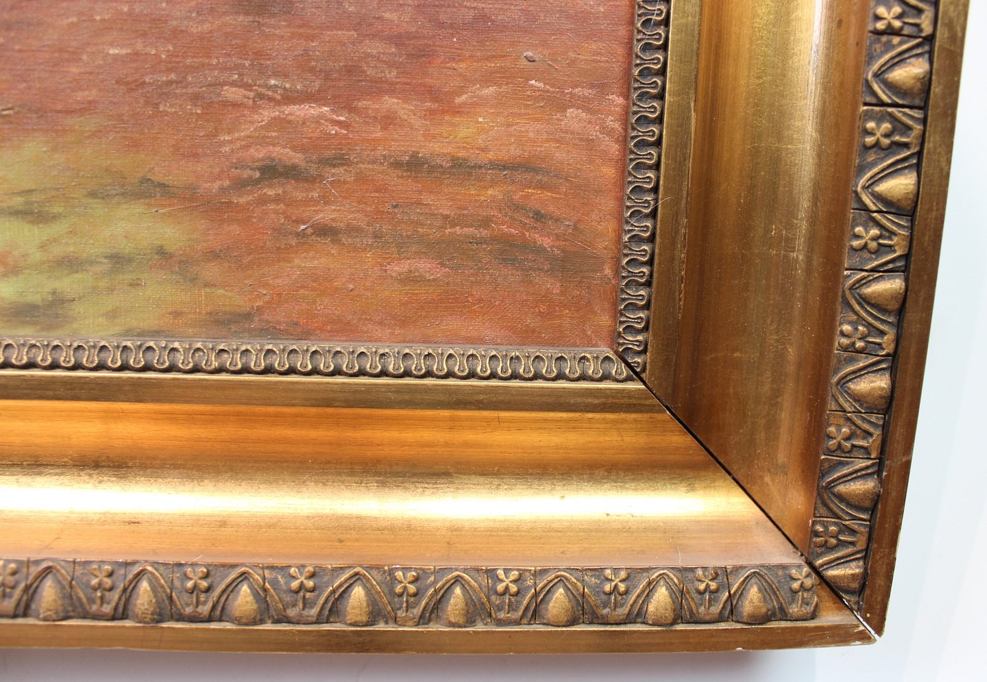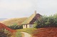 Oil painting in warm colors with motif of fields and thatched house with gilded frame.