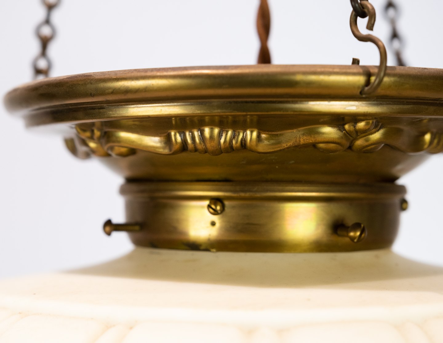 Antik Ampel med hvidt opal glas med messing kant og ophæng, fra omkring år 1860.