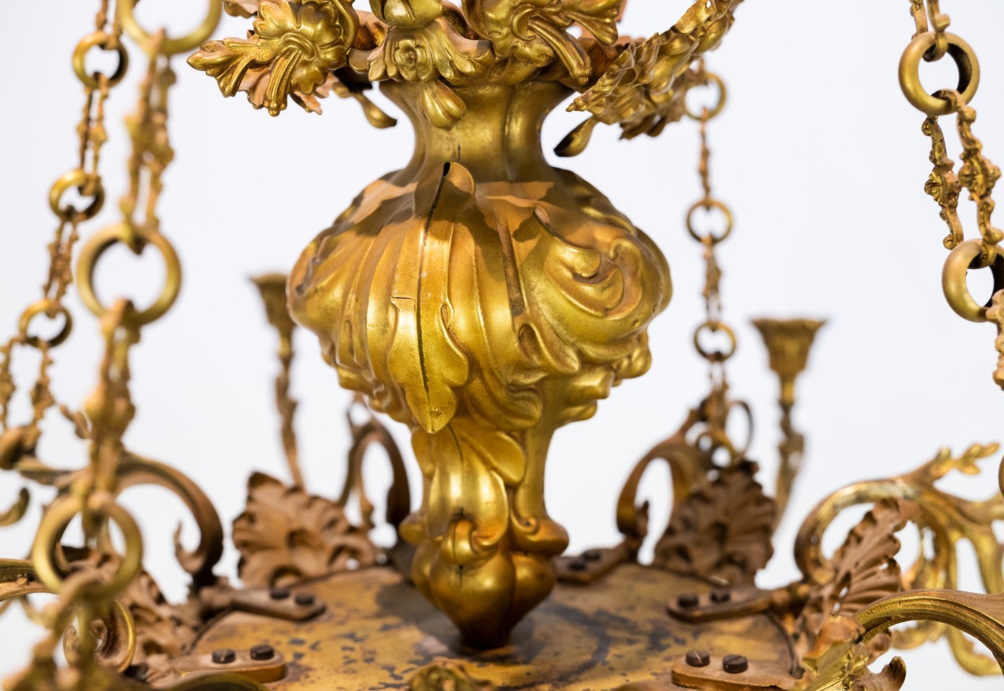SoldFrench church chandelier of bronze with beautiful decorations and eight arms for candle lights from around the 1880s. The chandelier is in great antique condition.