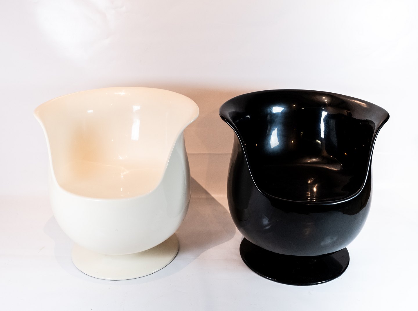The chairs are made of hard plastic in both white and black, giving them a modern and stylish look that was characteristic of the time. Their teacup-like shape adds a fun and interesting dimension to any decor and makes them conversation starters.