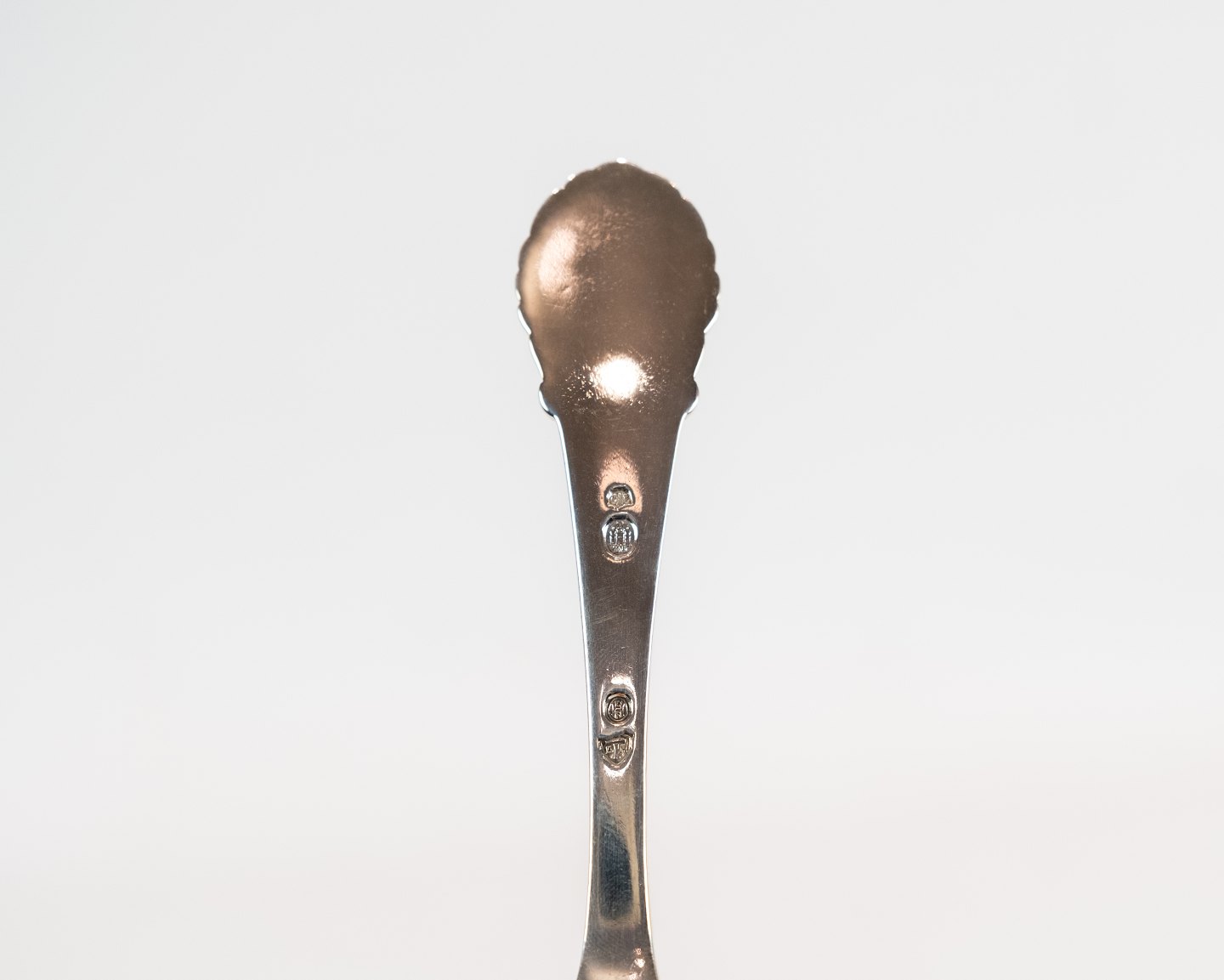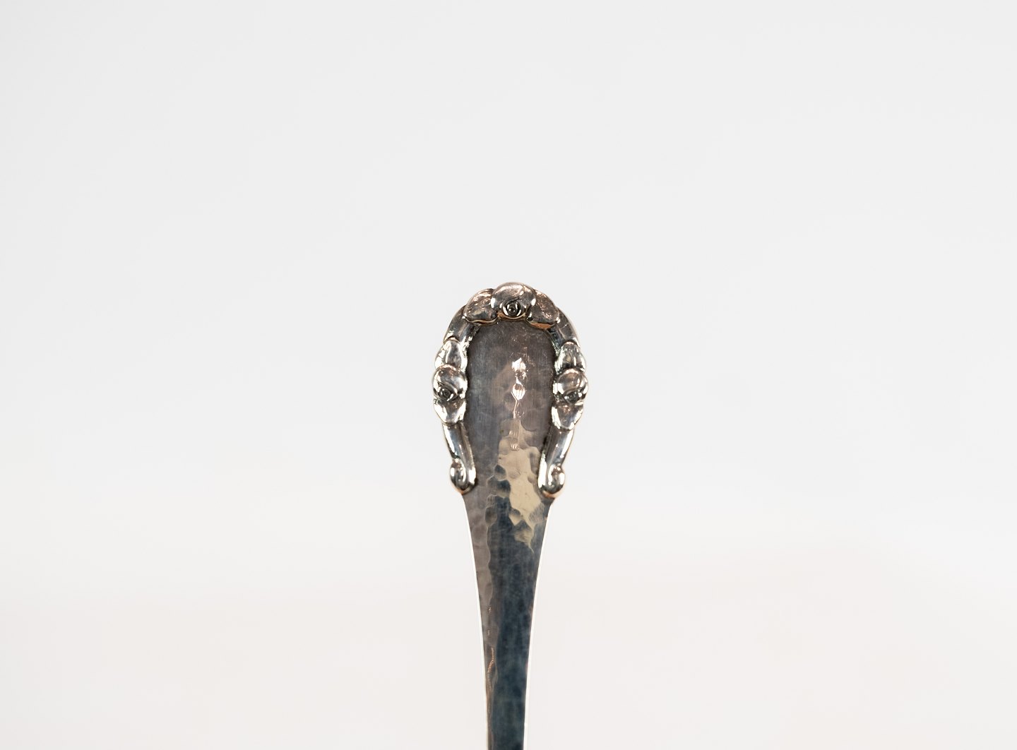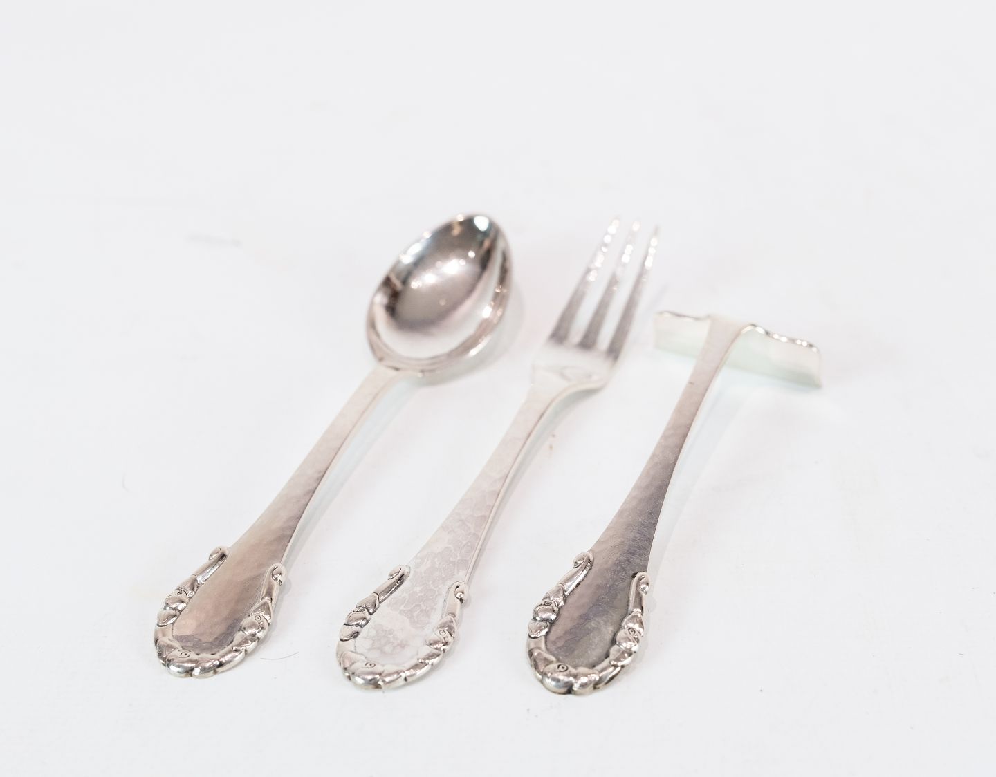 SolgtSæt af barnebestik bestående af ske, gaffel og skubopper i tretårnet sølv.