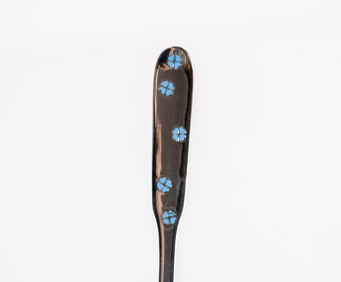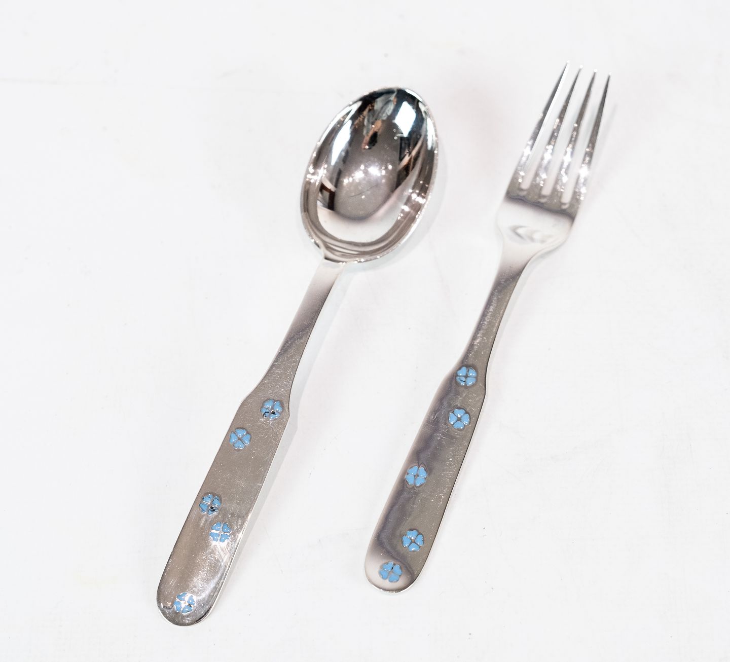 SoldSet of children's spoon and fork decorated with blue flowers of 925 sterling silver.