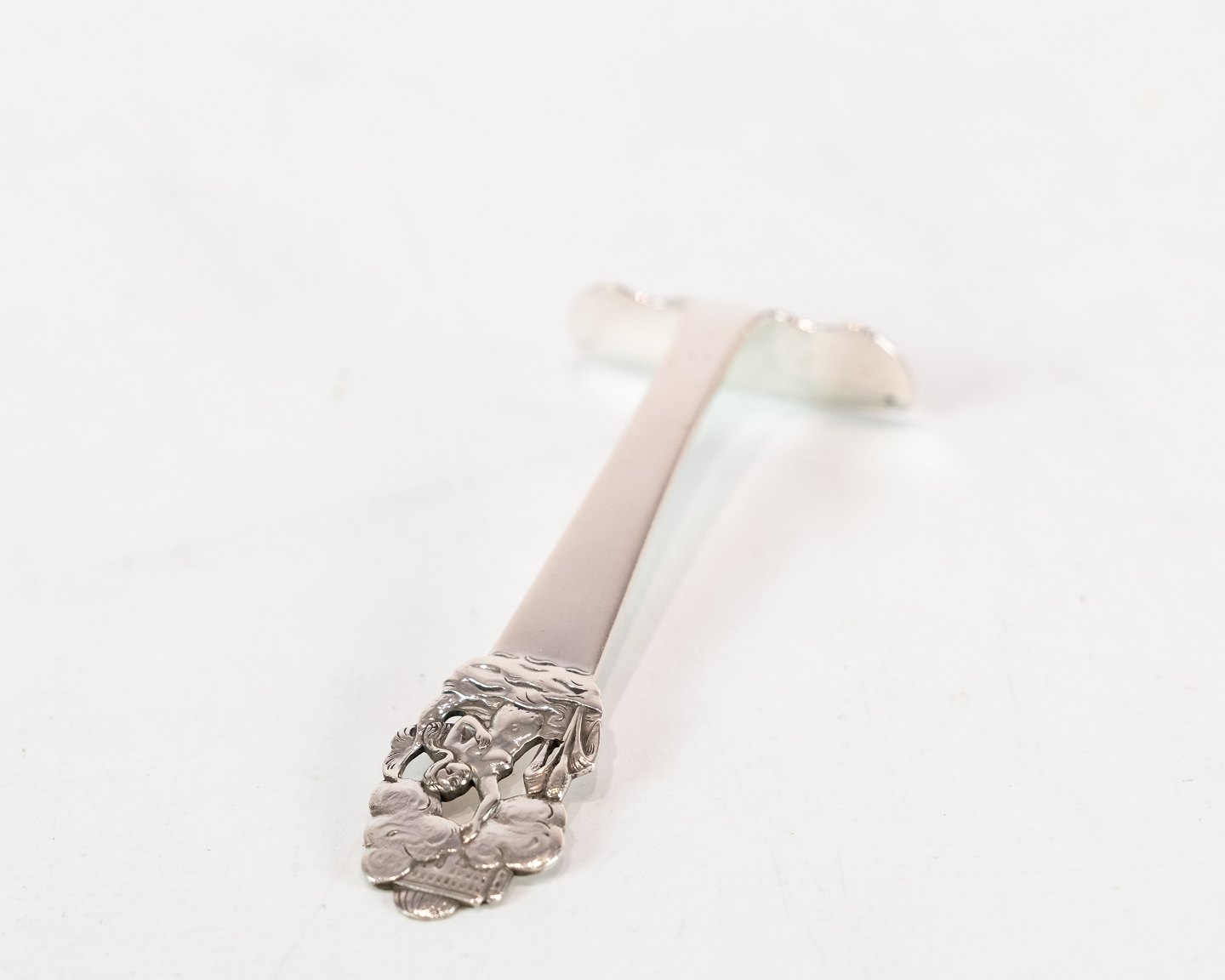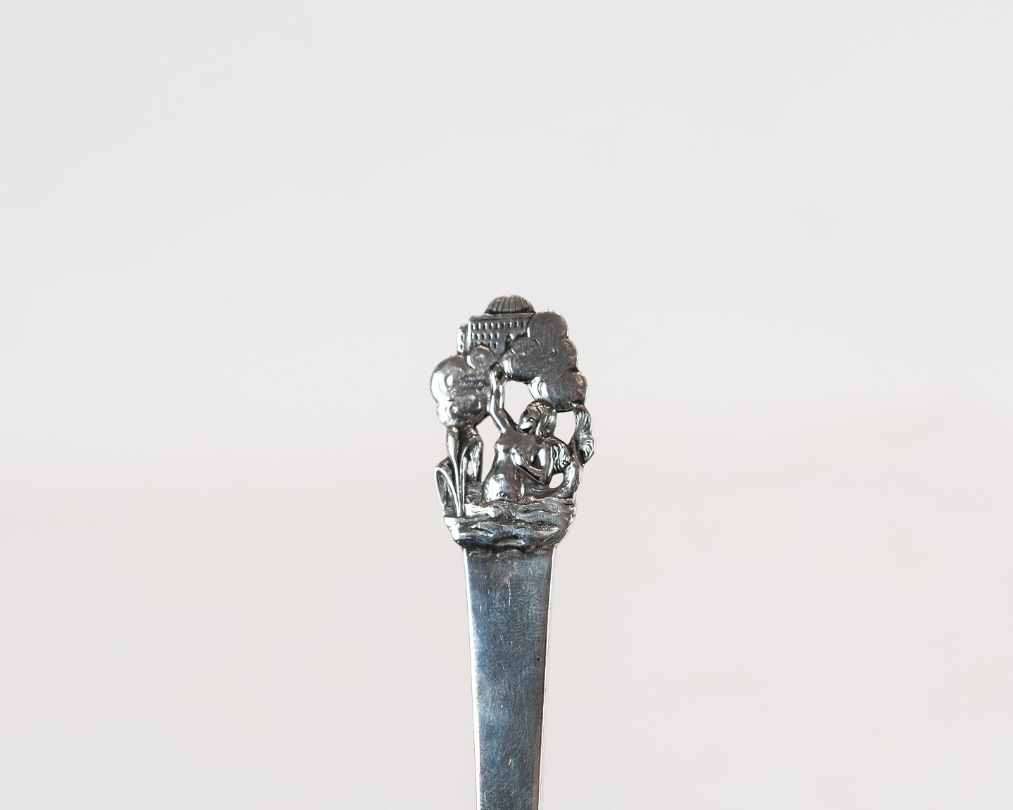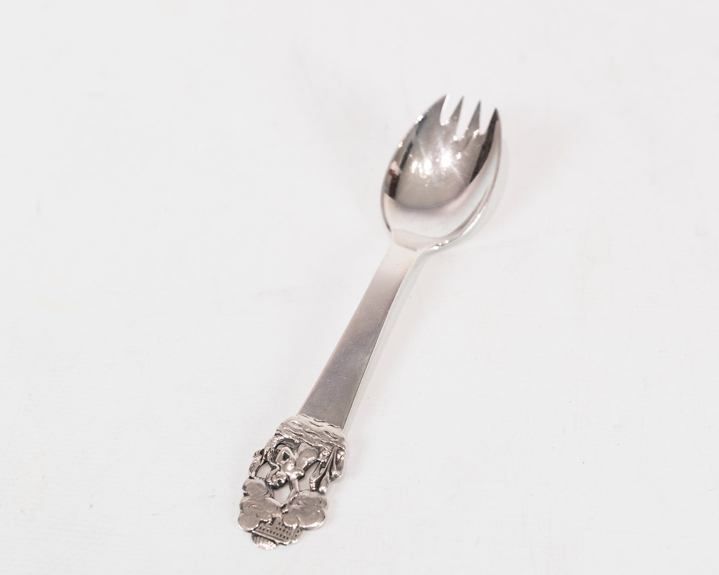 Children's spoon and pusher for food with motif of H.C. Andersen's The Little Mermaid in hallmarked silver.