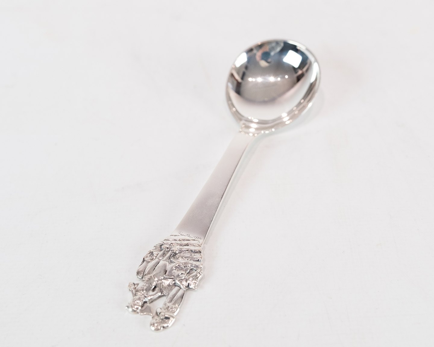 Two different children's spoons with motif of H.C. Andersen in hallmarked silver.