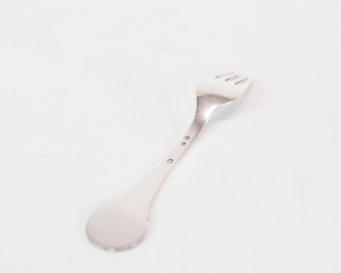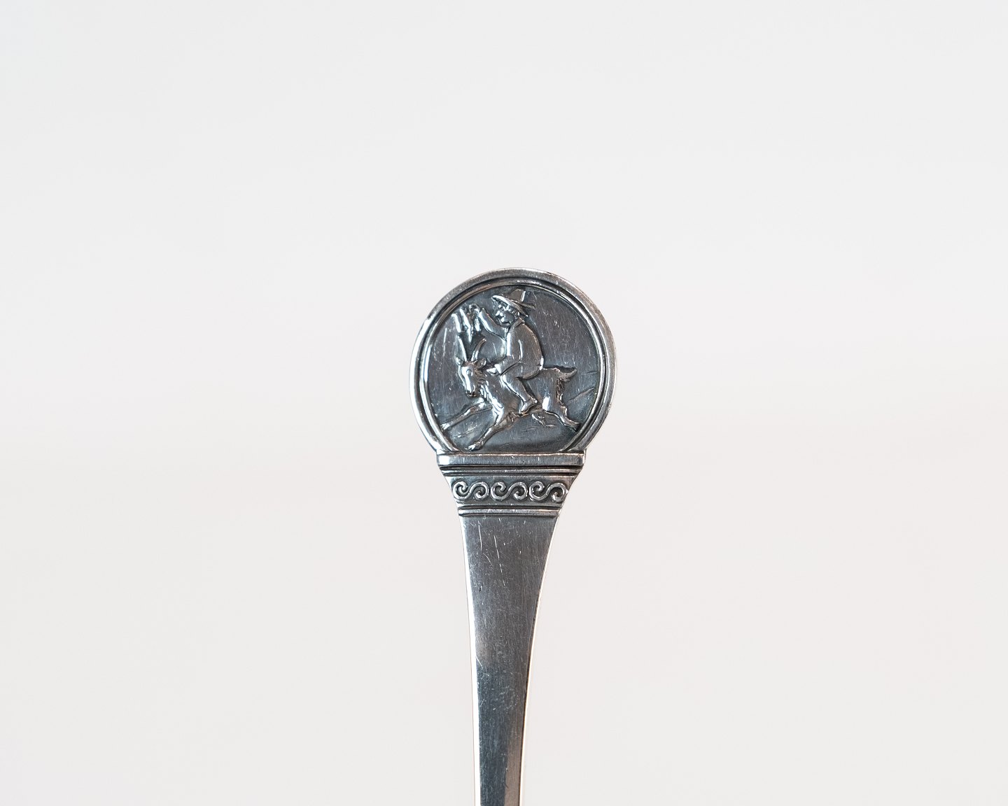 Children's fork with motif of H.C. Andersen's Clumsy Hans in hallmarked silver.