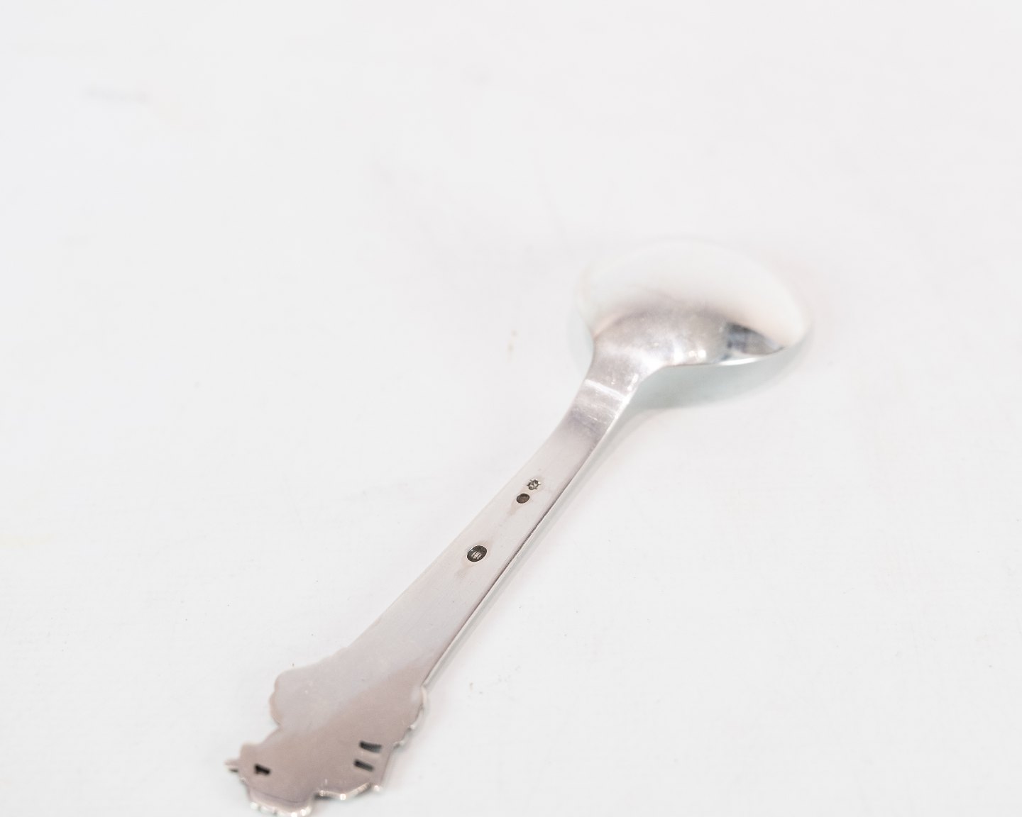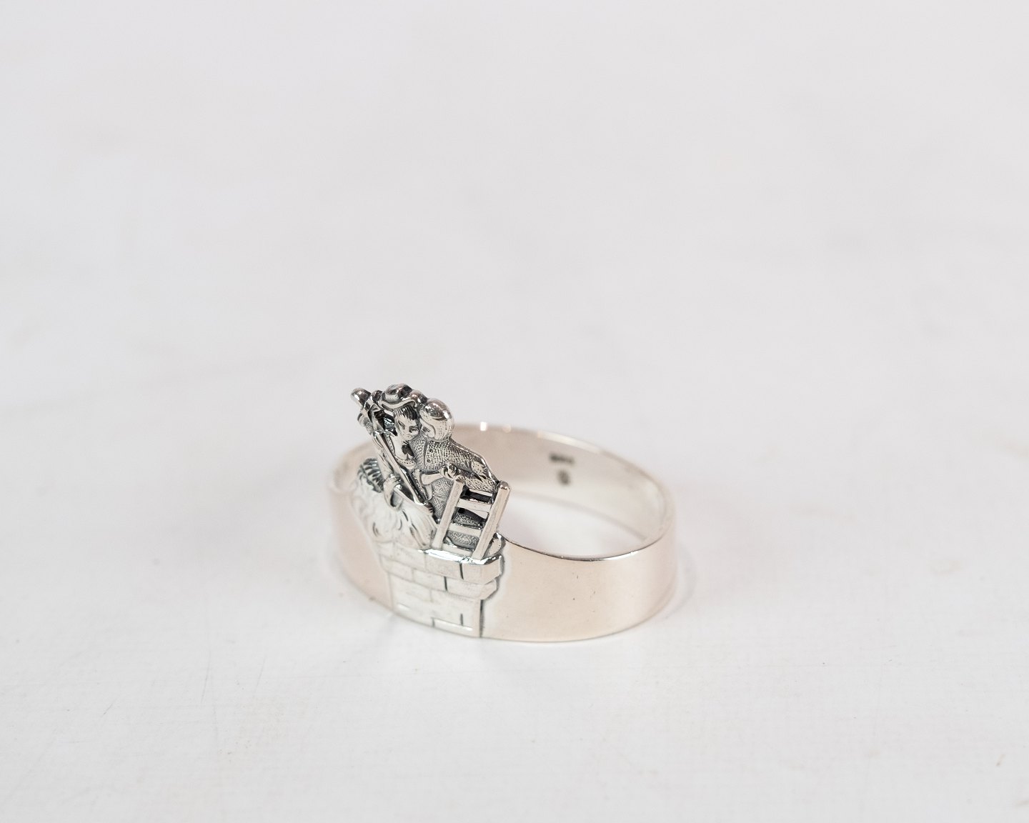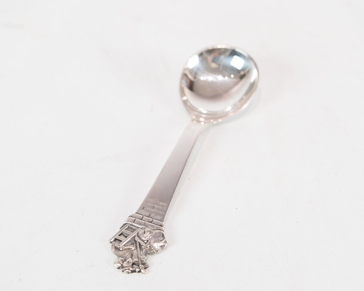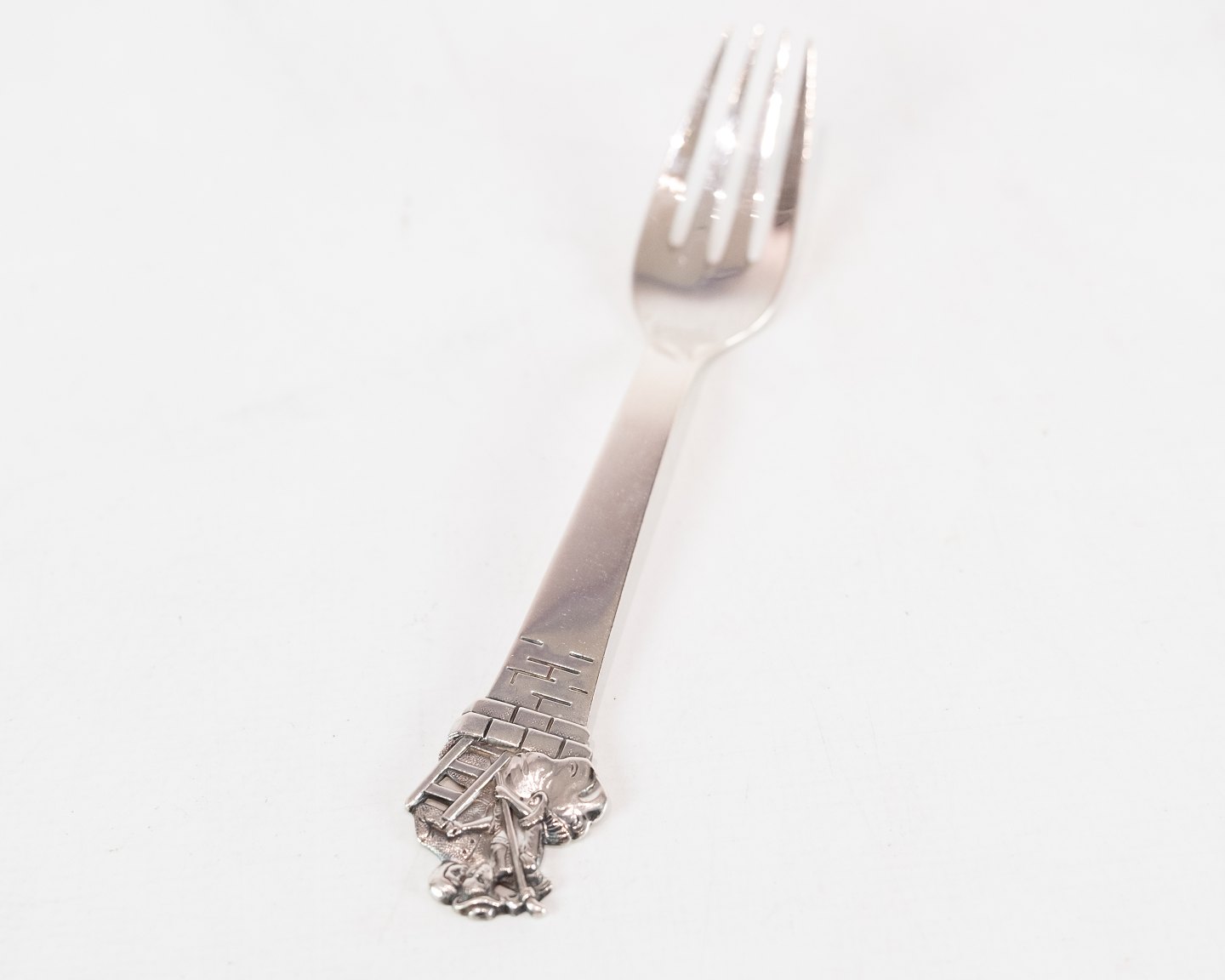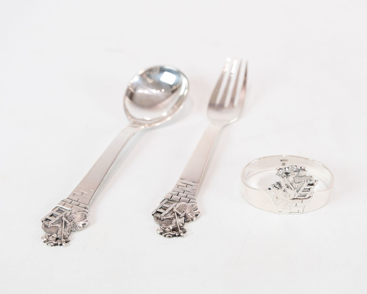 SolgtBarneske, gaffel. servietringen er solgt med motif af H.C. Andersens Skorstensfejeren i tretårnet sølv.