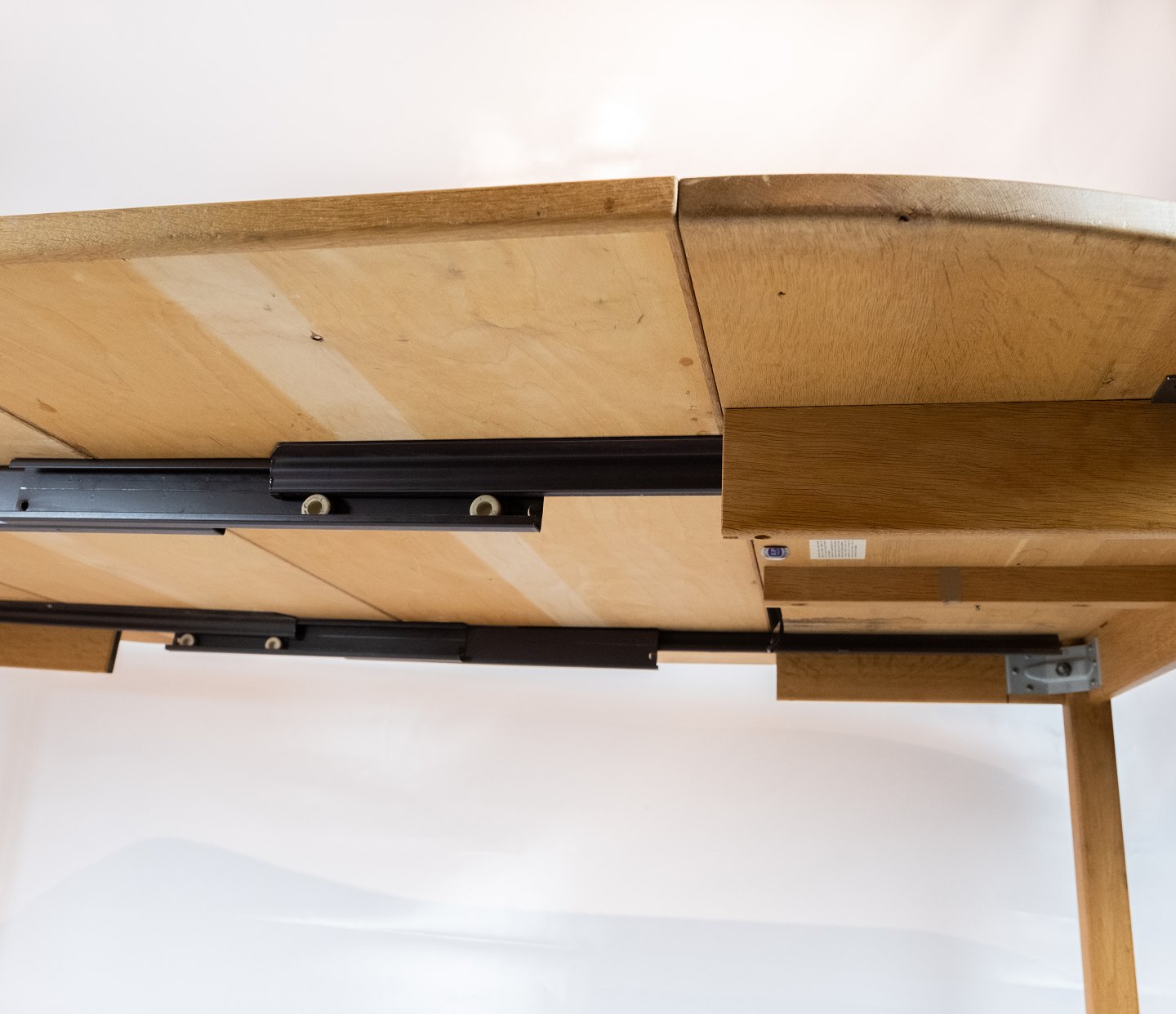 Dining table of oak with extension leaves designed by Kurt Østervig.