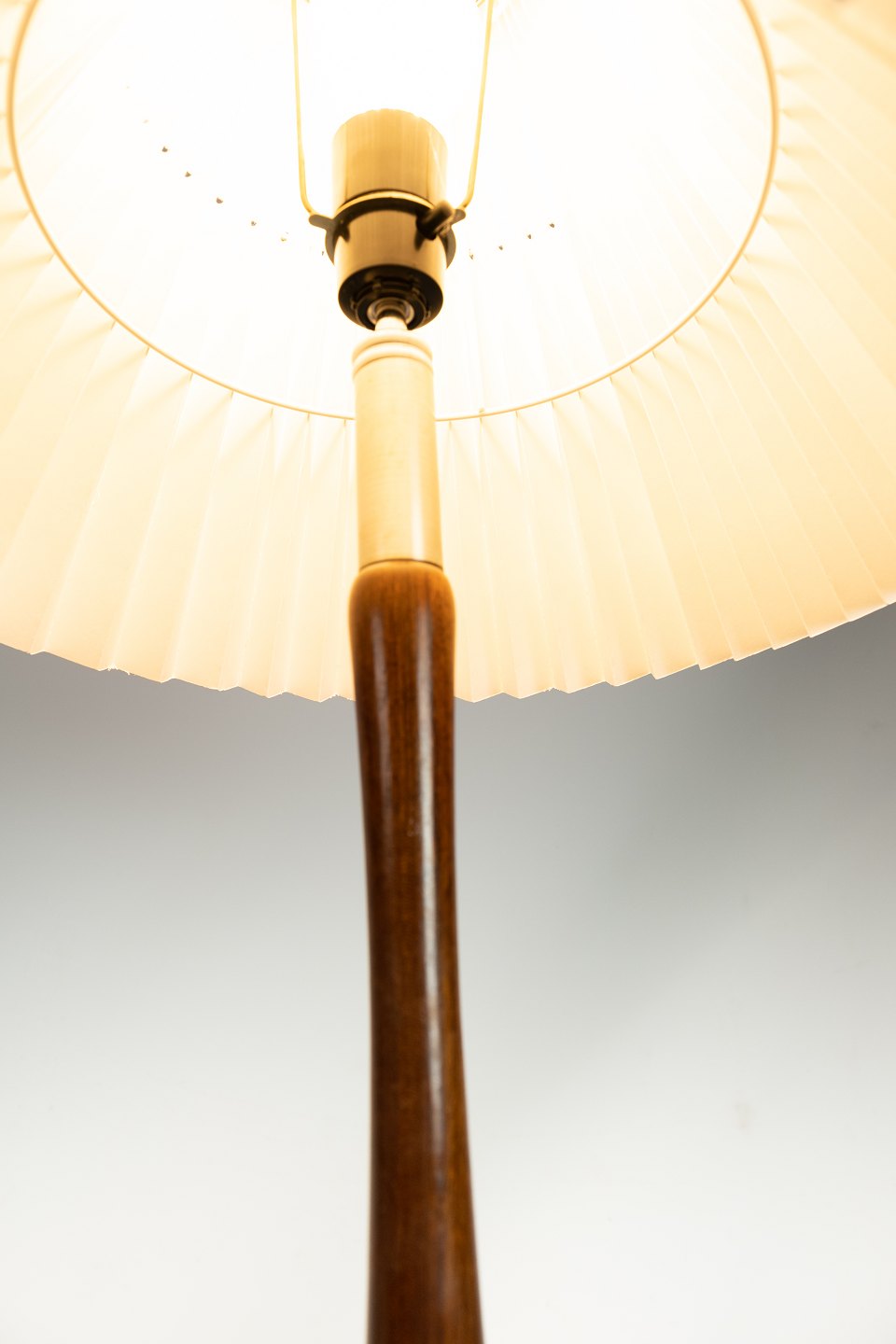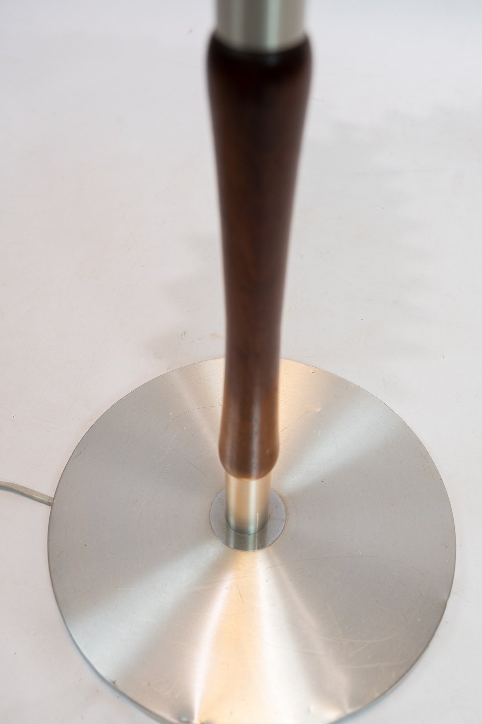 SolgtGulvlampe i palisander og aluminium af dansk design fra 1960erne. Skærmen er håndfoldet og håndmalet i papir.