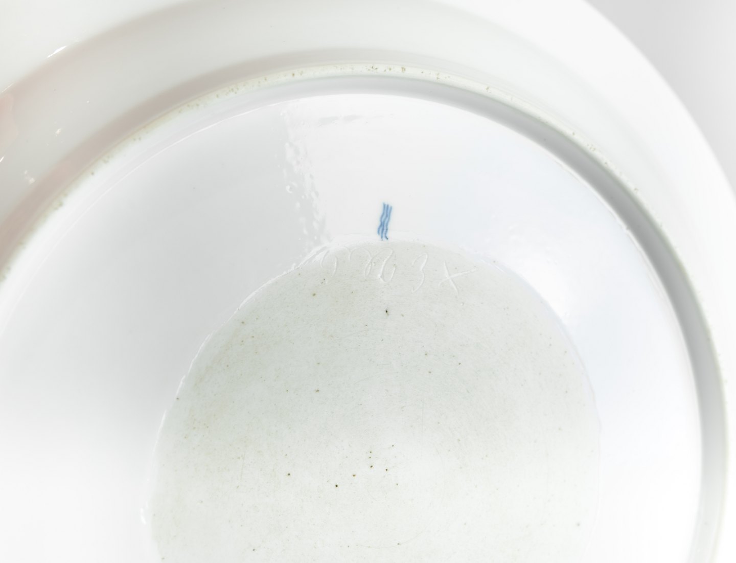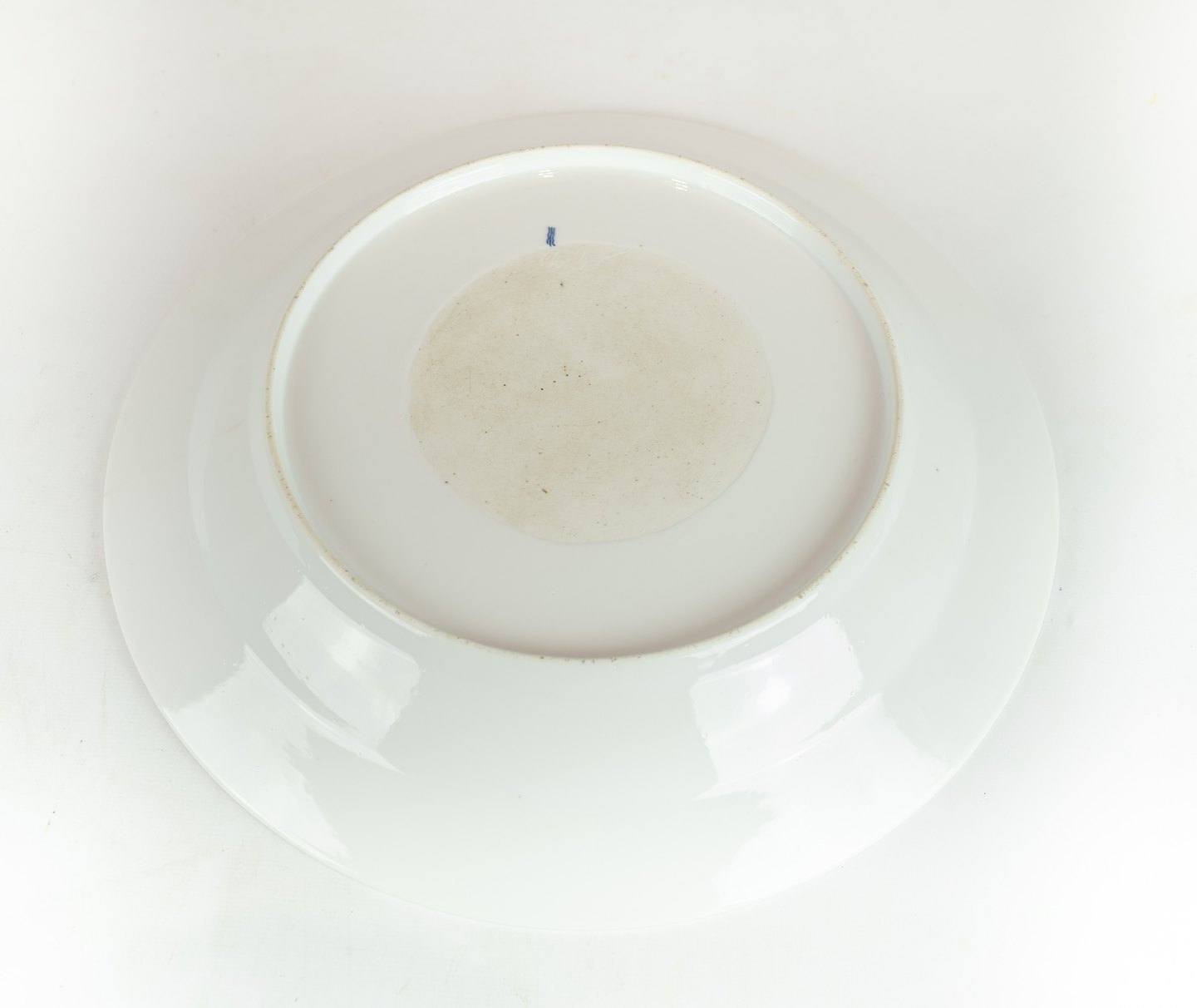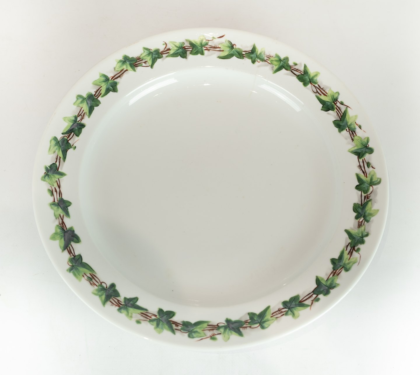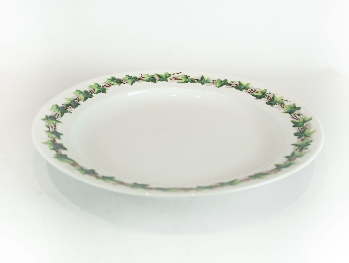 Stort kongeligt porcelænsfad dekoreret med grønne blade.